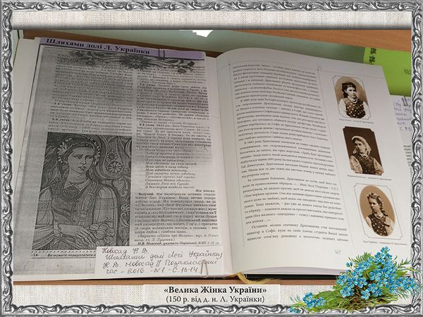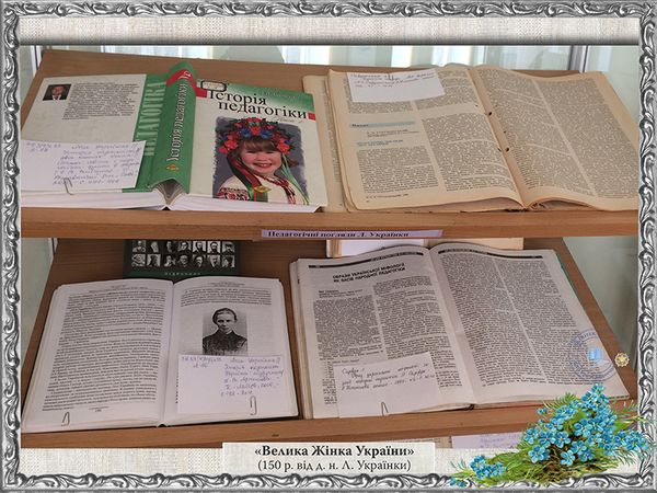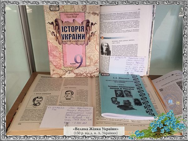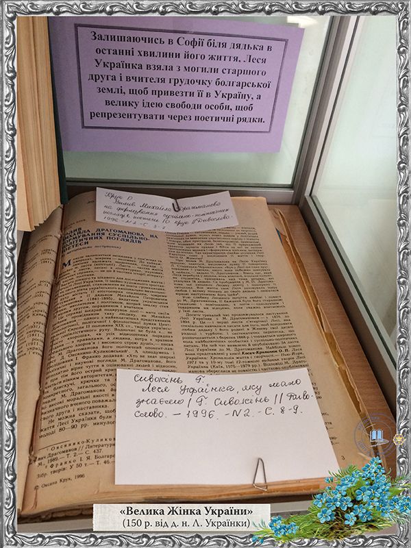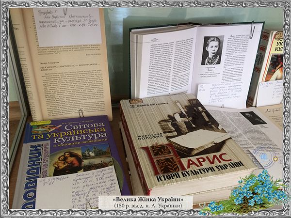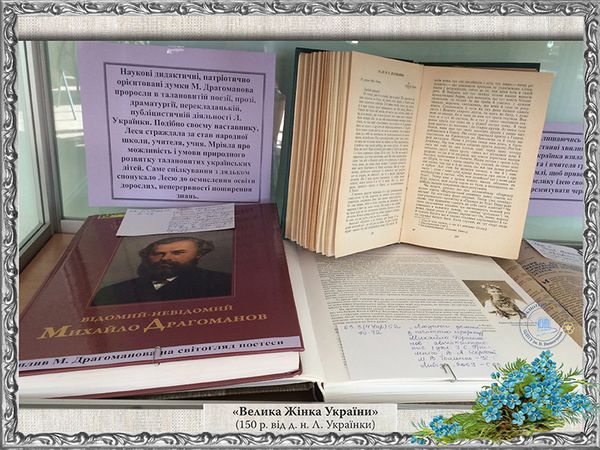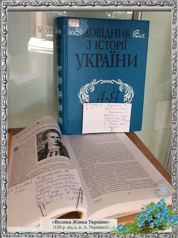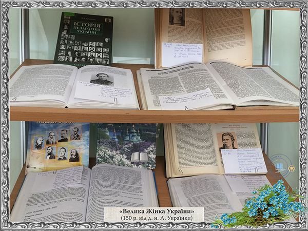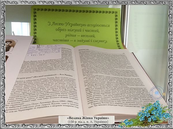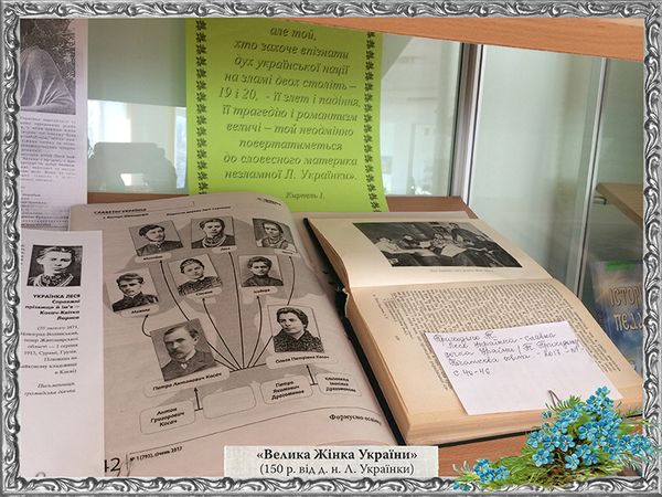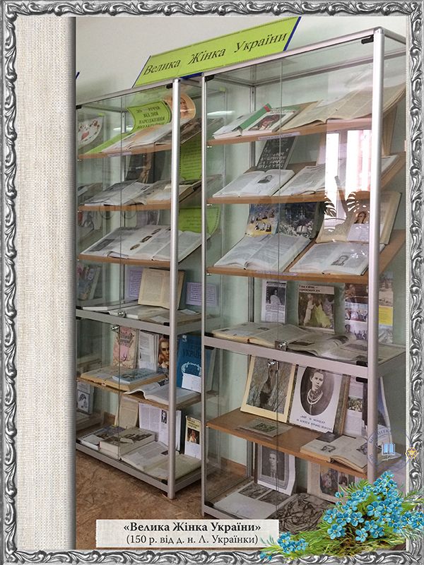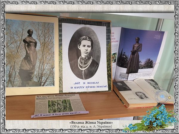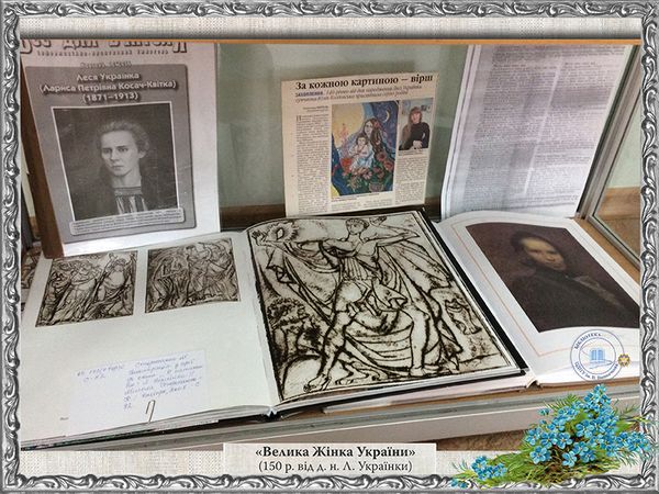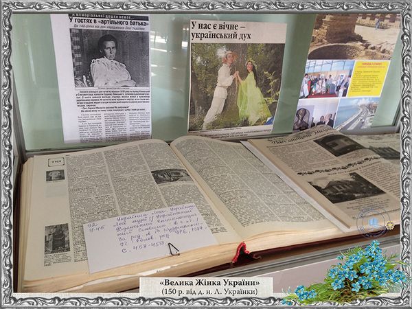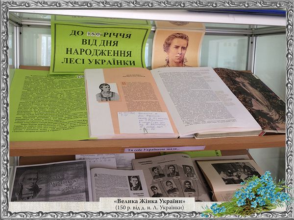 До 150-річчя від дня народження славетної дочки України: поетеси, громадської діячки Лесі Українки універсальний читальний зал презентує книжкову ілюстровану виставку «Велика Жінка України». Матеріали експозиції знайомлять із шляхами долі хворобливої фізично, але сильної духом творчої натури Лариси Косач, відомої під літературним псевдонімом Лесі Українки.