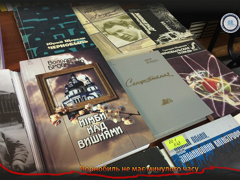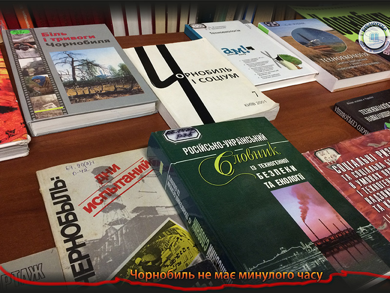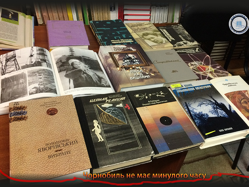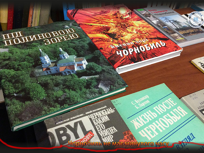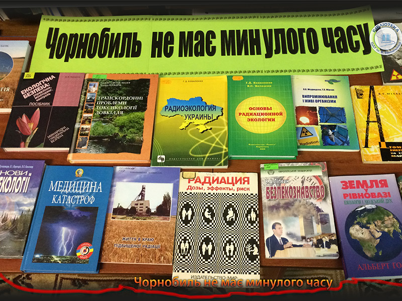 Ця актуальна проблема сьогодення висвітлюється у книжковій виставці бібліотеки «Чорнобиль не має минулого часу». Книги з екології та спогади очевидців відтворюють життя у краю підвищеної радіації, біль і тривоги людські, загострюється увага на трагічних уроках, які людство мало б засвоїти. "Світ не повинен загинути, а атом нехай буде робітником, а не солдатом", - стверджують митці України у своїх художніх творах.