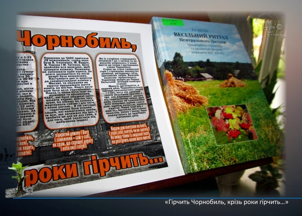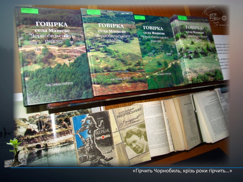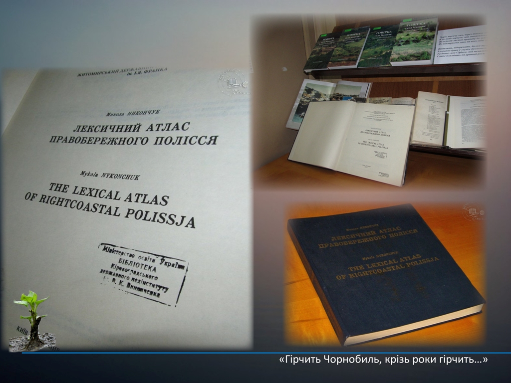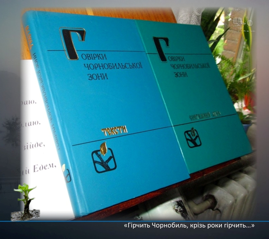 Виставка пропонує користувачам бібліотеки ознайомитись з дослідженнями діалектологічних та етнолінгвістичних експедицій, здійснених відповідно до завдань Державної програми ліквідації наслідків Чорнобильської катастрофи: «Говірки Чорнобильської зони: Тексти», «Говірки Чорнобильської зони: Системний опис»; чотиритомним монографічним описом «Говірка села Машеве Чорнобильського району»; «Лексичним атласом правобережного Полісся» М. Никончука. Представлені матеріали зберігають адекватний мовно-культурний образ втраченої частини Полісся.
