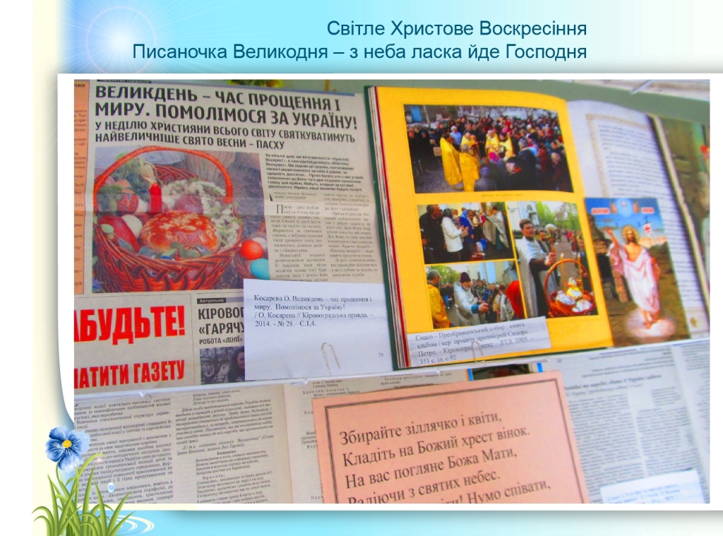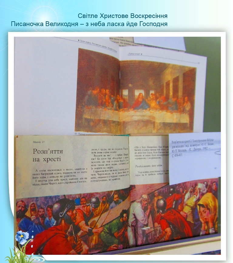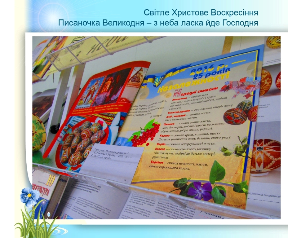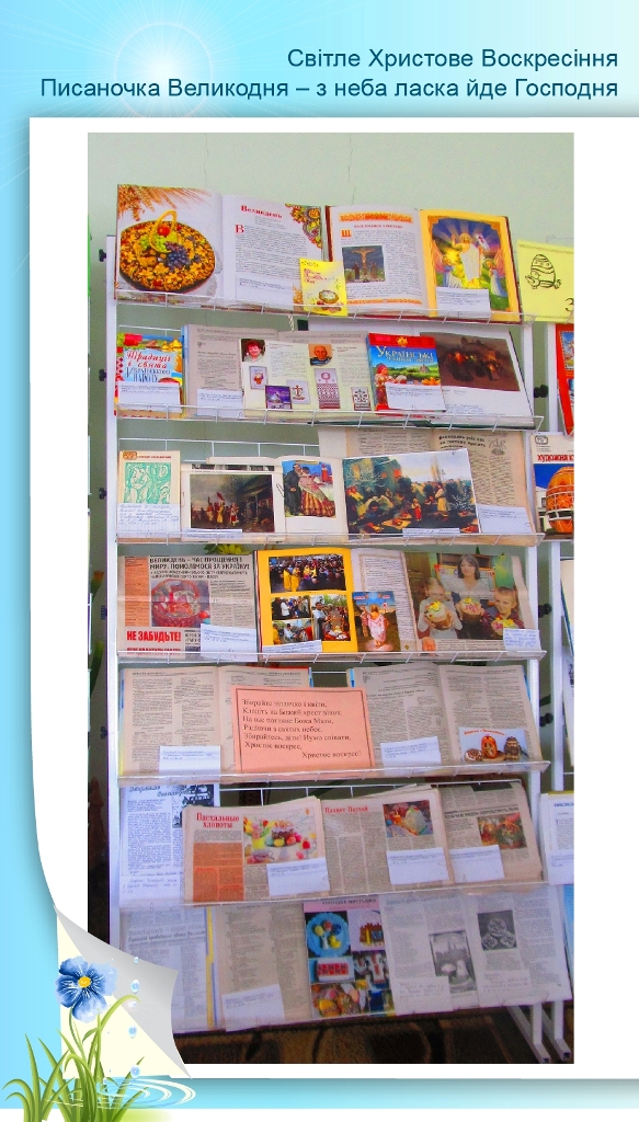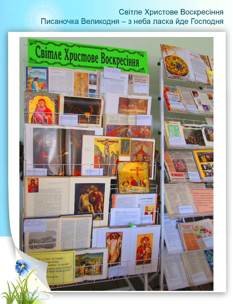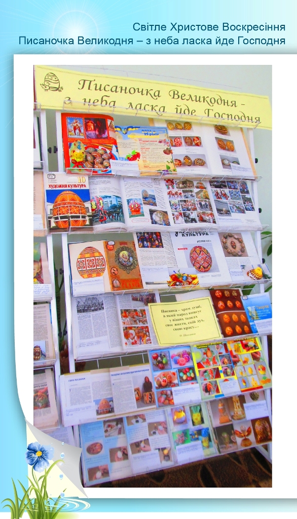 До світлого дня Великодня універсальний читальний зал приурочує виставки: «Світле Христове Воскресіння» та «Писаночка Великодня – з неба ласка йде Господня».