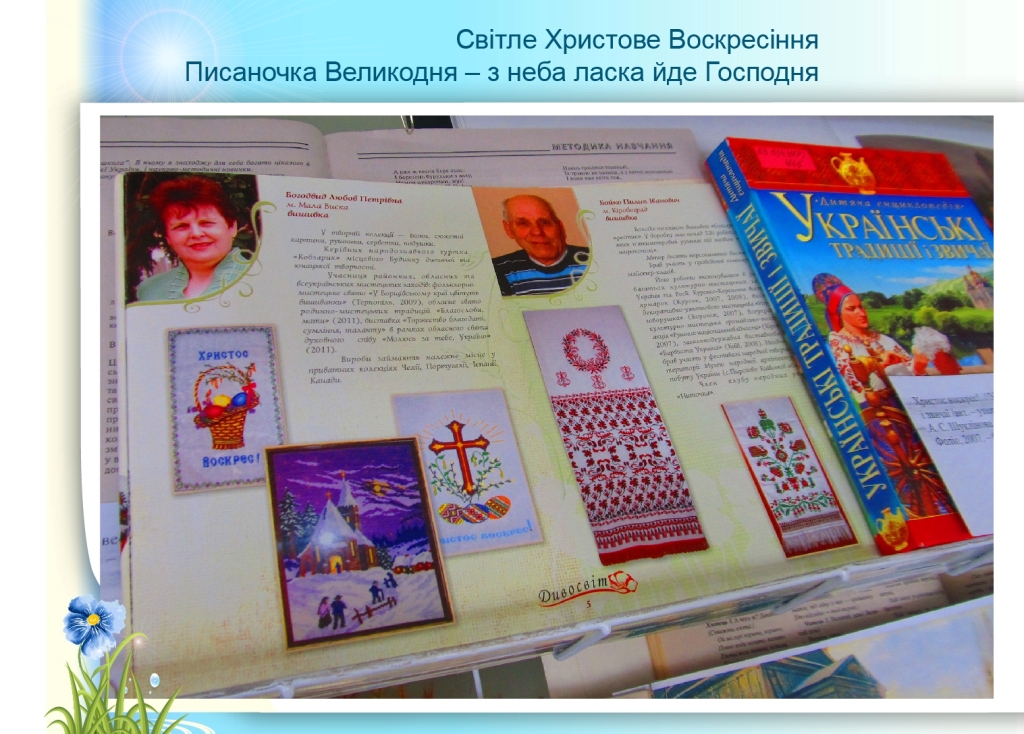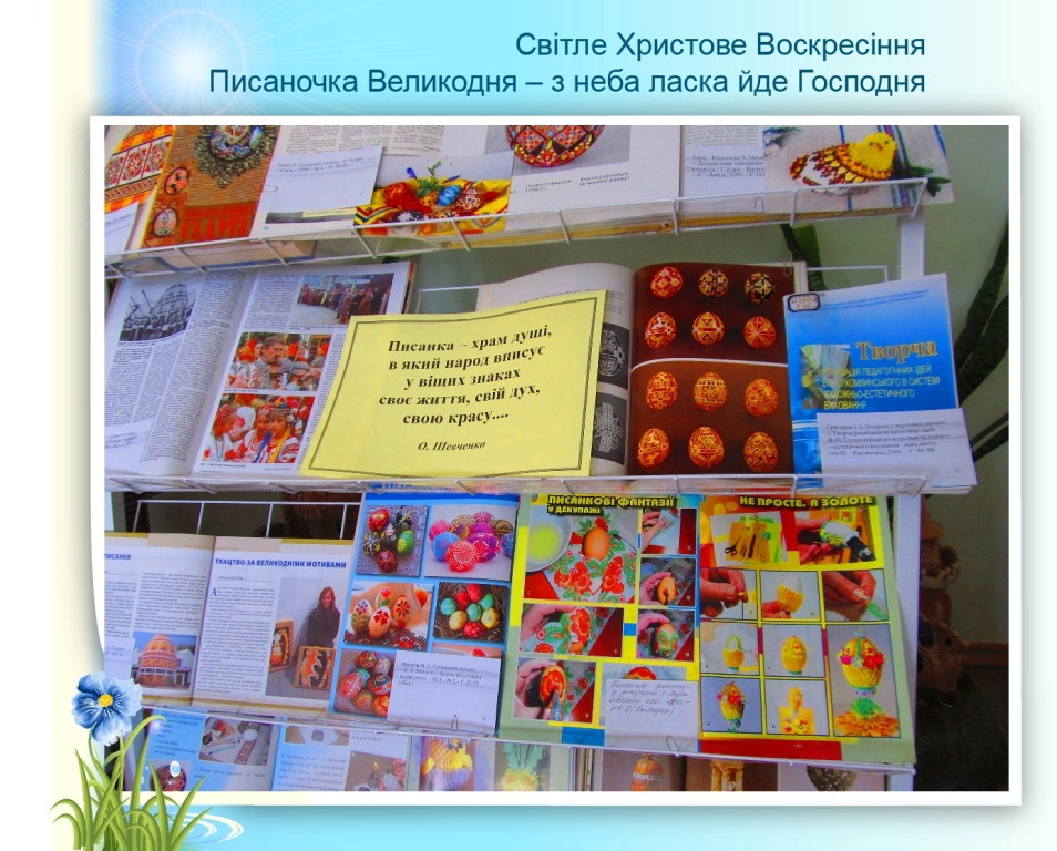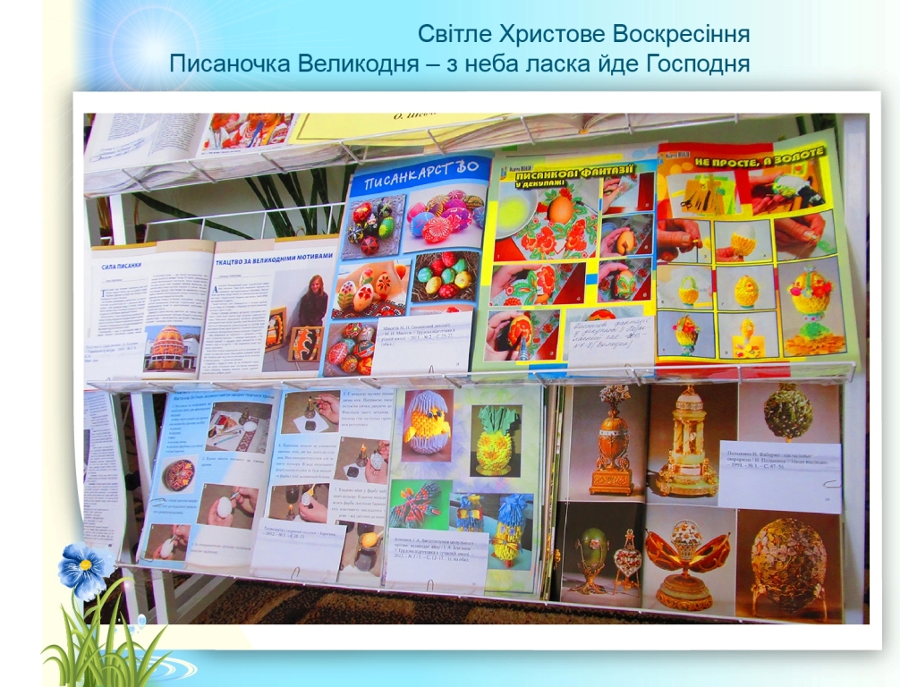 Рубрика «Писаночки Великодньої» знайомить читачів з етнографічними посібниками, періодичними виданнями, які описують народні звичаї святкування Великодня в Україні та Англії. Символ Пасхи – писанка – за словами О. Шевченко – « храм душі, в який народ вкладає у віщих знаках своє життя, свій дух, свою красу...» Відтворені писанкові фантазії у декулажі, у вигляді зелених галявин, візерункового плетіння, розфарбовані дивовижними орнаментами, прикрашені бісером, виготовлені з кольорового паперу, вишиті на рушниках.