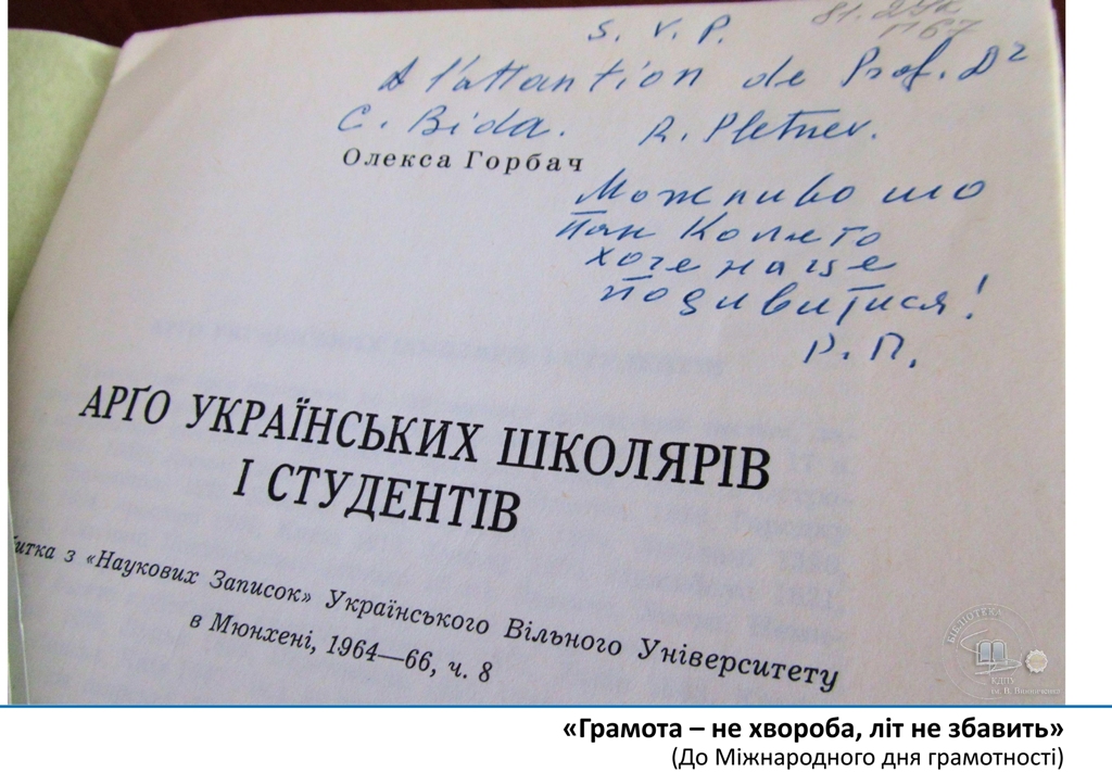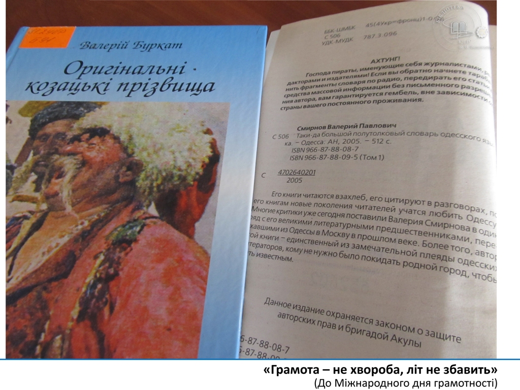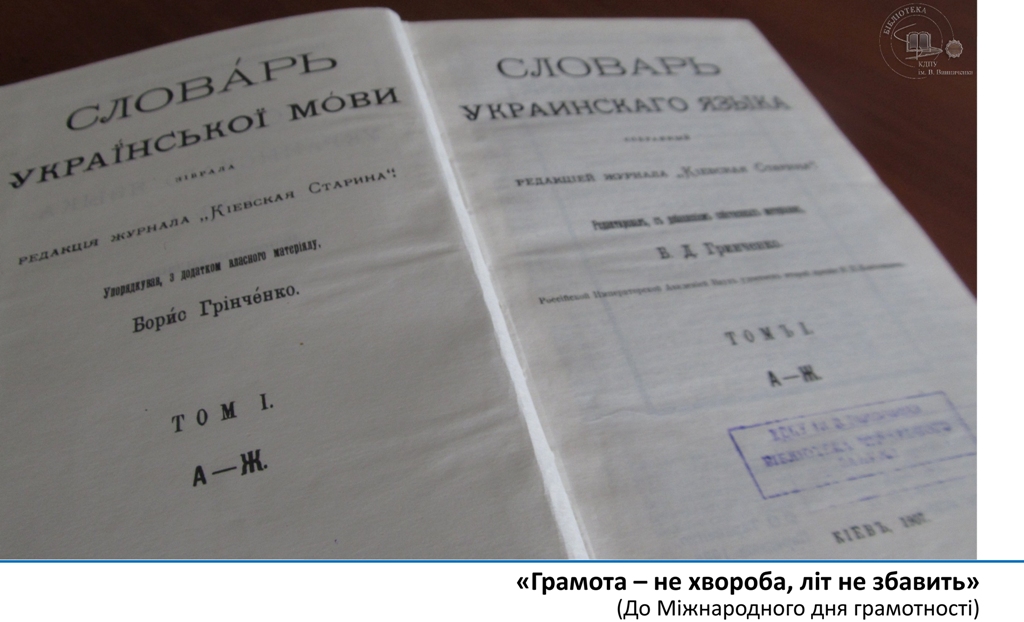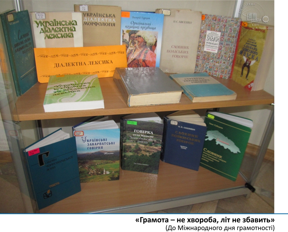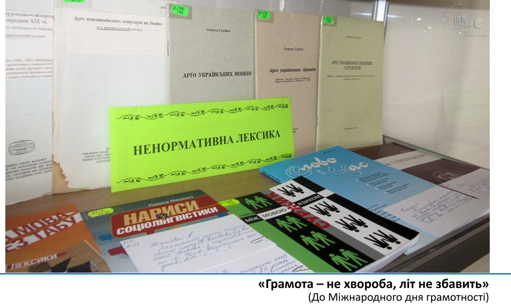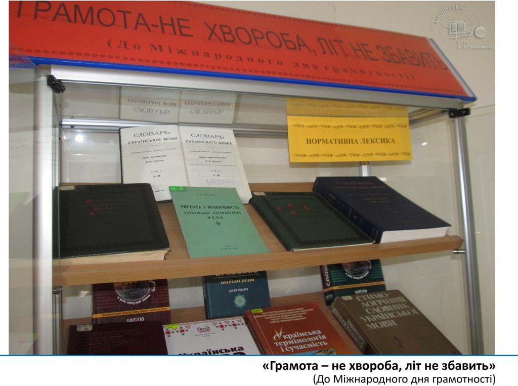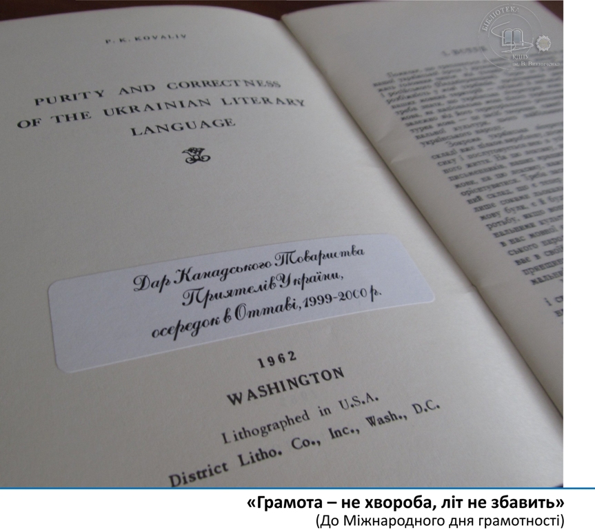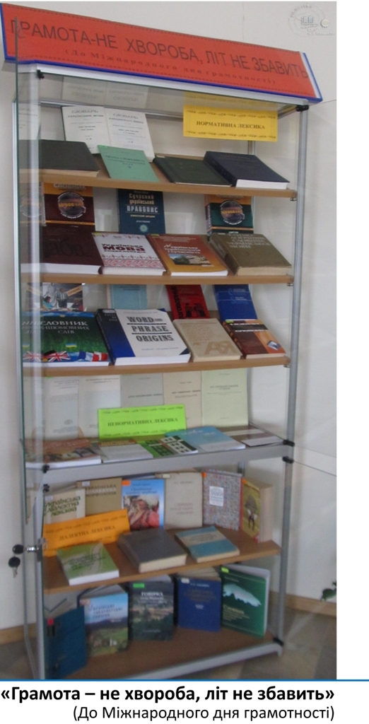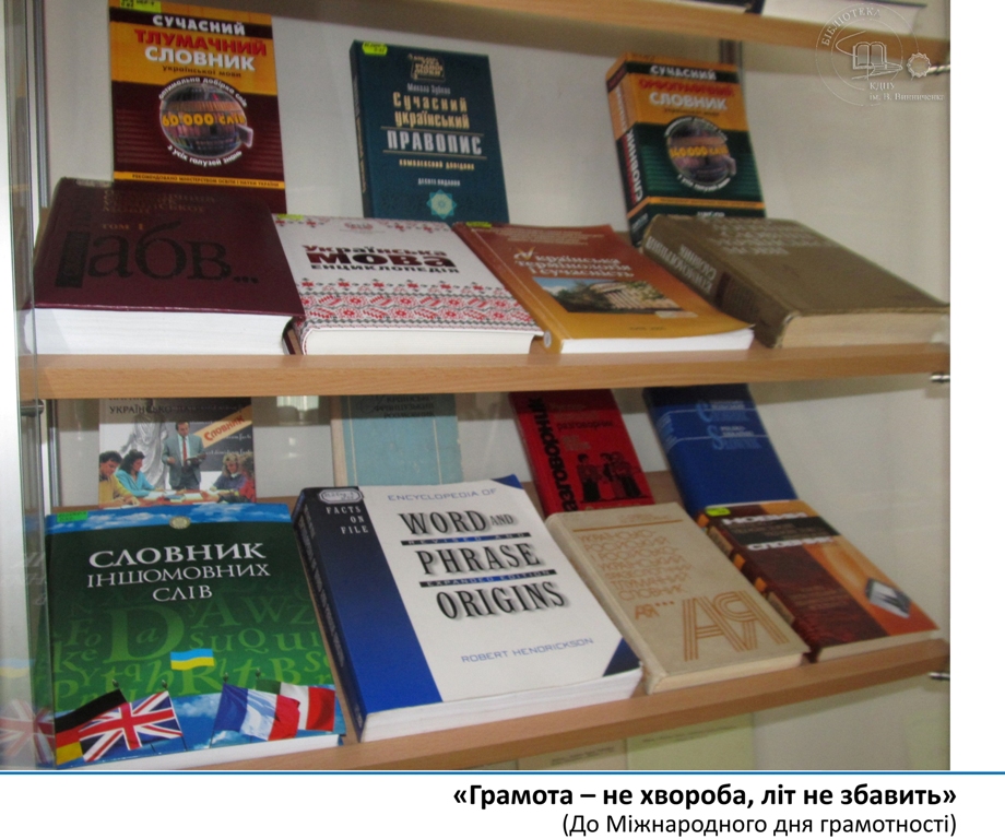 Книжкову виставку, яка пропонується до уваги користувачів у читальному залі філологічних дисциплін, присвячено Міжнародному дню грамотності. Це свято офіційно відзначається 8 вересня Організацією Об’єднаних Націй. Грамотність — це символ досягнень усього людства, це один із критеріїв, який відрізняє прогресивне суспільство від примітивного. На сьогоднішній день, за даними ООН, у світі налічується близько 4 мільярдів грамотних людей, хоча представникам різних поколінь ще є до чого прагнути.