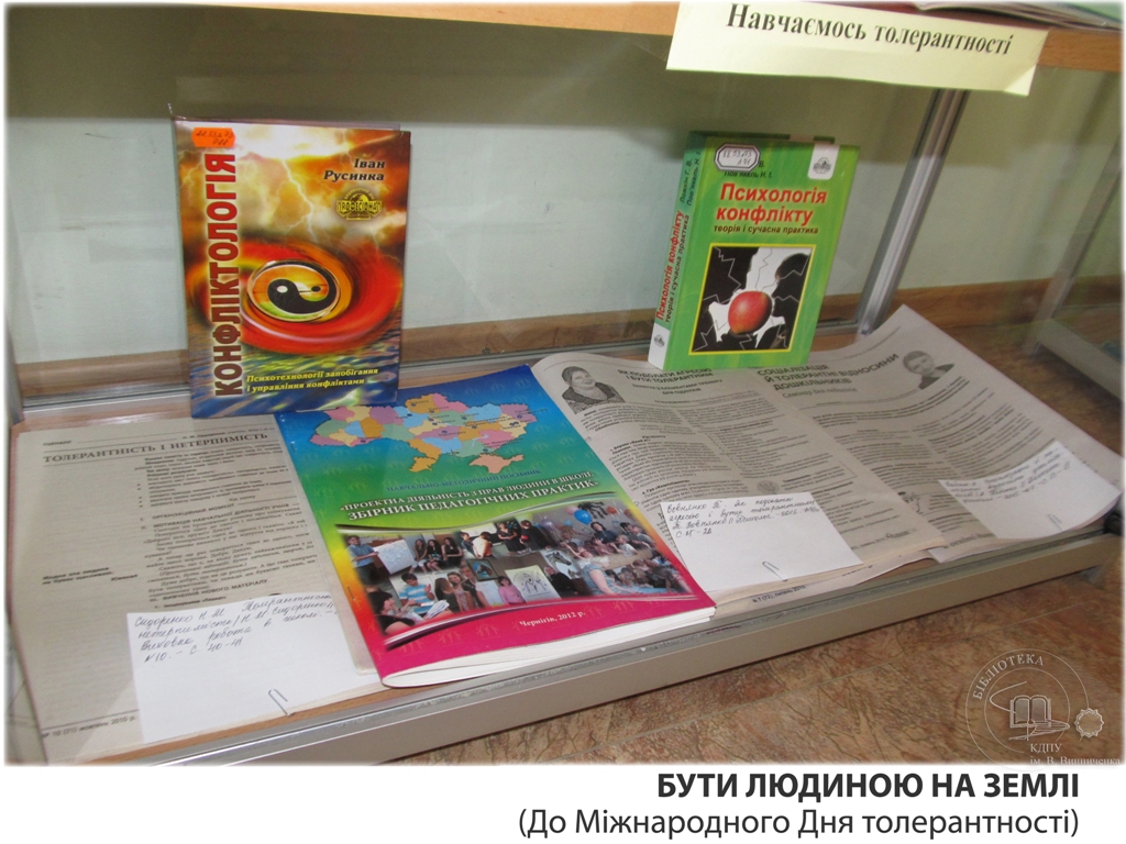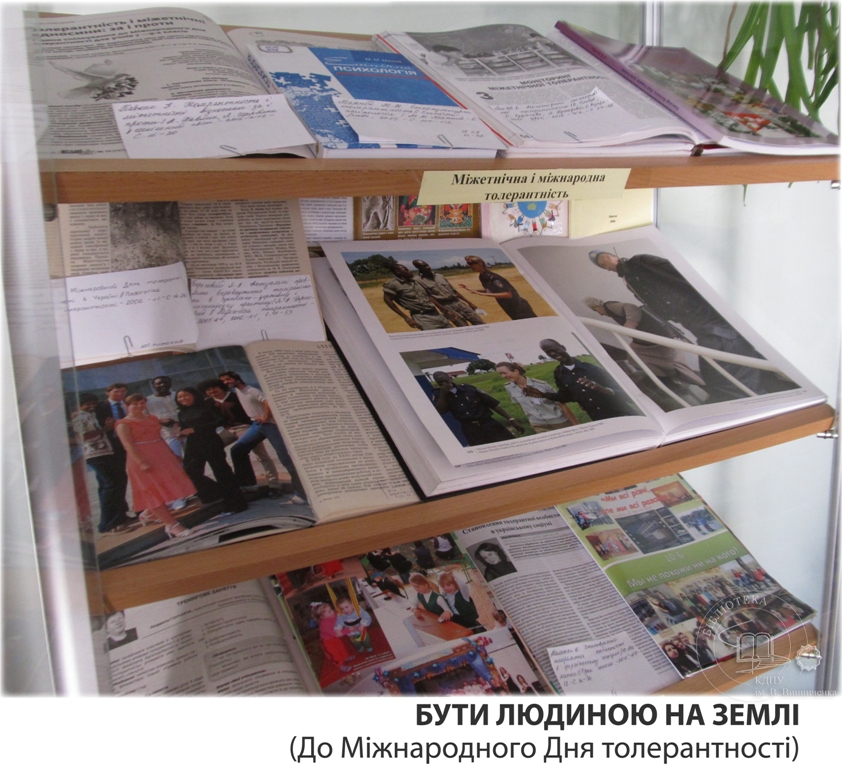 До Міжнародного Дня толерантності, який відзначається 16 листопада, в універсальному читальному залі експонується виставка «Бути людиною на землі». Проблема розвитку духовності, зокрема толерантного ставлення до людини, до свого оточення в наш час стала злободенною. Виставка познайомить читача з історією виникнення цього свята. З представленої літератури можна дізнатись про значення даного поняття, роль толерантності в житті людей, як навчити дитину доброзичливого і поважного ставлення до інших.