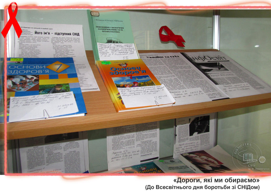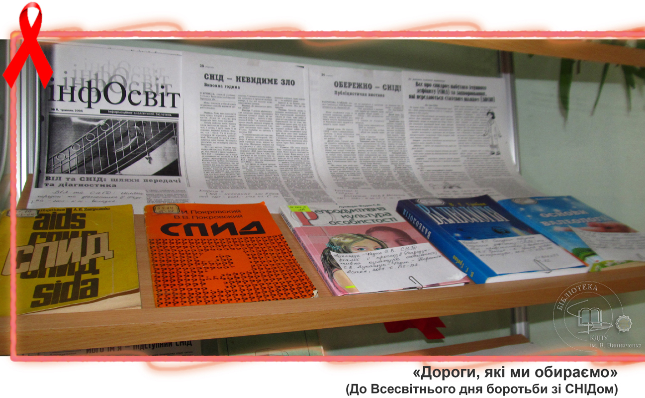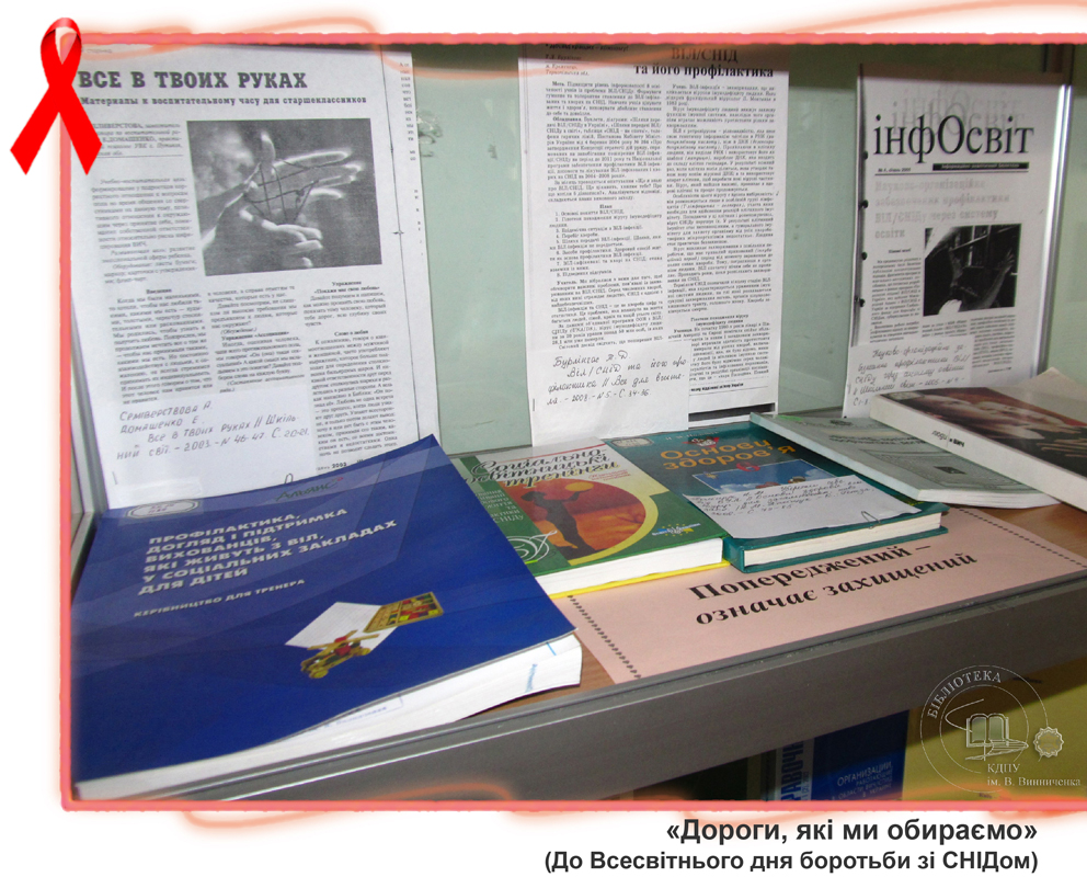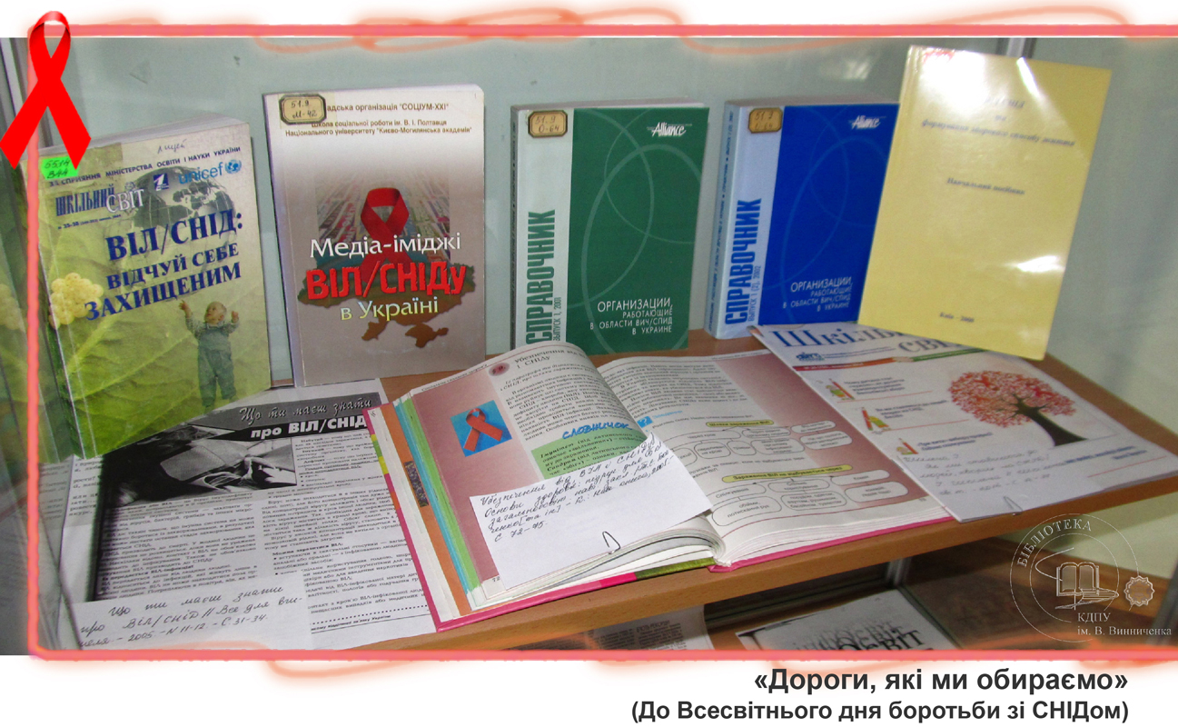 До Всесвітнього дня боротьби зі СНІДом бібліотекарі універсального читального залу підготували виставку «Дороги, які ми обираємо». Вона ознайомить студентів з історією виникнення вірусу, шляхами його передачі, небезпекою, яку він створює для життя та здоров’я та профілактикою цього інфекційного захворювання. Також представлена література розповідає про становище з епідемією СНІДу в Україні, підводить читачів до розуміння важливості правильного життєвого вибору, націлює на толерантне ставлення до людей, які живуть зі СНІДом.