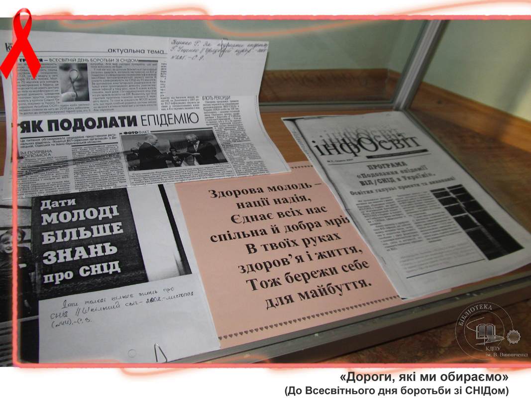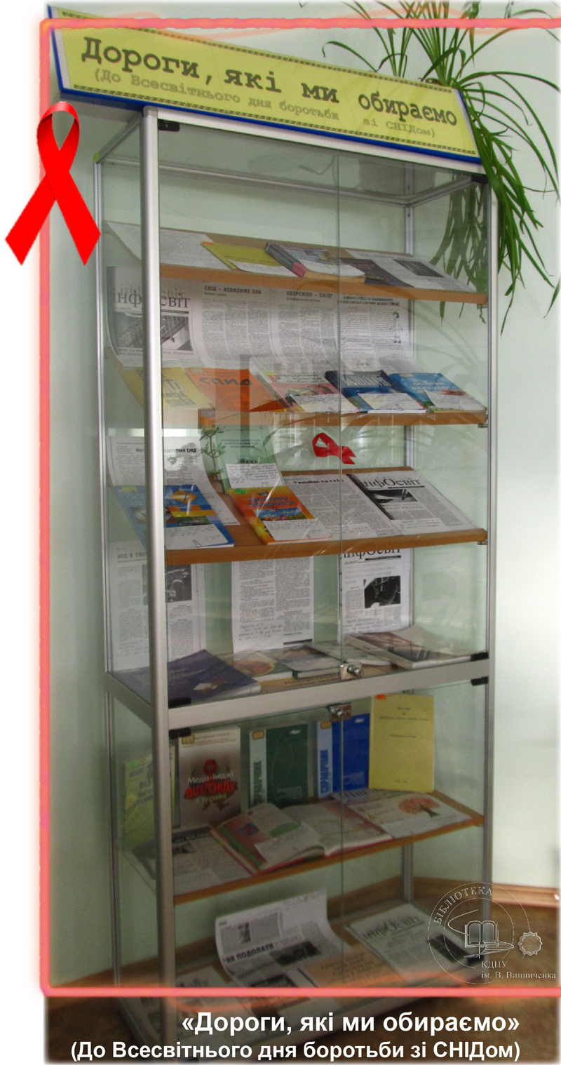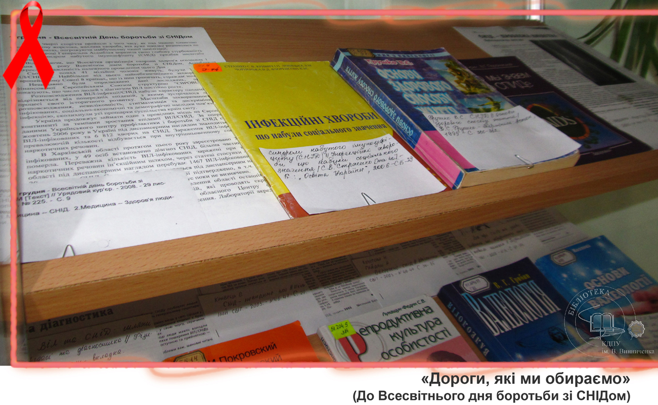 До Всесвітнього дня боротьби зі СНІДом бібліотекарі універсального читального залу підготували виставку «Дороги, які ми обираємо». Вона ознайомить студентів з історією виникнення вірусу, шляхами його передачі, небезпекою, яку він створює для життя та здоров’я та профілактикою цього інфекційного захворювання. Також представлена література розповідає про становище з епідемією СНІДу в Україні, підводить читачів до розуміння важливості правильного життєвого вибору, націлює на толерантне ставлення до людей, які живуть зі СНІДом.