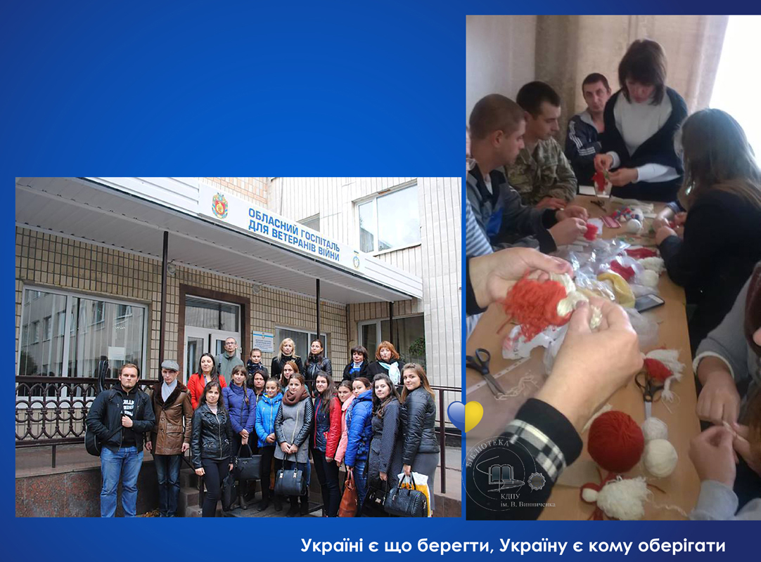 Часточку тепла сердець отримали і поранені бійці військового шпиталю. З цією метою у співпраці студентів факультету історії та права, бібліотекарів, викладачів кафедри трудового навчання і ліцею побутового обслуговування був проведені майстер-класи із виготовлення національних оберегів та сувенірів. Величезний заряд позитивних емоцій отримали як військові, так і молодь, обмінявшись власноручними виробами, які стали для кожного символом віри в краще майбутнє нашої держави.