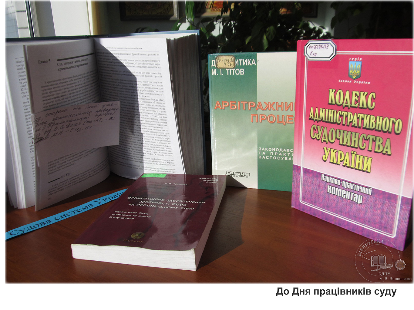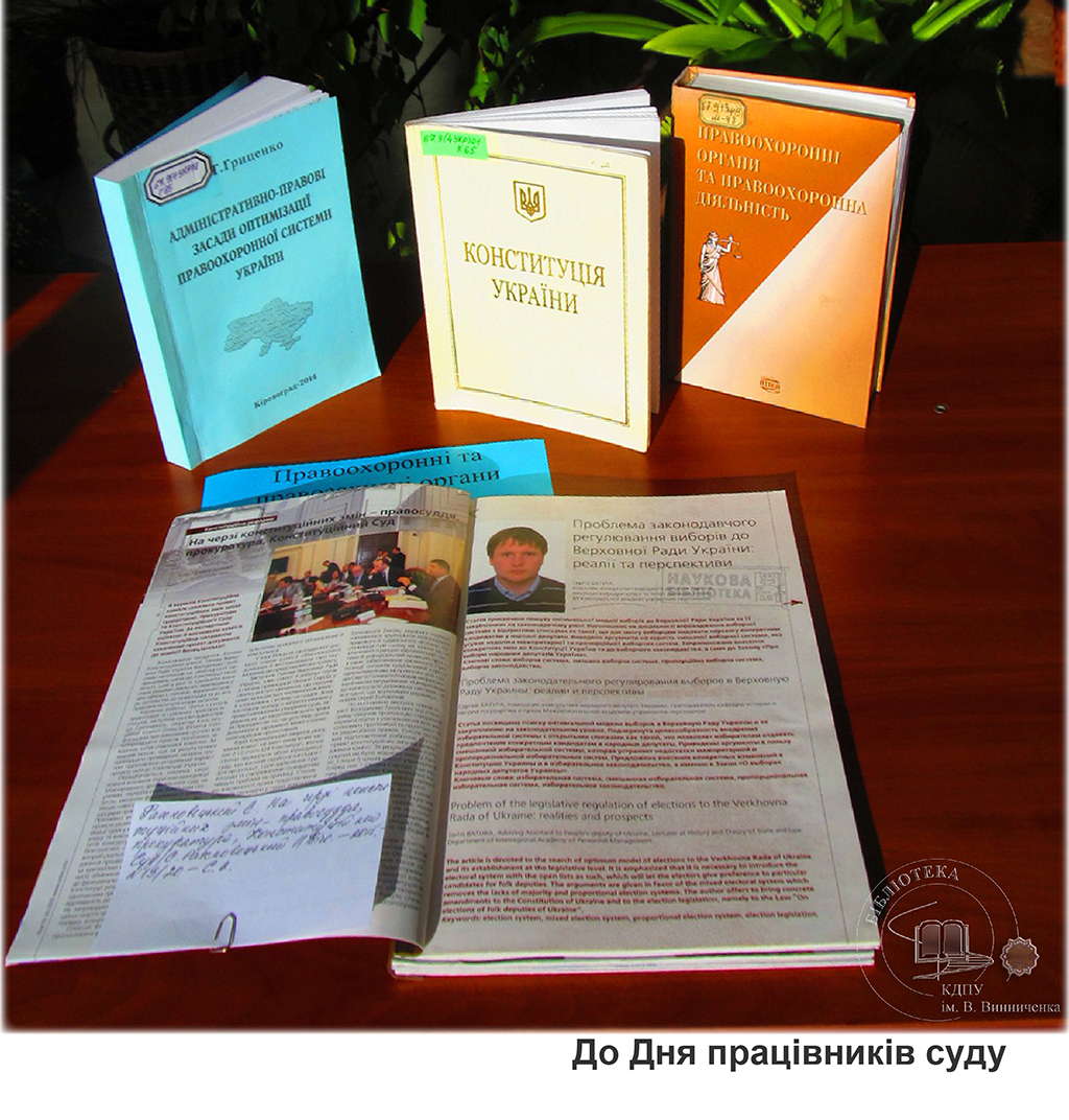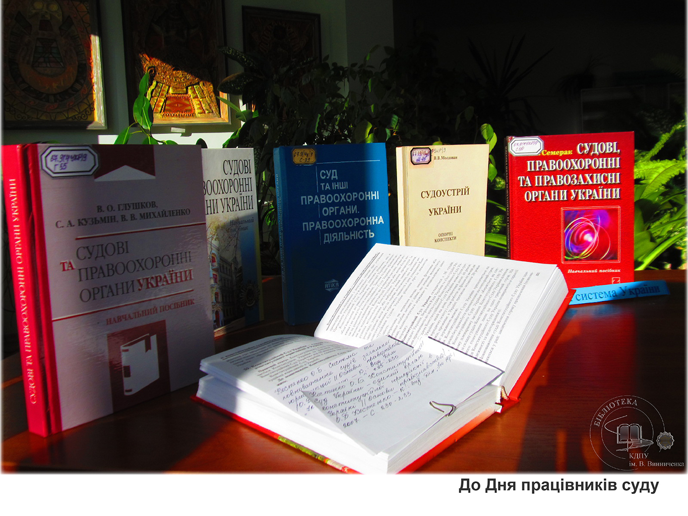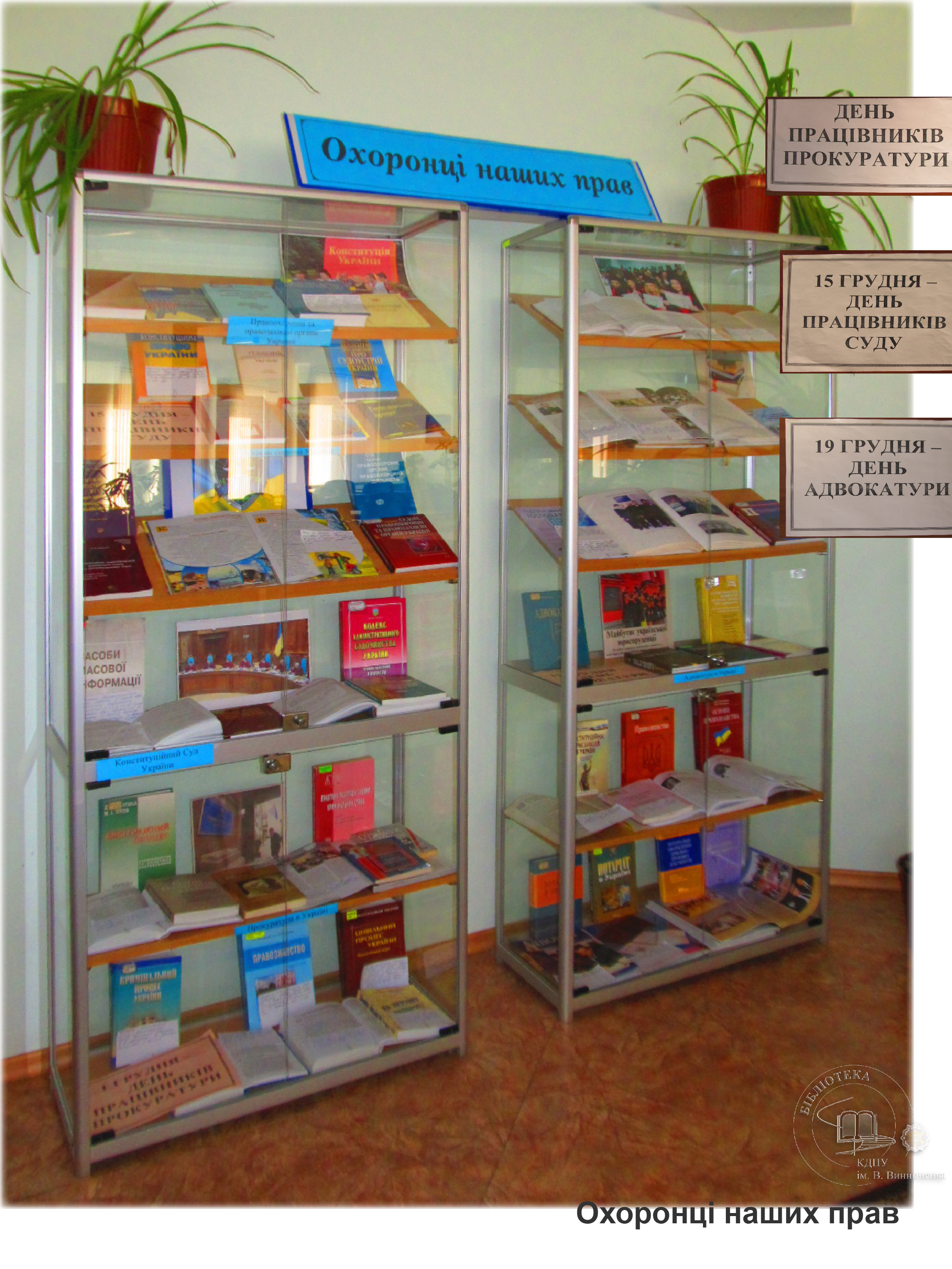 Вітаємо правознавців зі святами! Правоохоронні органи України щорічно в грудні відзначають свої професійні свята: День працівників суду, прокуратури, адвокатури.Бібліотекарі універсального читального залу з нагоди цих свят презентували виставку «Охоронці наших прав». Юридична література і періодичні видання розкривають компетенцію, повноваження та структуру основних правоохоронних органів України, знайомлять з конституційними змінами у цій галузі.