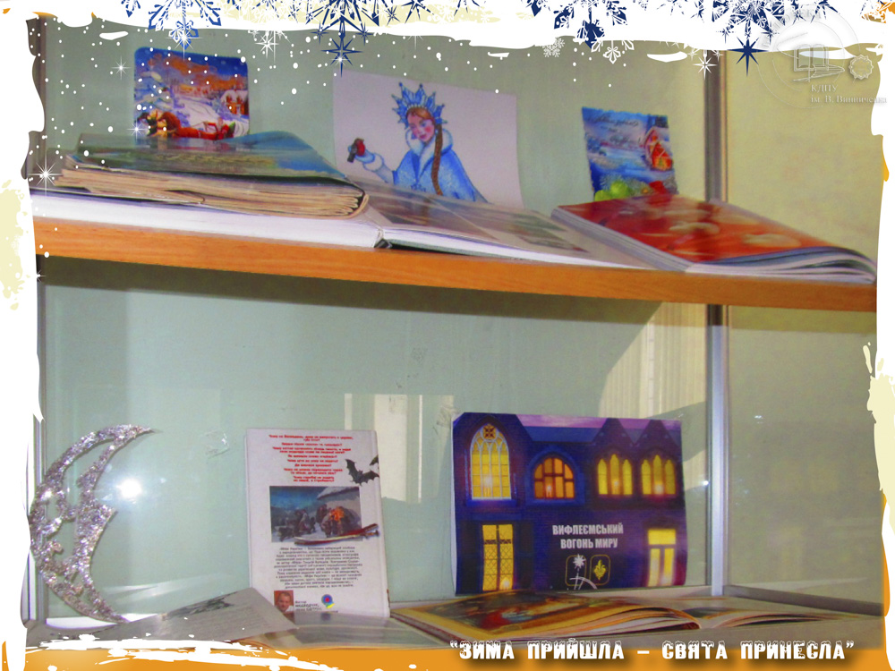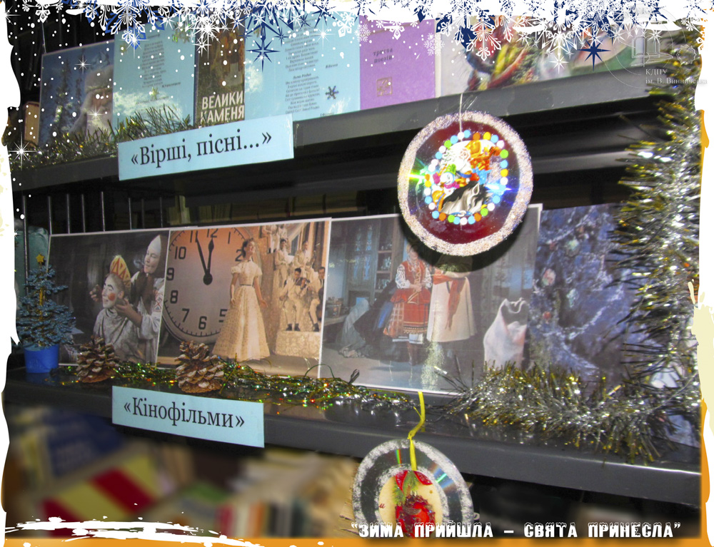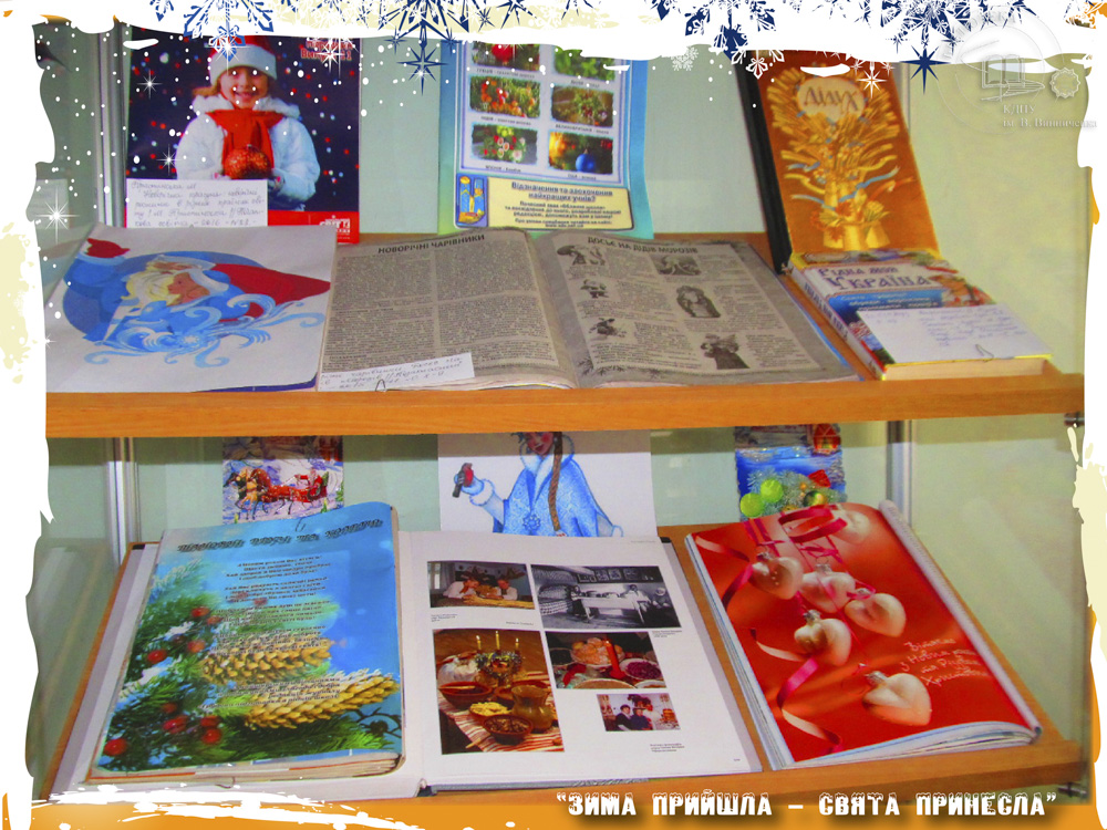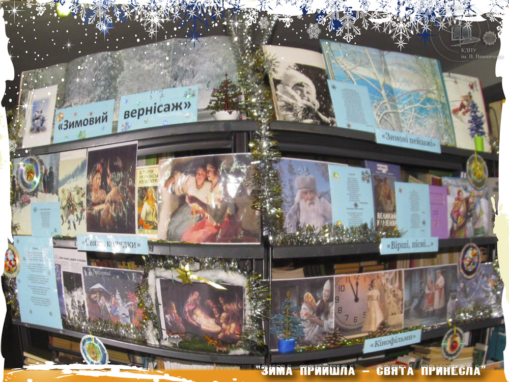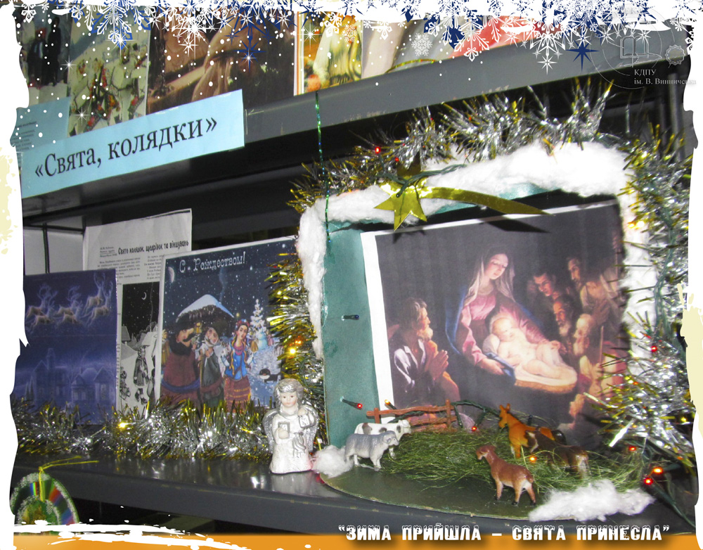 Зима-чарівниця вкрила білим килимом землю, посріблила дивовижними візерунками дерева. Пухнастими дзвінкими сніжинками переливається повітря, насичене ароматом хвої та мандарин. Радісні, заклопотані обличчя дорослих та дітей свідчать про прихід грудневих свят та наближення Нового року. Завітали свята і в бібліотеку КДПУ ім. В. Винниченка. У читальних залах, на абонементах та в довідково-інформаційній залі панує передноворічна атмосфера, яку навівають прикраси, виготовлені руками бібліотекарів. Це і гірлянди, і, як жива, змійка із серпантину, це і добротна бабуся-сніговиця, і паморозь казкова на склі. А яке свято без ялинки?! Їй була приділена особлива увага: проведений парад лісових красунь – від найдрібнішої до основної господарки свята. Доповнюють передноворічний настрій і мотиви щедрівок, які лунають під час репетицій молоді.