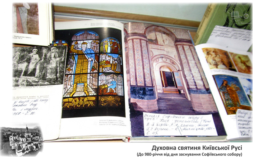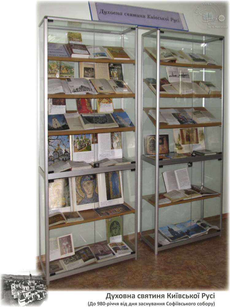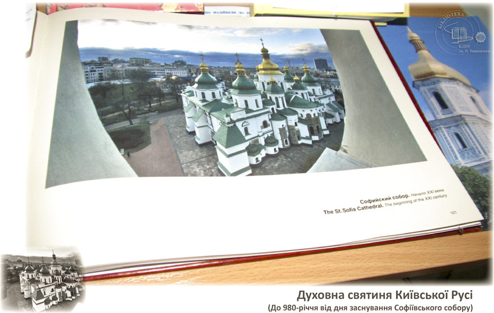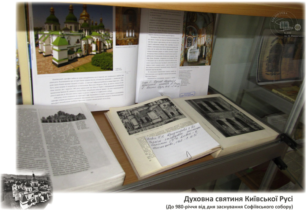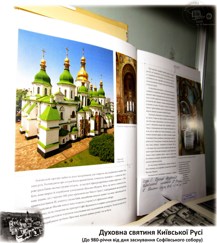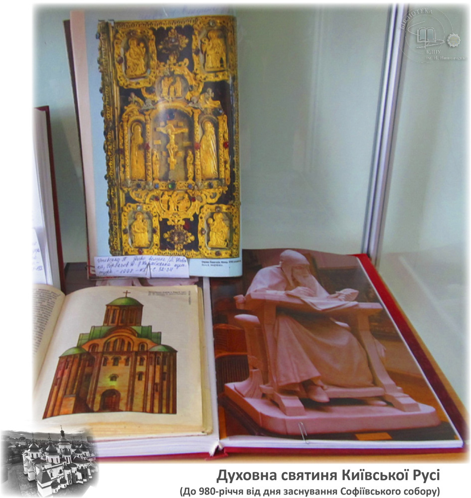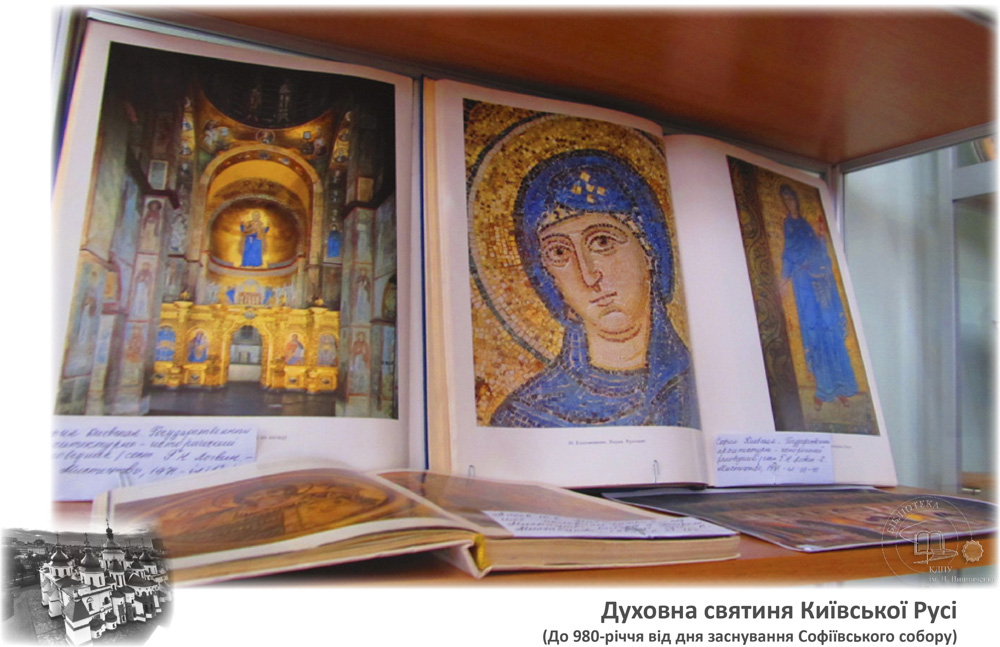Київ...Він був столицею Київської Русі і продовжує свою історію, як столиця незалежної України. За своє 1535- річне існування, місто втратило багато пам’ятників архітектури і культури та, на щастя, до наших днів зберігся Софіївський собор – одна з найвидатніших споруд Княжої доби. Споруджений у 1037 році на місці перемоги над печенігами, він був задуманий, як головний християнський храм Давньої Русі. У 2017 році виповнюється 980 років від часу спорудження собору і заснування при ньому Ярославом Мудрим першої бібліотеки. Бібліотекарі підготували цікаву і яскраву виставку до цього ювілею під назвою «Духовна святиня Київської Русі».