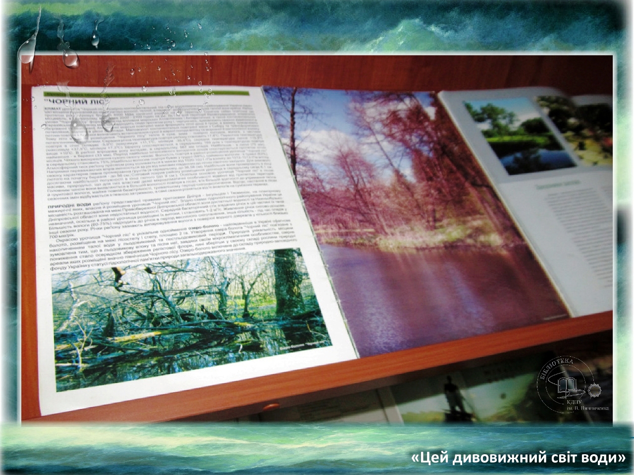 З книг, представлених на виставці, читач почерпне для себе різноманітну інформацію про надмірне споживання, забруднення і зменшення планетарних запасів прісної води, про походження і значення води, про екологічні, економічні, політичні, демографічні проблеми, породжені глобальною водною кризою, про загальний стан водоспоживання, водокористування й водного забезпечення в Україні.