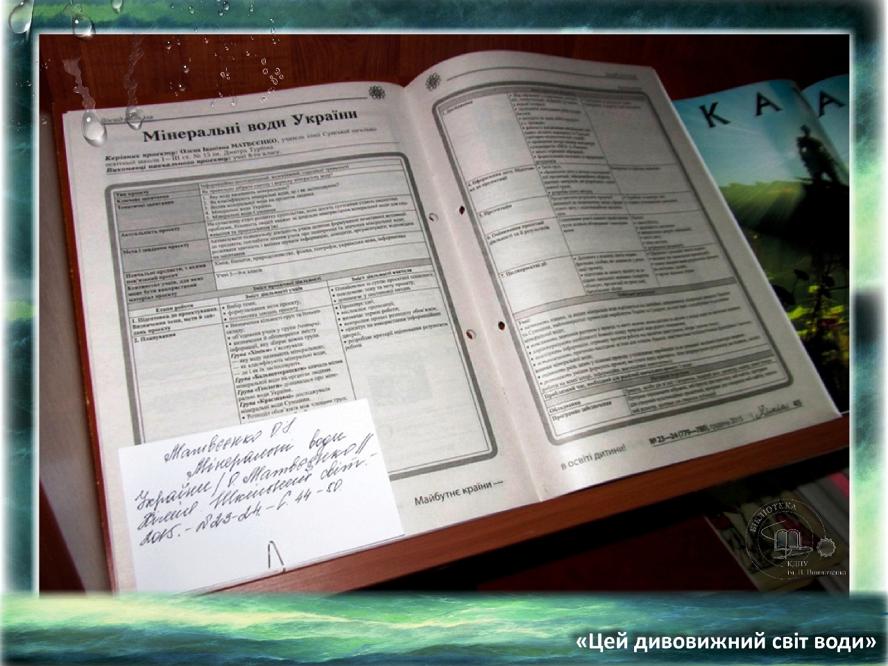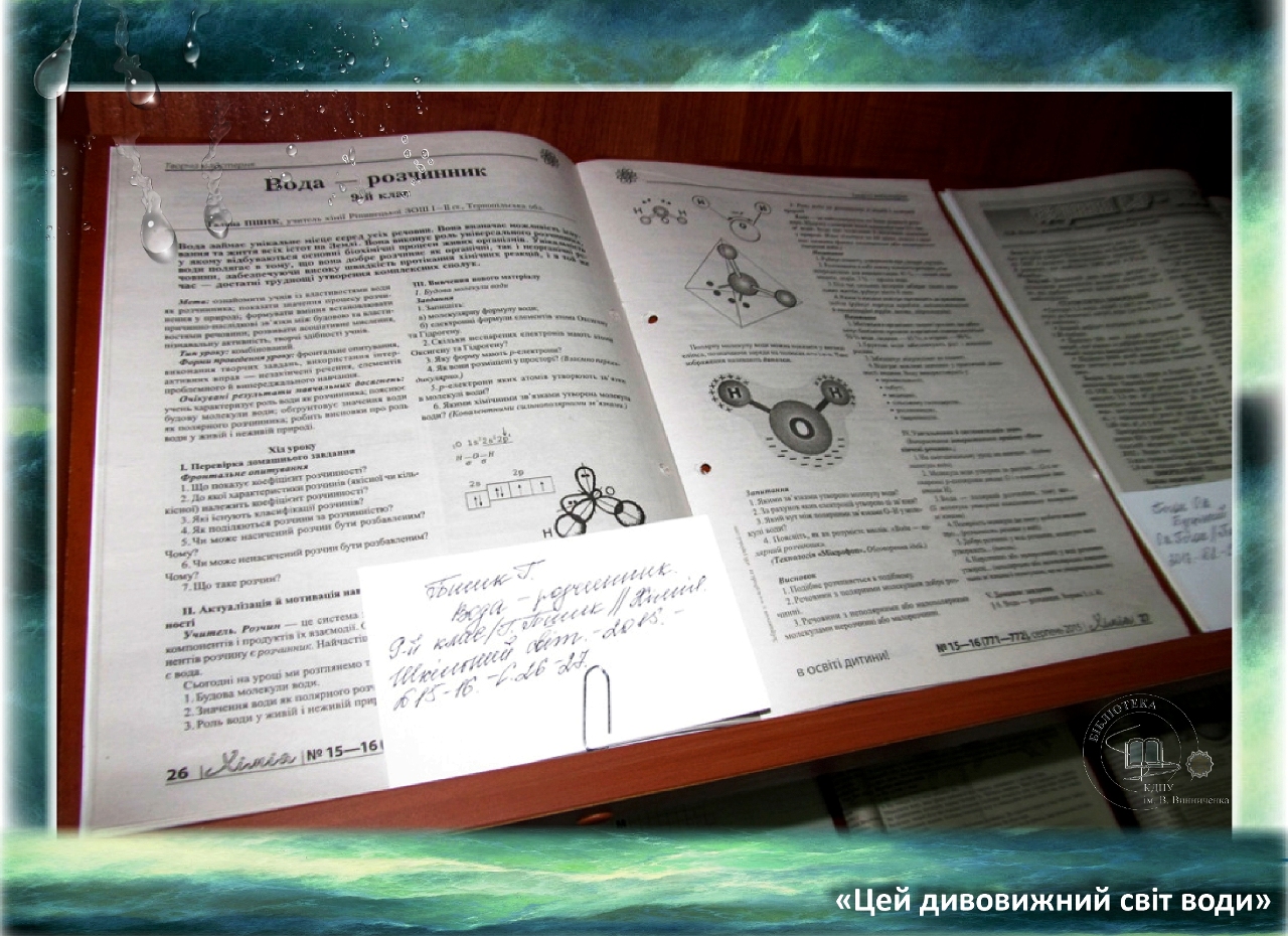 У книгах «Чудесный мир воды», «Самое необыкновенное вещество», «Вода - чудо природи» зібрано інформацію про фізичні та хімічні властивості води, про деякі загадкові її властивості,а також про річки, моря, лід, водоспади, термальні води і т. д.