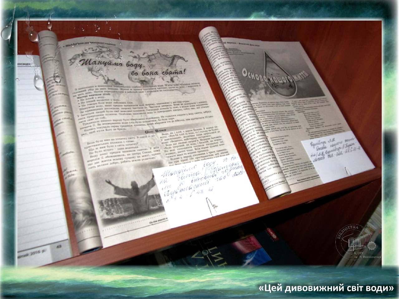Запрошуємо всіх бажаючих до перегляду виставки. У читальному залі бібліотеки природничо-географічного факультету до Всесвітнього дня води (22 березня) увазі читачів представлена виставка «Цей дивовижний світ води». Вода - найбільше багатство світу, вона необхідна для життя і є самим життям. Проблема води належить до найголовніших соціальних і науково - технічних проблем сучасності.