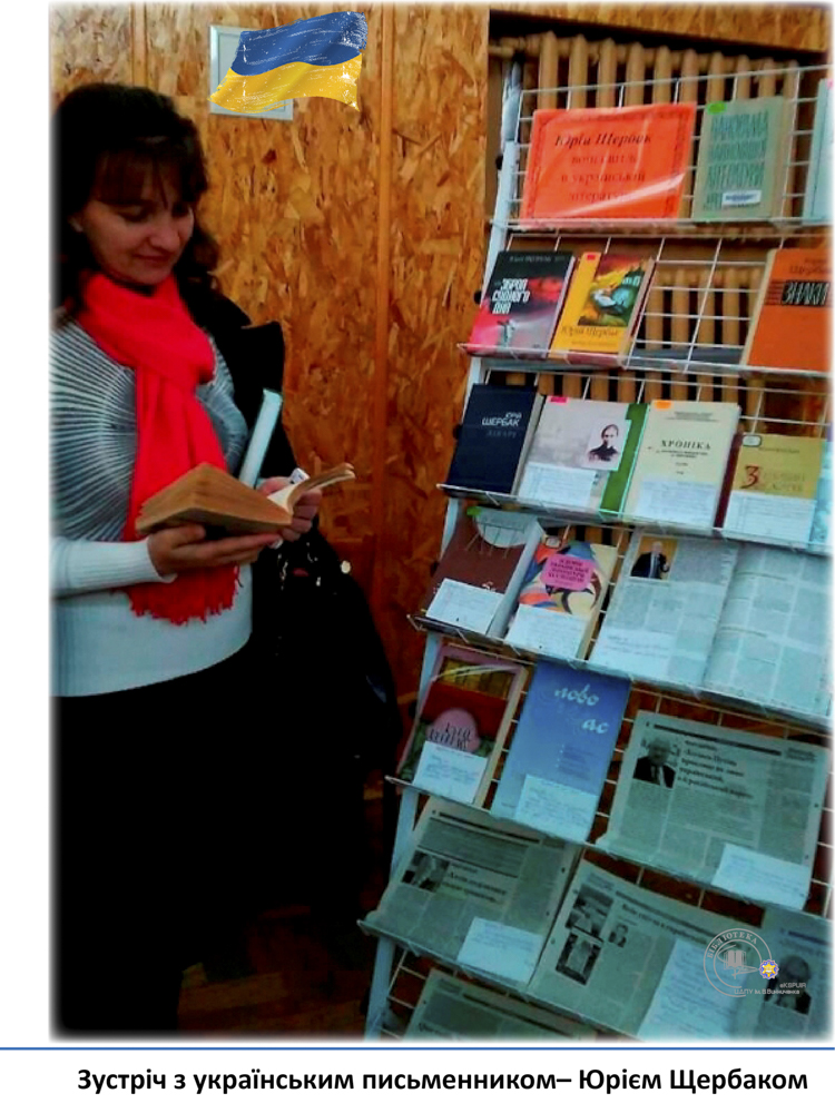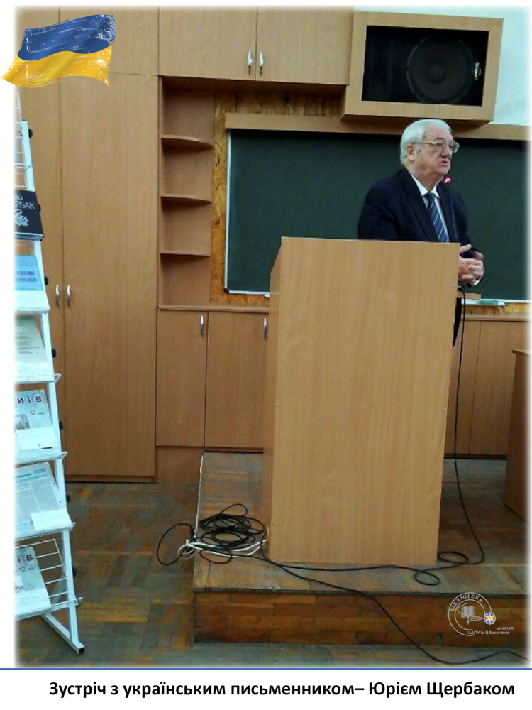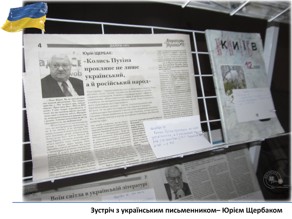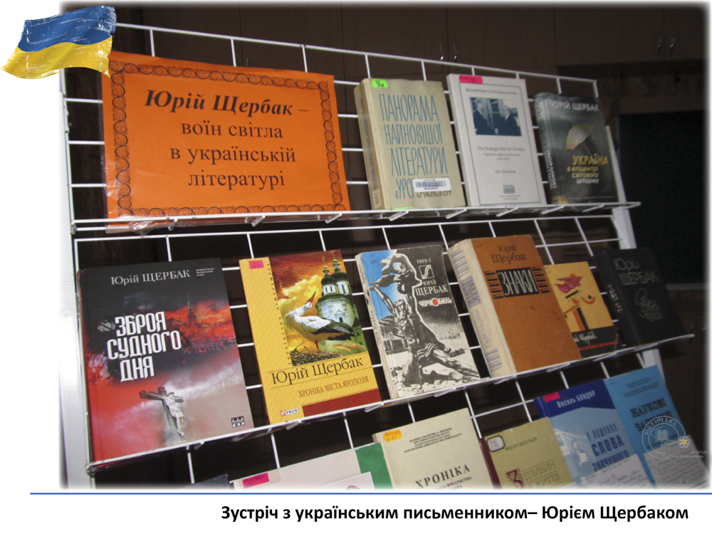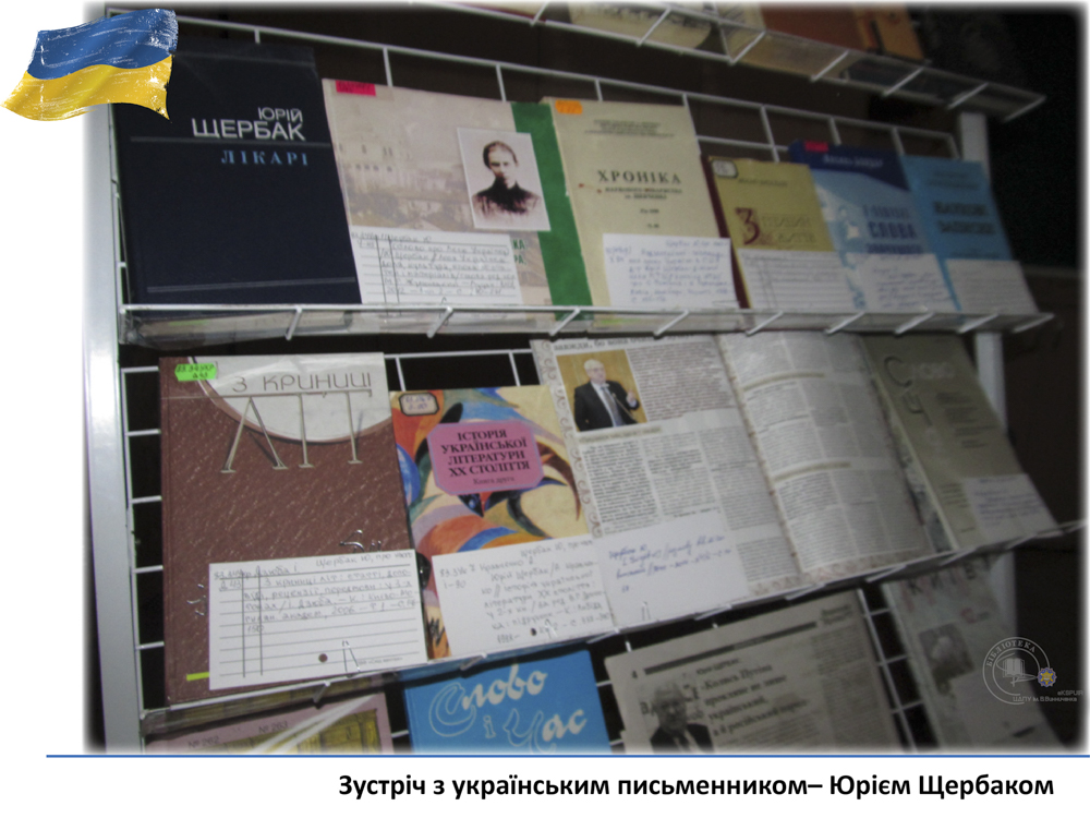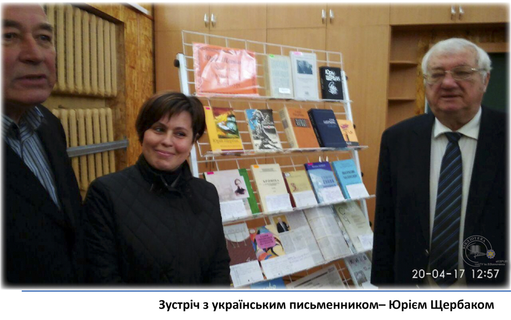 20 квітня у педагогічному університеті ім. В. Винниченка відбулася зустріч з відомим українським письменником, лікарем, дипломатом – Юрієм Щербаком. З цієї нагоди бібліотекарі читального залу філологічних дисциплін підготували виставку «Юрій Щербак – воїн світла в українській літературі». Викладачі, студенти та гості мали змогу глибше познайомитися з творчістю автора та переглянути літературно-критичні дослідження та статті.