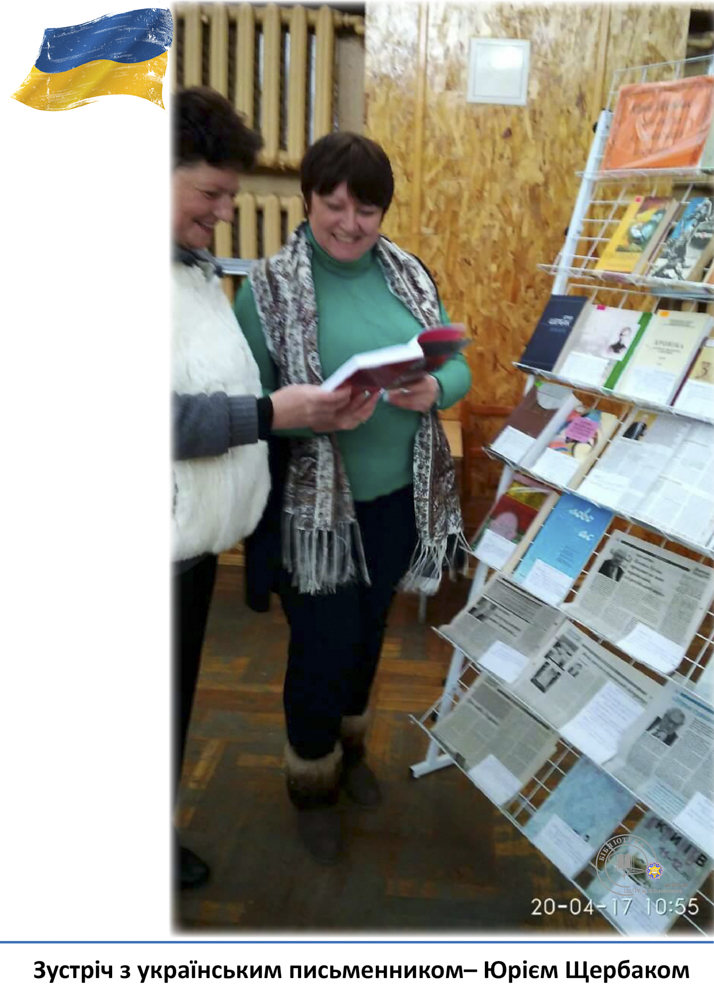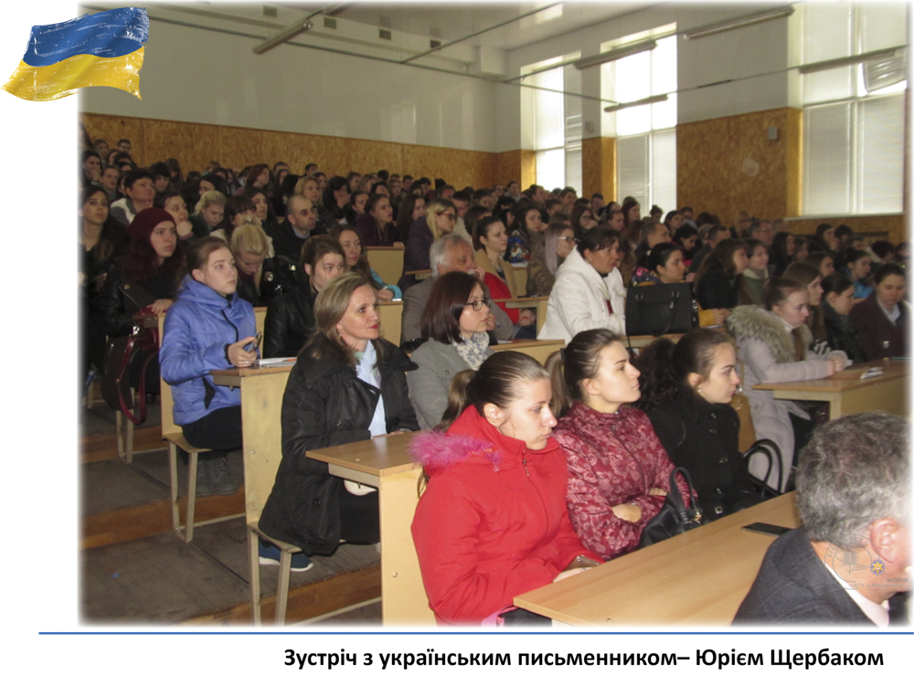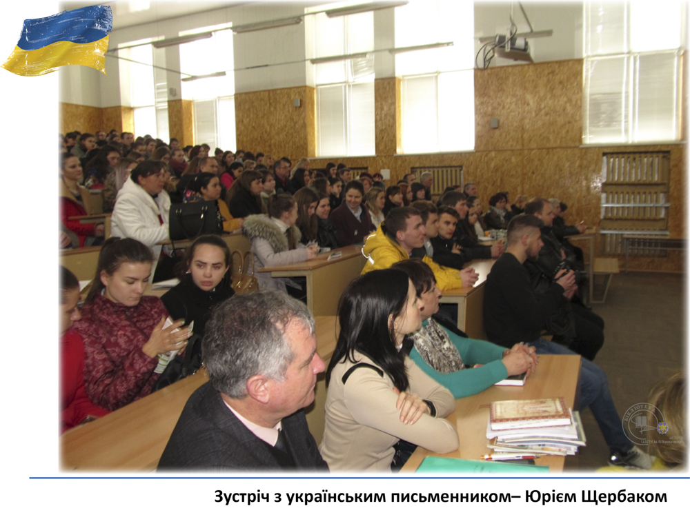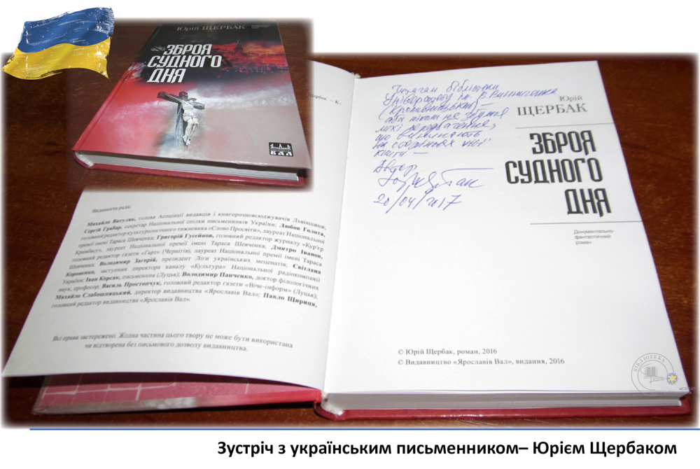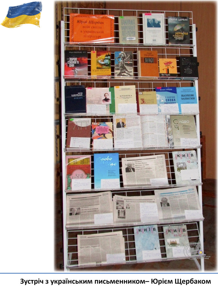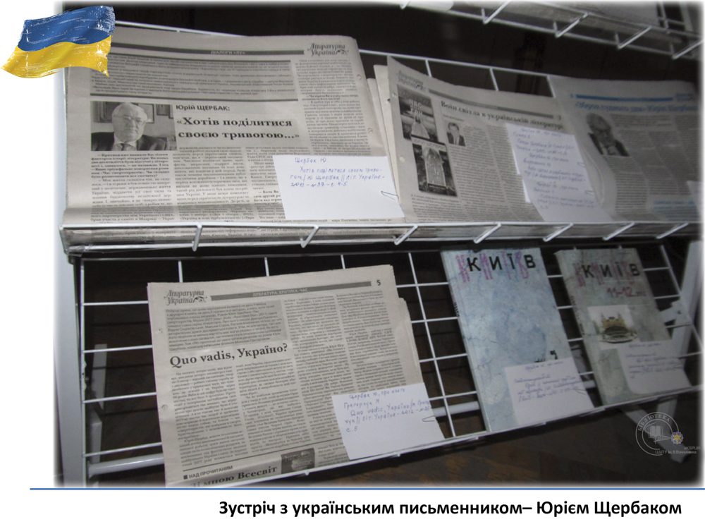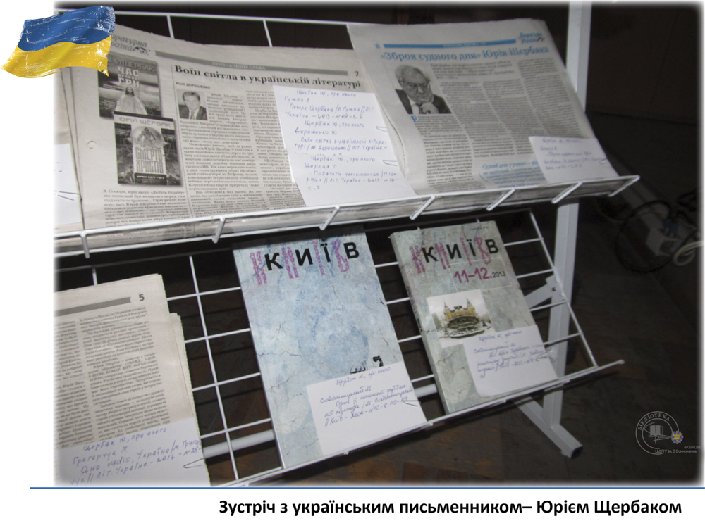 20 квітня у педагогічному університеті ім. В. Винниченка відбулася зустріч з відомим українським письменником, лікарем, дипломатом – Юрієм Щербаком. З цієї нагоди бібліотекарі читального залу філологічних дисциплін підготували виставку «Юрій Щербак – воїн світла в українській літературі». Викладачі, студенти та гості мали змогу глибше познайомитися з творчістю автора та переглянути літературно-критичні дослідження та статті.