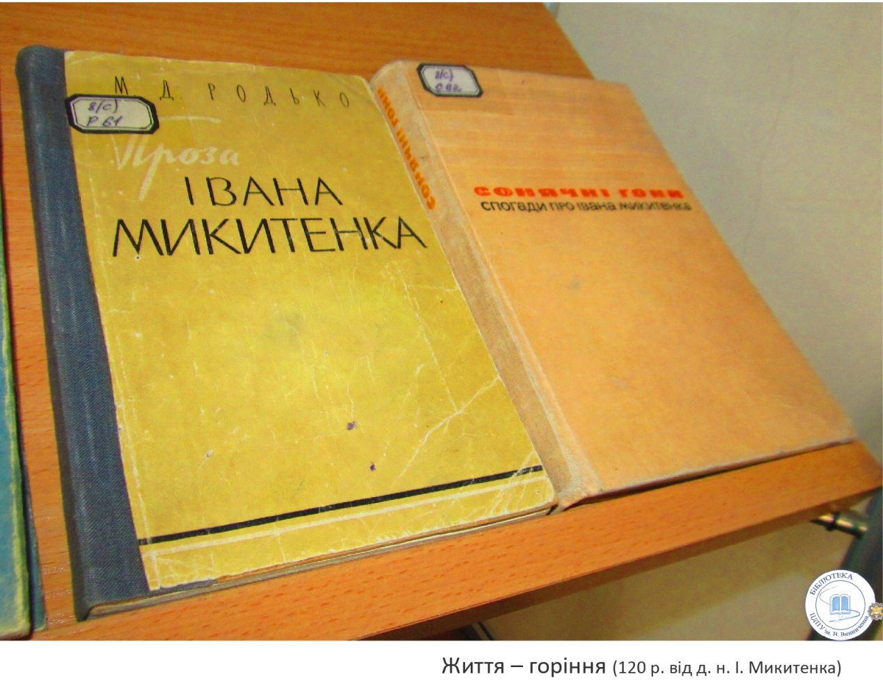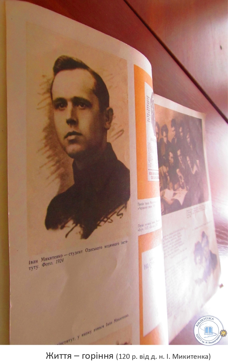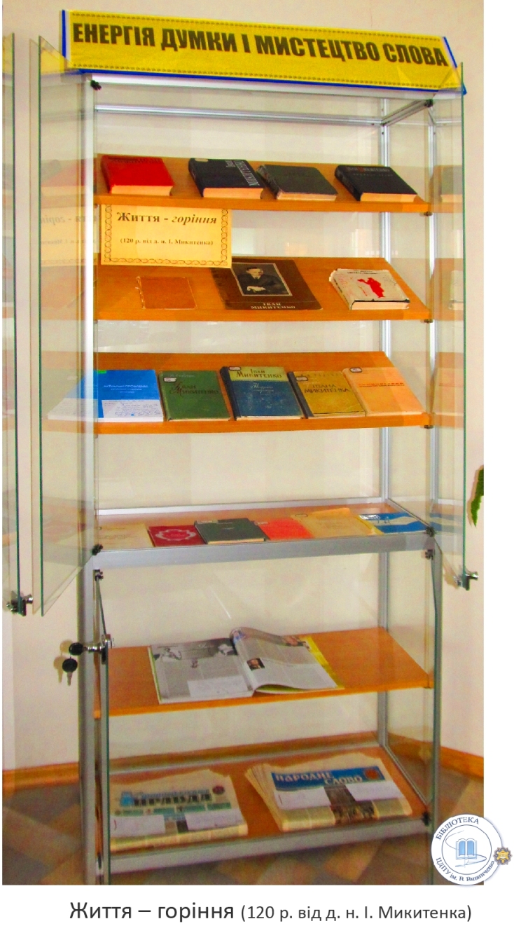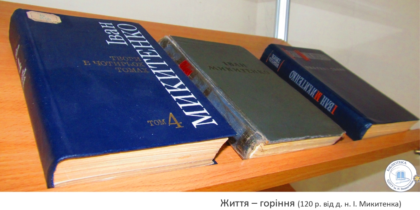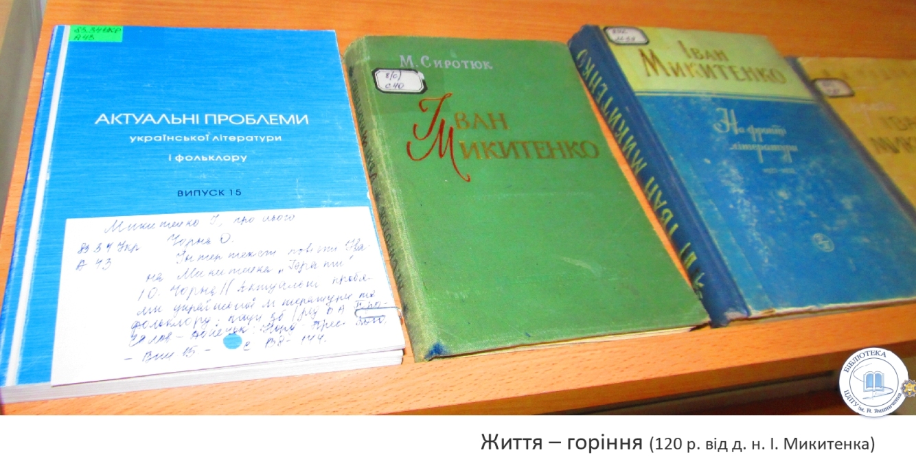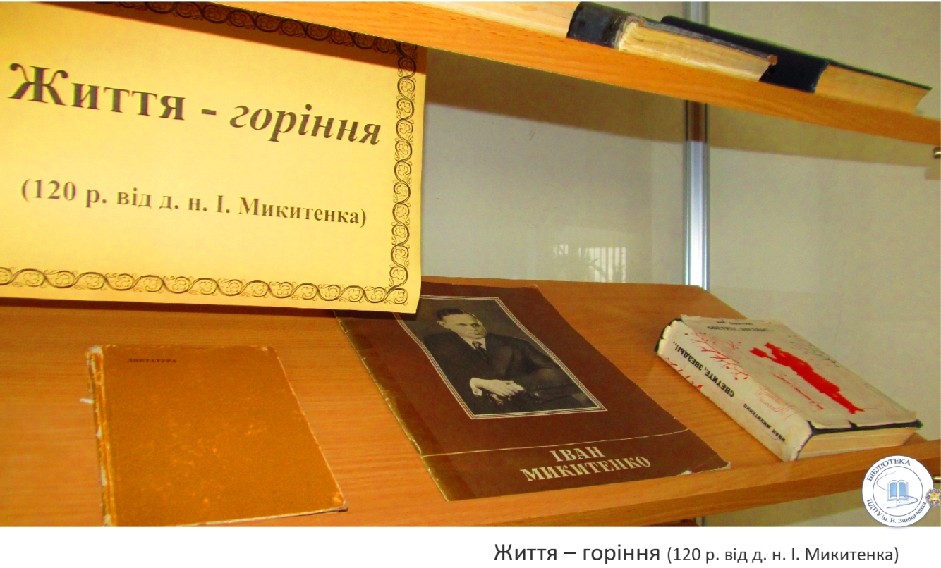 В читальному залі філологічних дисциплін розгорнута виставка «Життя - горіння», яка присвячена 120-річчю від дня народження Івана Микитенка ‒ українського поета, літературознавця, прозаїка, драматурга і публіциста. Експозиція знайомить читачів з художніми творами Івана Микитенко, критичним матеріалом і статтями періодичних видань. На виставку запрошуються всі бажаючі доторкнутися до творчості І. Микитенка.