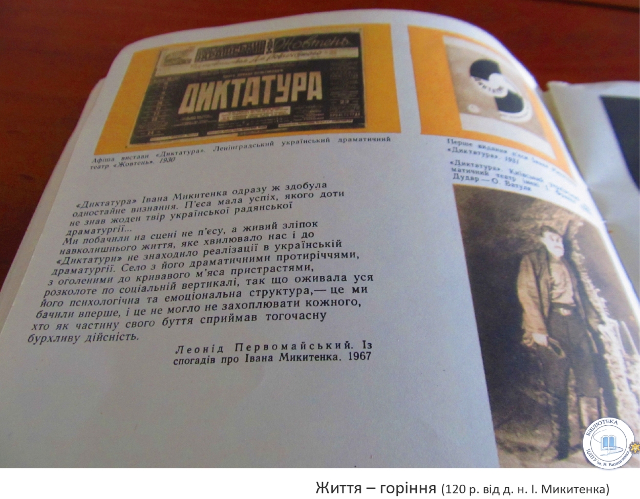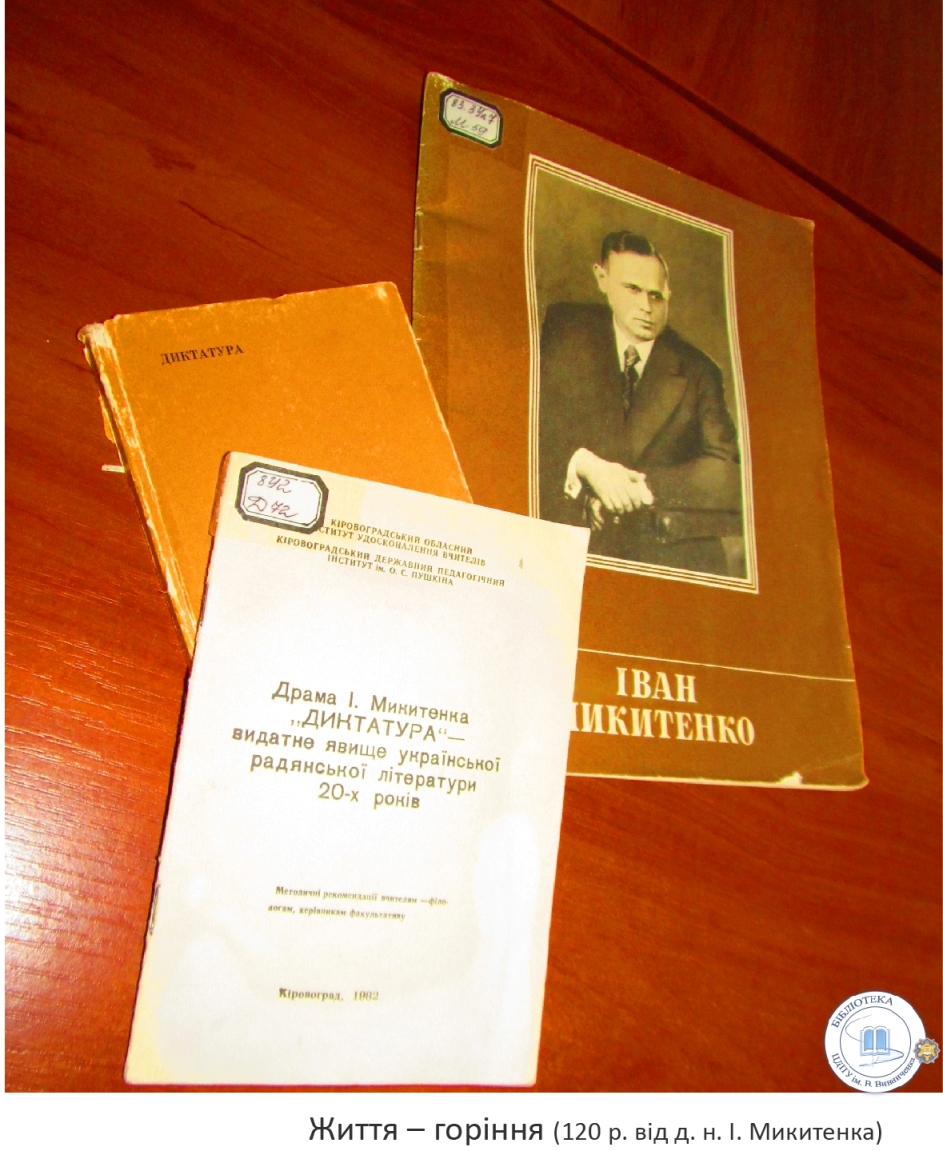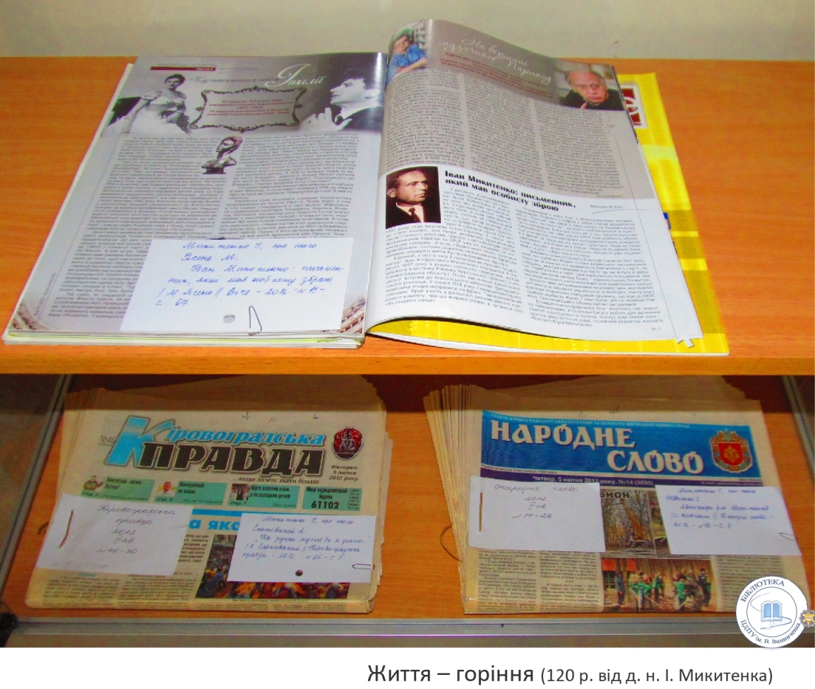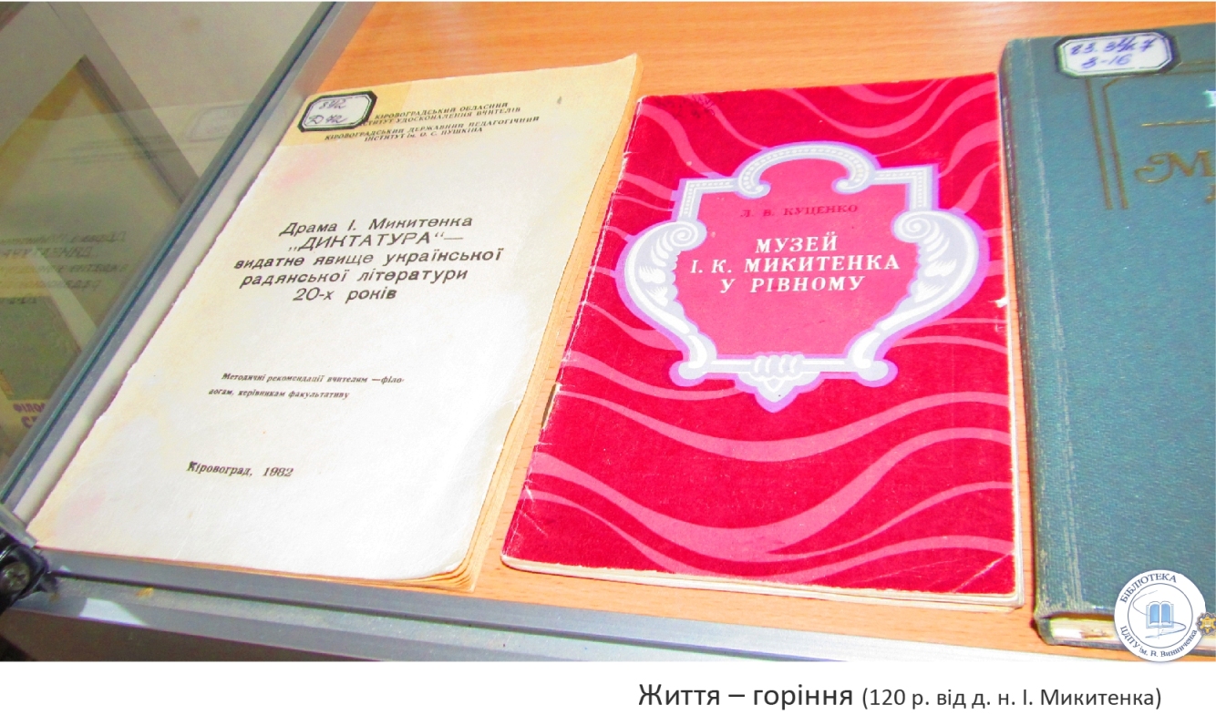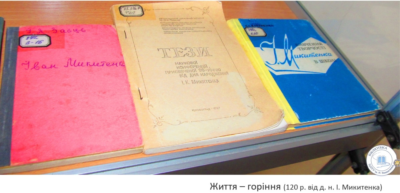 В читальному залі філологічних дисциплін розгорнута виставка «Життя - горіння», яка присвячена 120-річчю від дня народження Івана Микитенка ‒ українського поета, літературознавця, прозаїка, драматурга і публіциста. Експозиція знайомить читачів з художніми творами Івана Микитенко, критичним матеріалом і статтями періодичних видань. На виставку запрошуються всі бажаючі доторкнутися до творчості І. Микитенка.