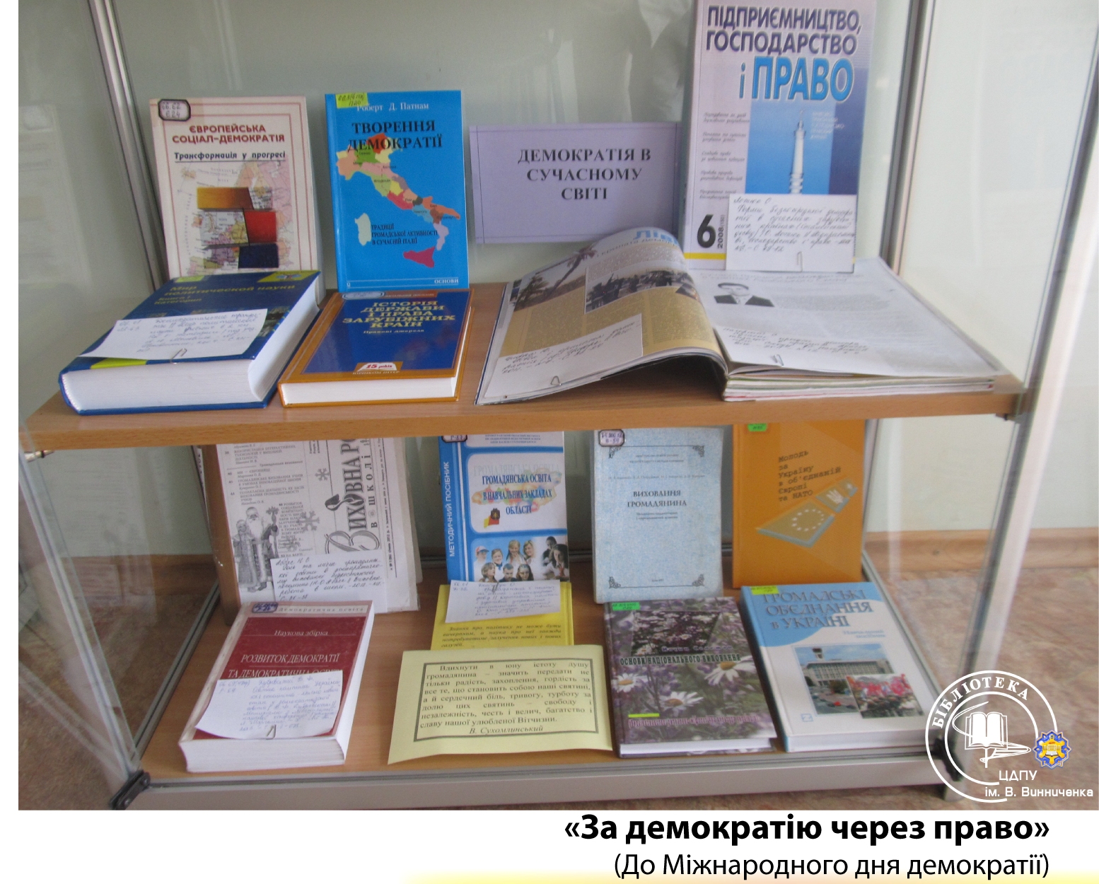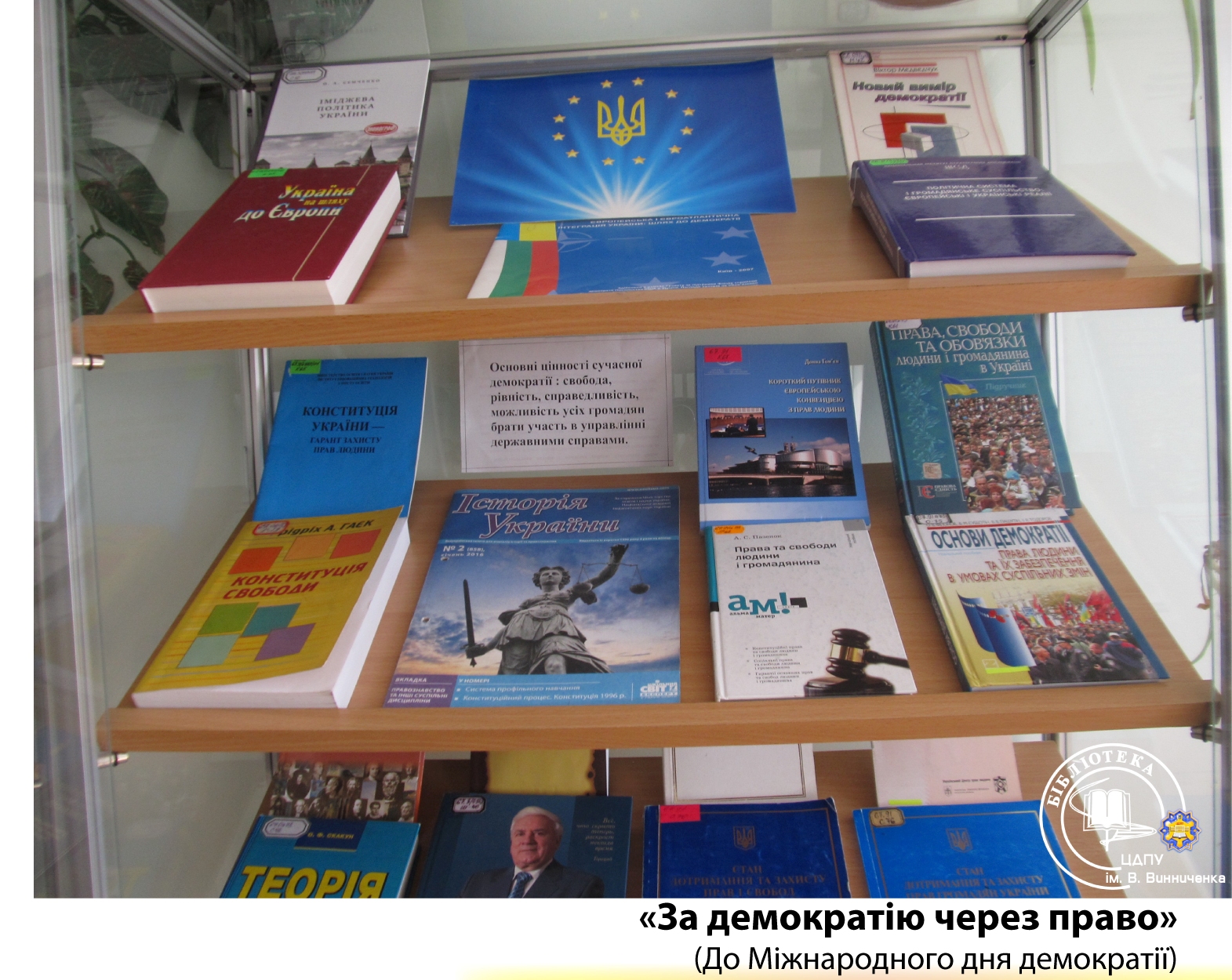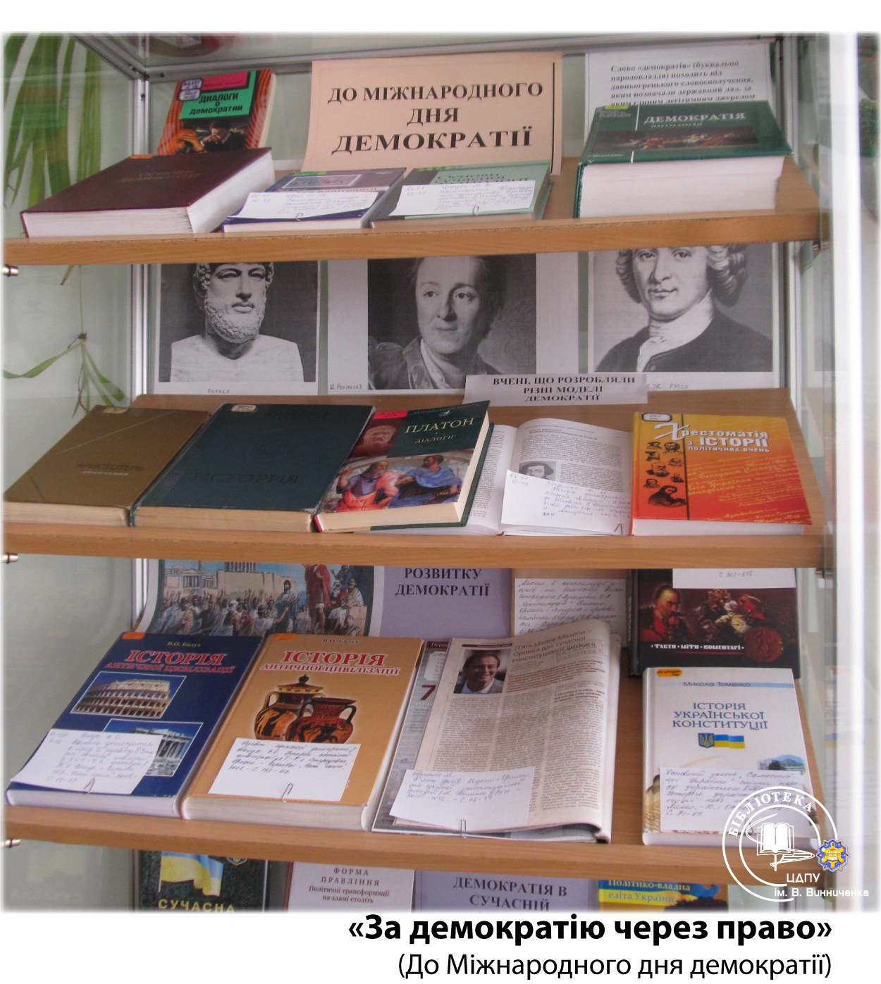 До Міжнародного дня демократії універсальний читальний зал приурочує виставку «За демократію через право». Посібники з історії, політології, правознавства розкривають поняття «демократія»; знайомлять із видатними людьми та їхніми працями, які розробляли різні моделі демократії. Розглядається історія розвитку демократії від зародження у V ст. до н.е. в античних Афінах і закінчуючи сьогоденням сучасної України та зарубіжних країн. Просліджуються елементи демократії – козацькі вольності – в Конституції Пилипа Орлика, з якої М. Томенко виносить 5 уроків для політичної дискусії на сторінках періодичних видань.