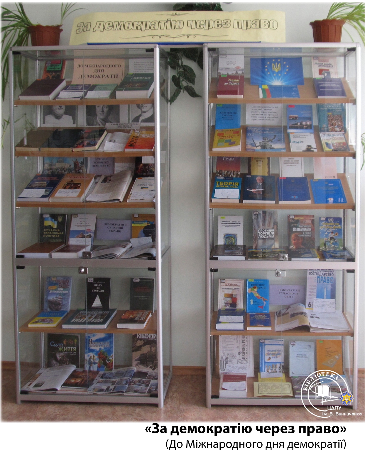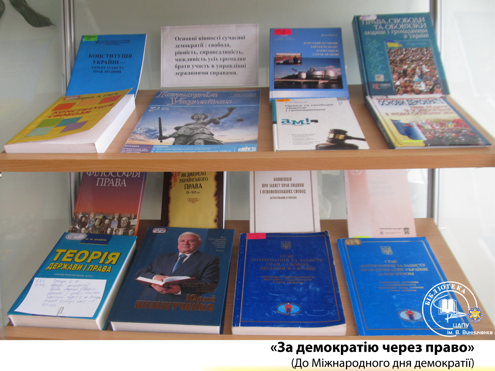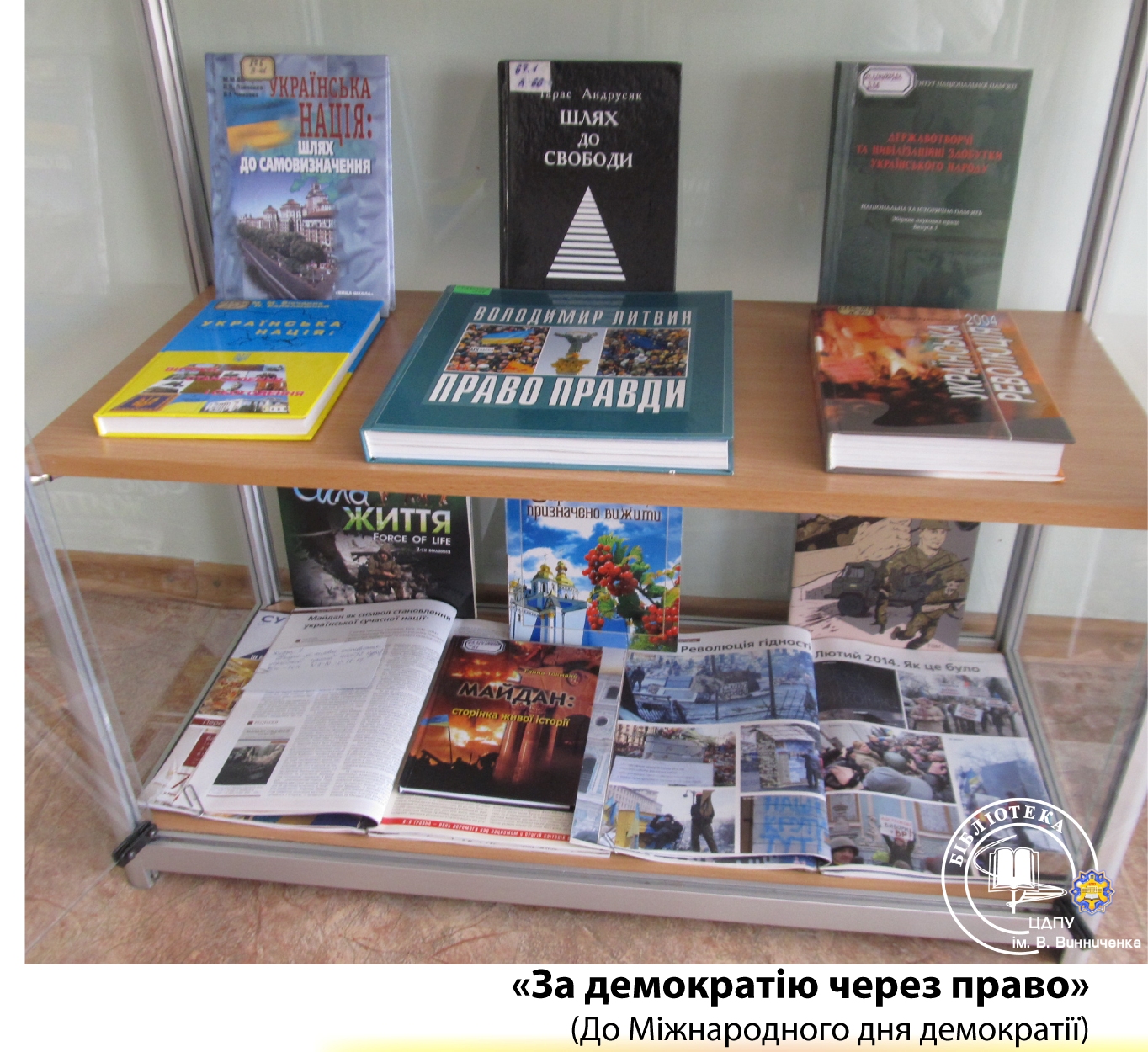 До Міжнародного дня демократії універсальний читальний зал приурочує виставку «За демократію через право». Посібники з історії, політології, правознавства розкривають поняття «демократія»; знайомлять із видатними людьми та їхніми працями, які розробляли різні моделі демократії. Розглядається історія розвитку демократії від зародження у V ст. до н.е. в античних Афінах і закінчуючи сьогоденням сучасної України та зарубіжних країн. Просліджуються елементи демократії – козацькі вольності – в Конституції Пилипа Орлика, з якої М. Томенко виносить 5 уроків для політичної дискусії на сторінках періодичних видань.