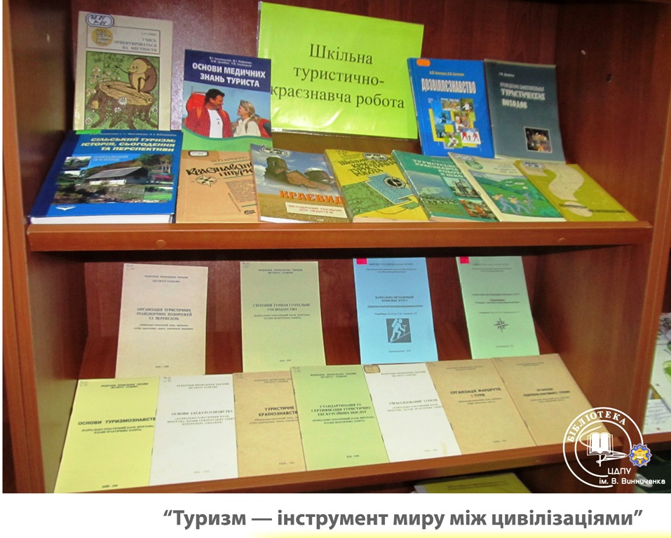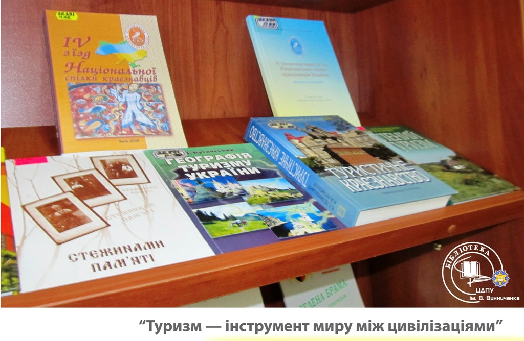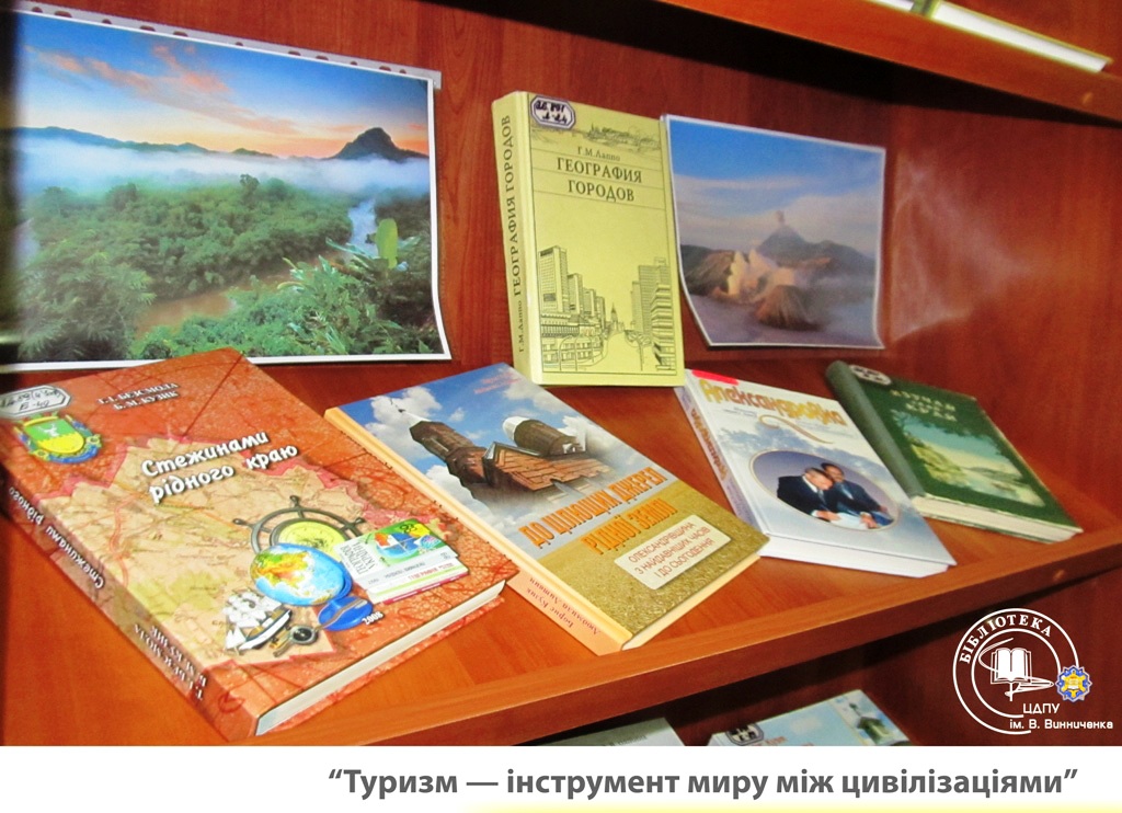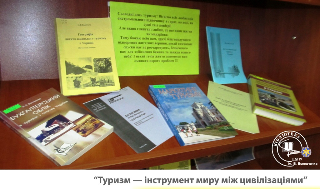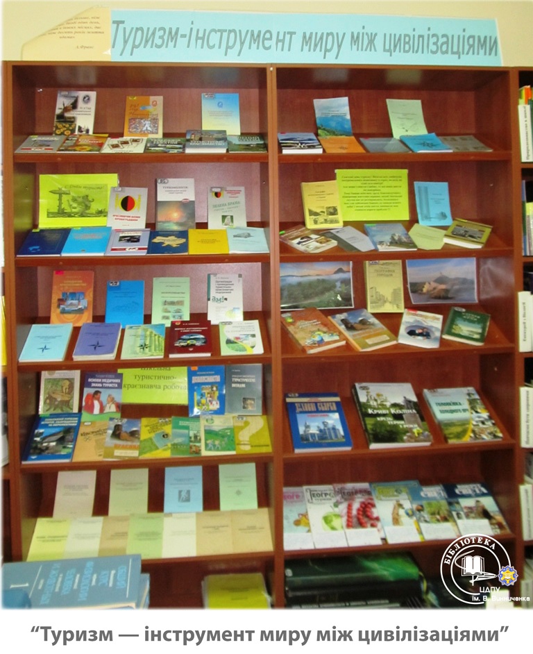 В читальному залі природничо-географічного факультету до Дня туризму представлена виставка “Туризм — інструмент миру між цивілізаціями”. Всесвітній день туризму проводиться з метою пропаганди туризму, висвітлення його внеску в розвиток культурних зв'язків. На виставці представлені навчальні посібники з історії туризму, географії, сільського туризму. Також підручники з маркетингу та дитячо-юнацького туризму де висвітлено педагогічні та організаційні засади та періодичні видання. Запрошуємо всіх бажаючих до перегляду нашої виставки.