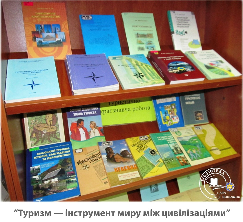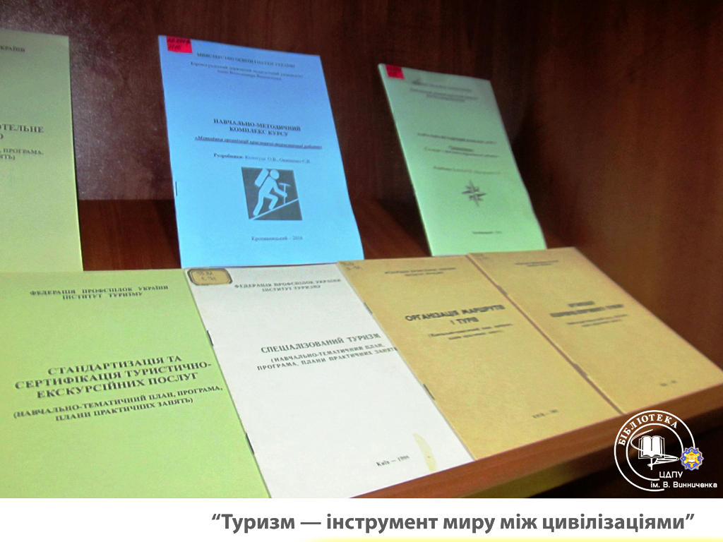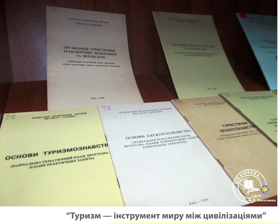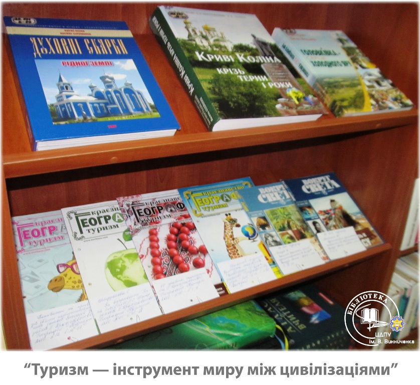 В читальному залі природничо-географічного факультету до Дня туризму представлена виставка “Туризм — інструмент миру між цивілізаціями”. Всесвітній день туризму проводиться з метою пропаганди туризму, висвітлення його внеску в розвиток культурних зв'язків. На виставці представлені навчальні посібники з історії туризму, географії, сільського туризму. Також підручники з маркетингу та дитячо-юнацького туризму де висвітлено педагогічні та організаційні засади та періодичні видання. Запрошуємо всіх бажаючих до перегляду нашої виставки.