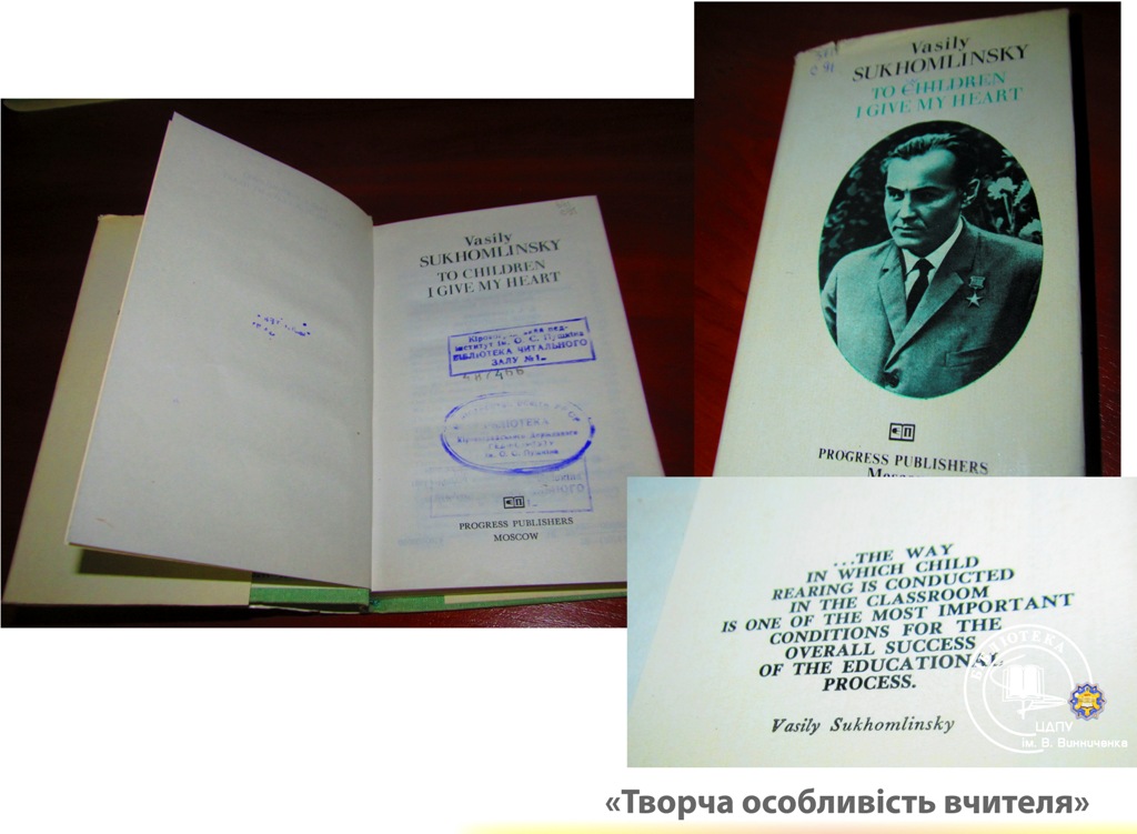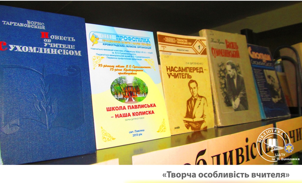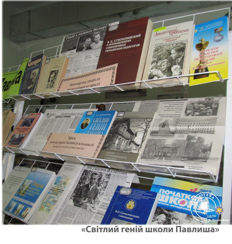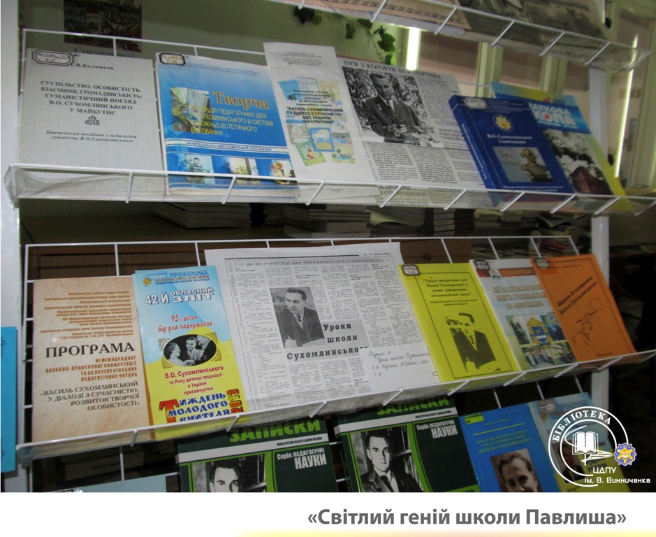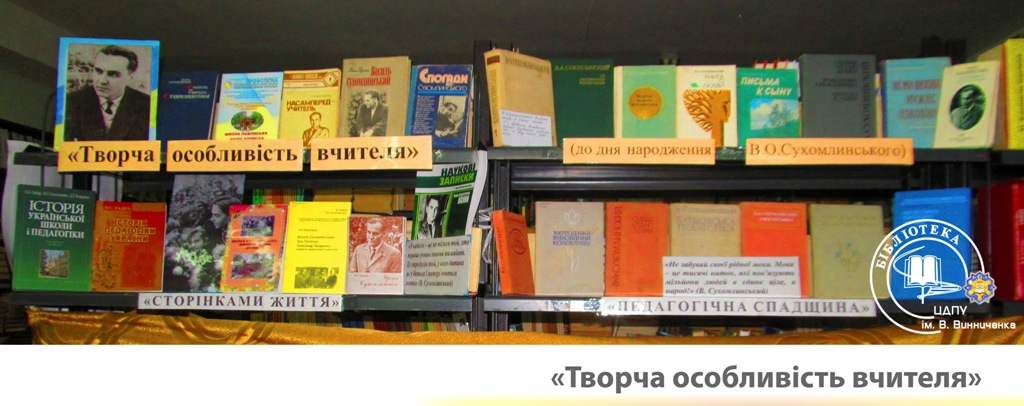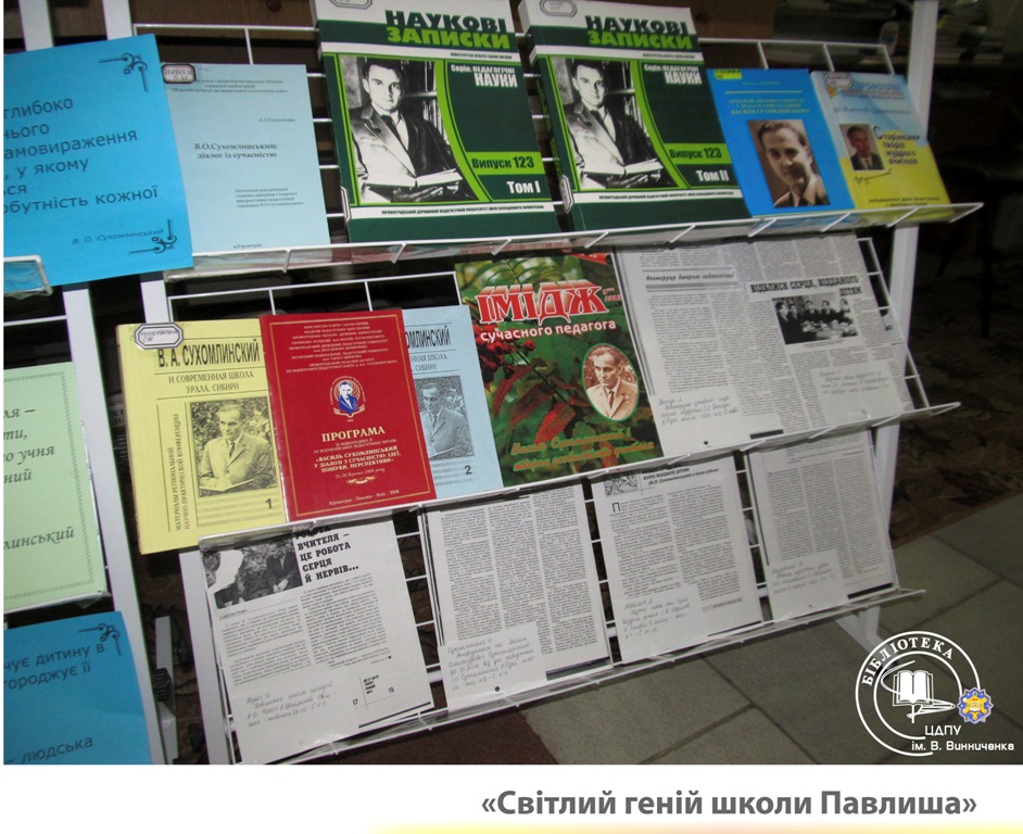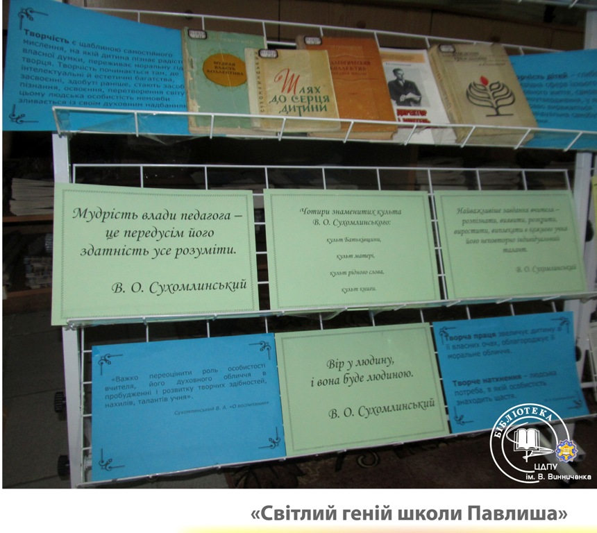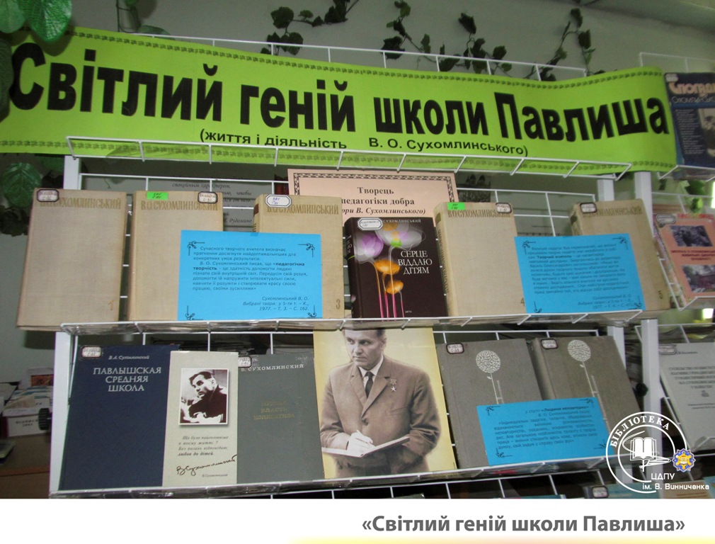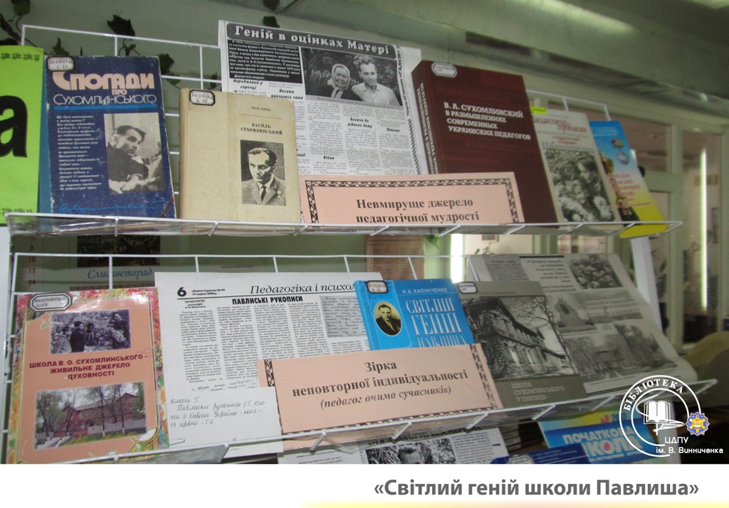 З нагоди Дня народження корифея української та світової педагогіки В. Сухомлинського бібліотека університету презентує розгорнуті книжкові виставки «Світлий геній школи Павлиша», «Творча особистість вчителя». В. Сухомлинський – подвижник гуманістичного напрямку в навчанні та вихованні підростаючих поколінь. В основу всіх цінностей світу він, як і філософи Давньої Греції, ставить людину з усіма складностями її життя. Василь Олександрович завжди домагався, щоб навчання було найбільшою радістю для дитини. Багатим джерелом творчості педагога – новатора була народна педагогічна мудрість.