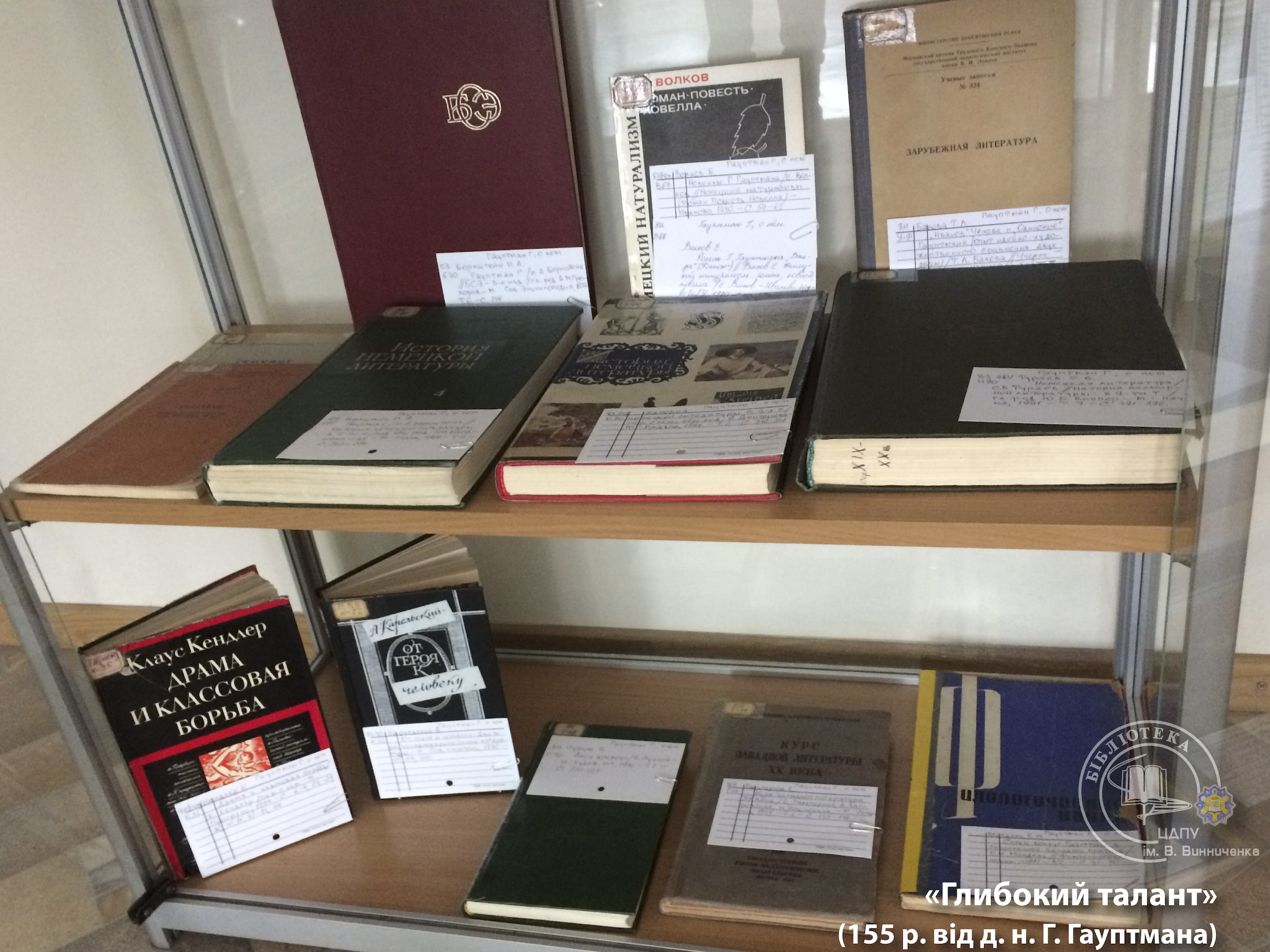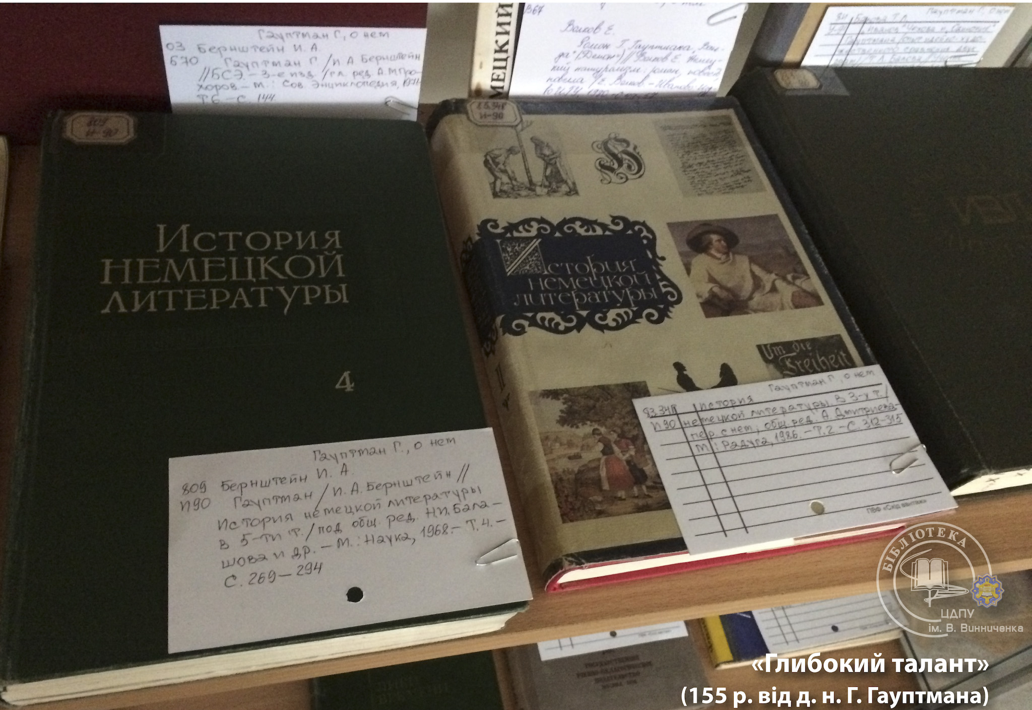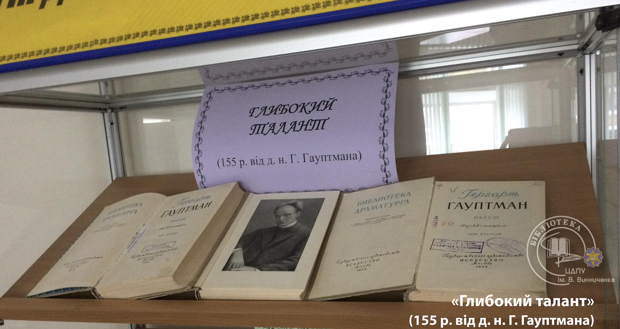 З 13 листопада в читальному залі філологічних дисциплін експонується книжкова виставка, яка присвячена письменнику, що належить до видатних репрезентантів німецької літератури. Радимо читачам починати знайомство з Гергартом Гауптманом з його літературної спадщини, яка охоплює драми, романи, оповідання, поеми, вірші, нариси. Твори письменника вражають глибиною психологічних спостережень та бентежать душу силою правди. Подані на виставці літературно-критичні джерела висвітлюють творчу майстерню письменника та його складний і суперечливий життєвий шлях.