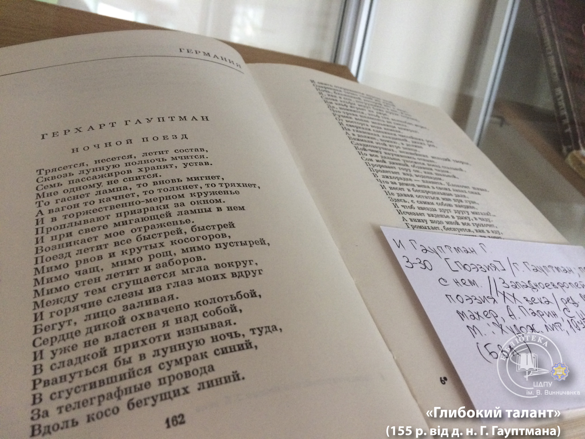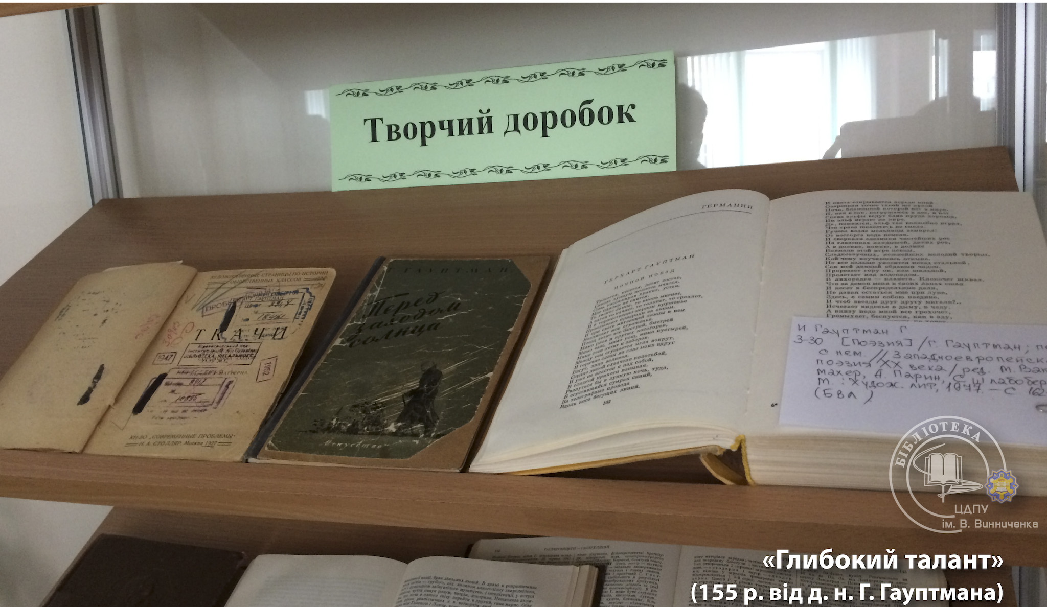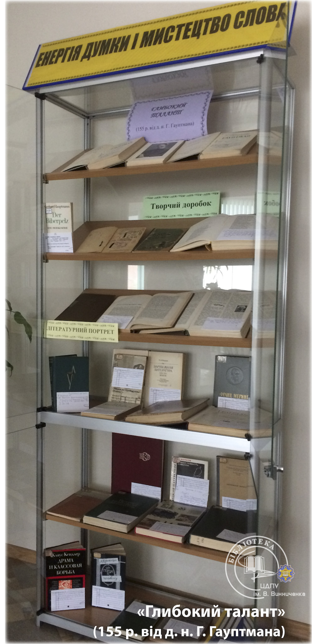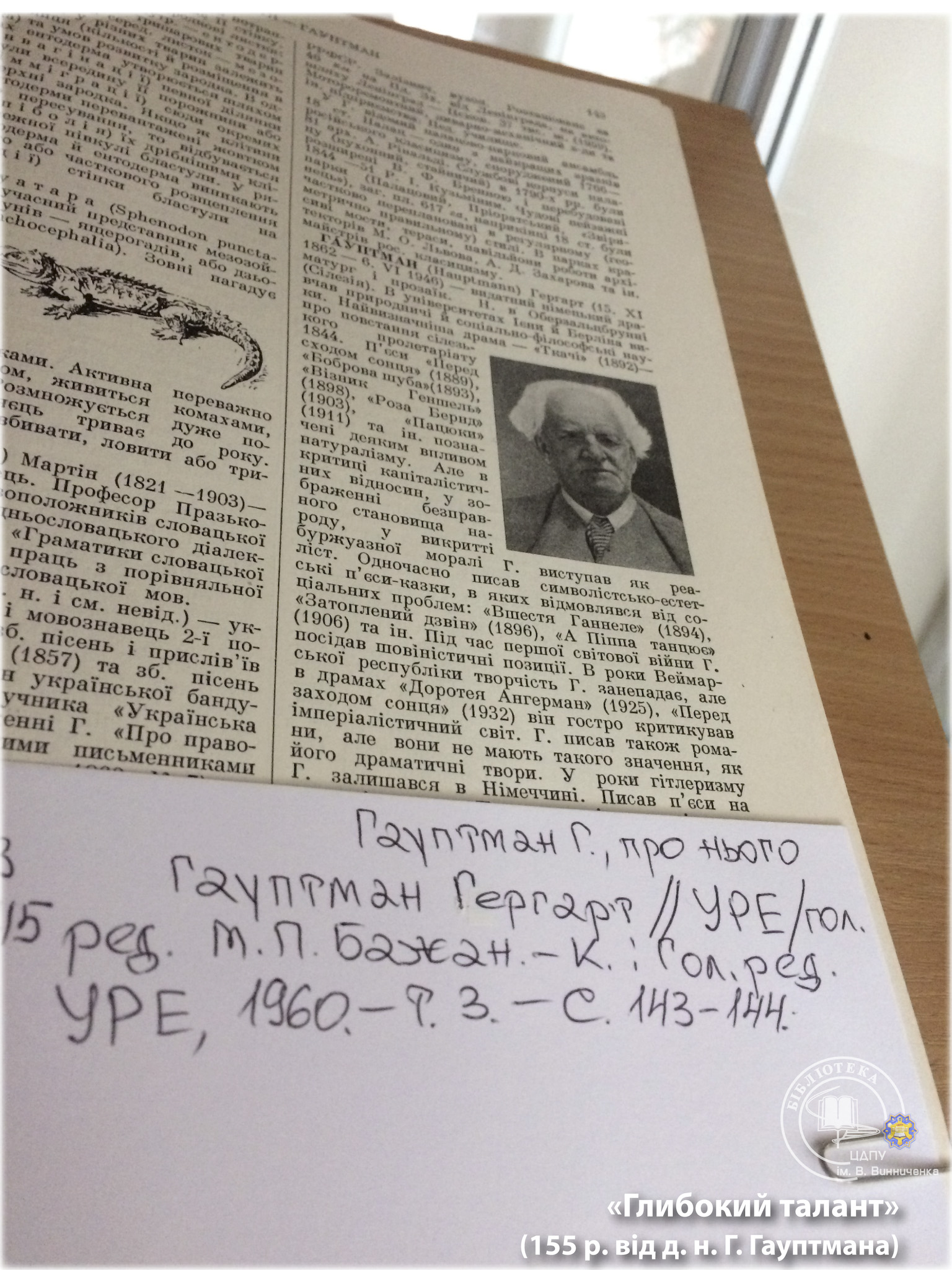 З 13 листопада в читальному залі філологічних дисциплін експонується книжкова виставка, яка присвячена письменнику, що належить до видатних репрезентантів німецької літератури. Радимо читачам починати знайомство з Гергартом Гауптманом з його літературної спадщини, яка охоплює драми, романи, оповідання, поеми, вірші, нариси. Твори письменника вражають глибиною психологічних спостережень та бентежать душу силою правди. Подані на виставці літературно-критичні джерела висвітлюють творчу майстерню письменника та його складний і суперечливий життєвий шлях.