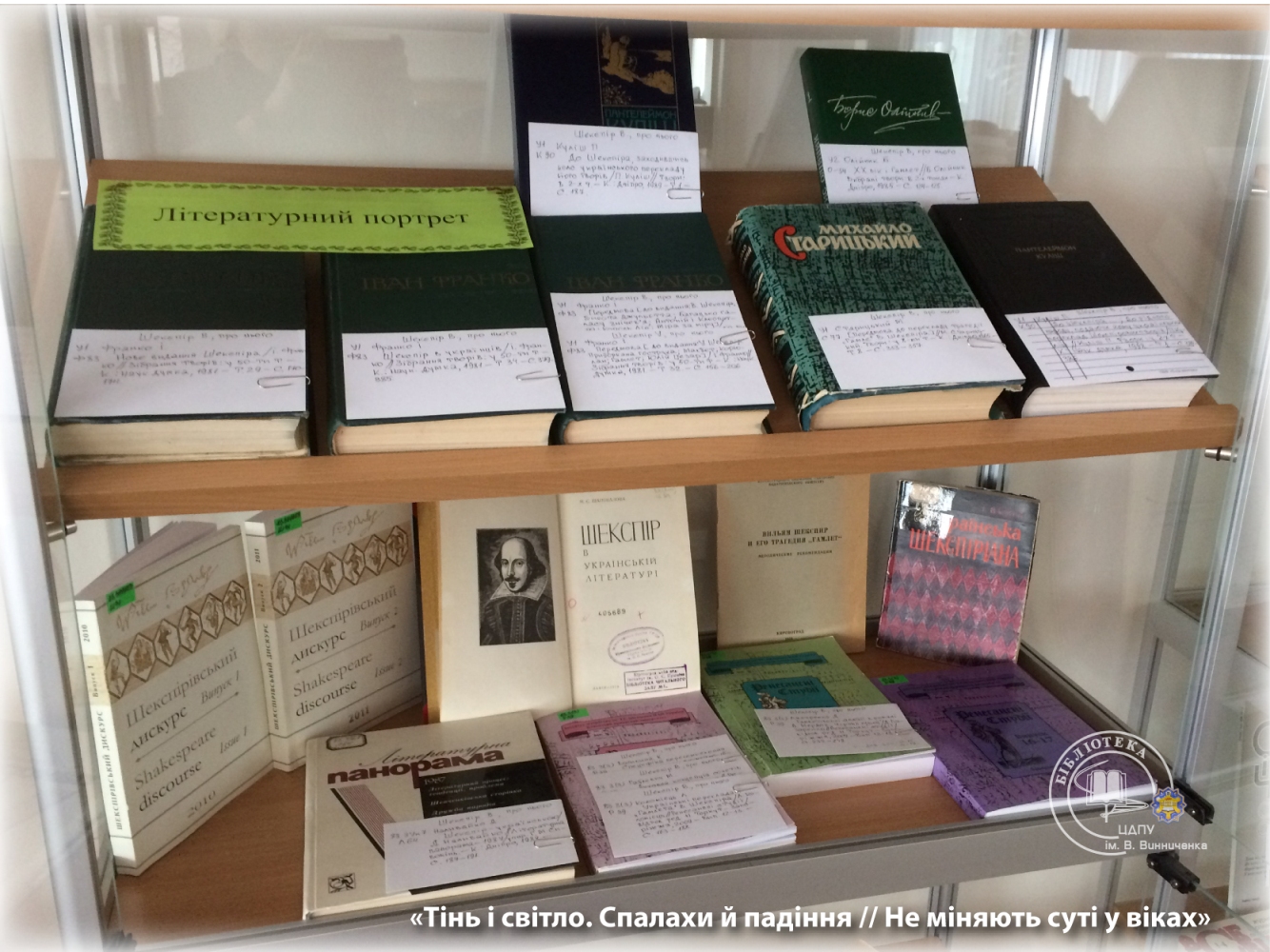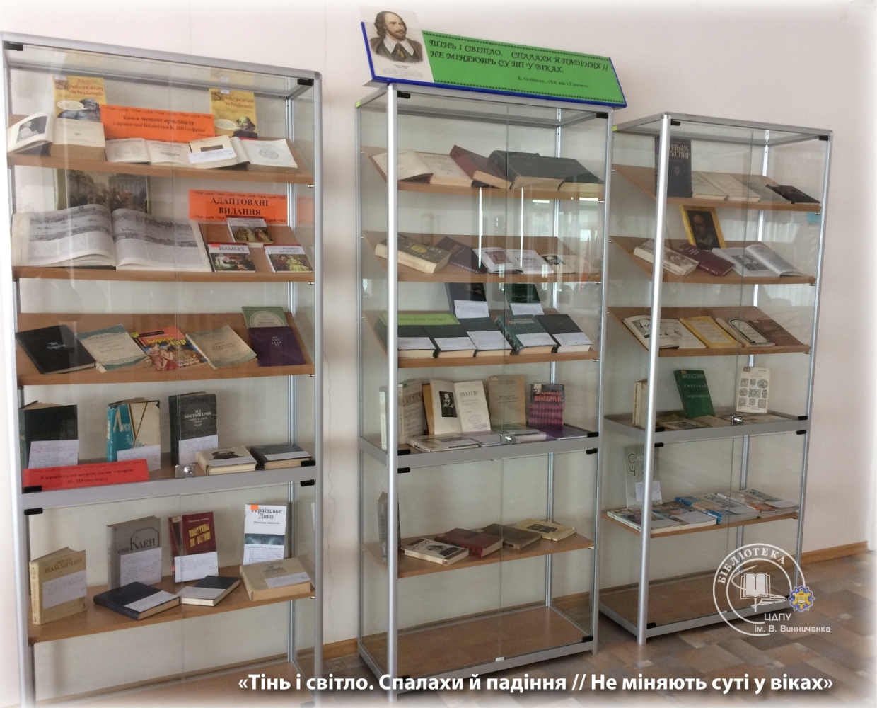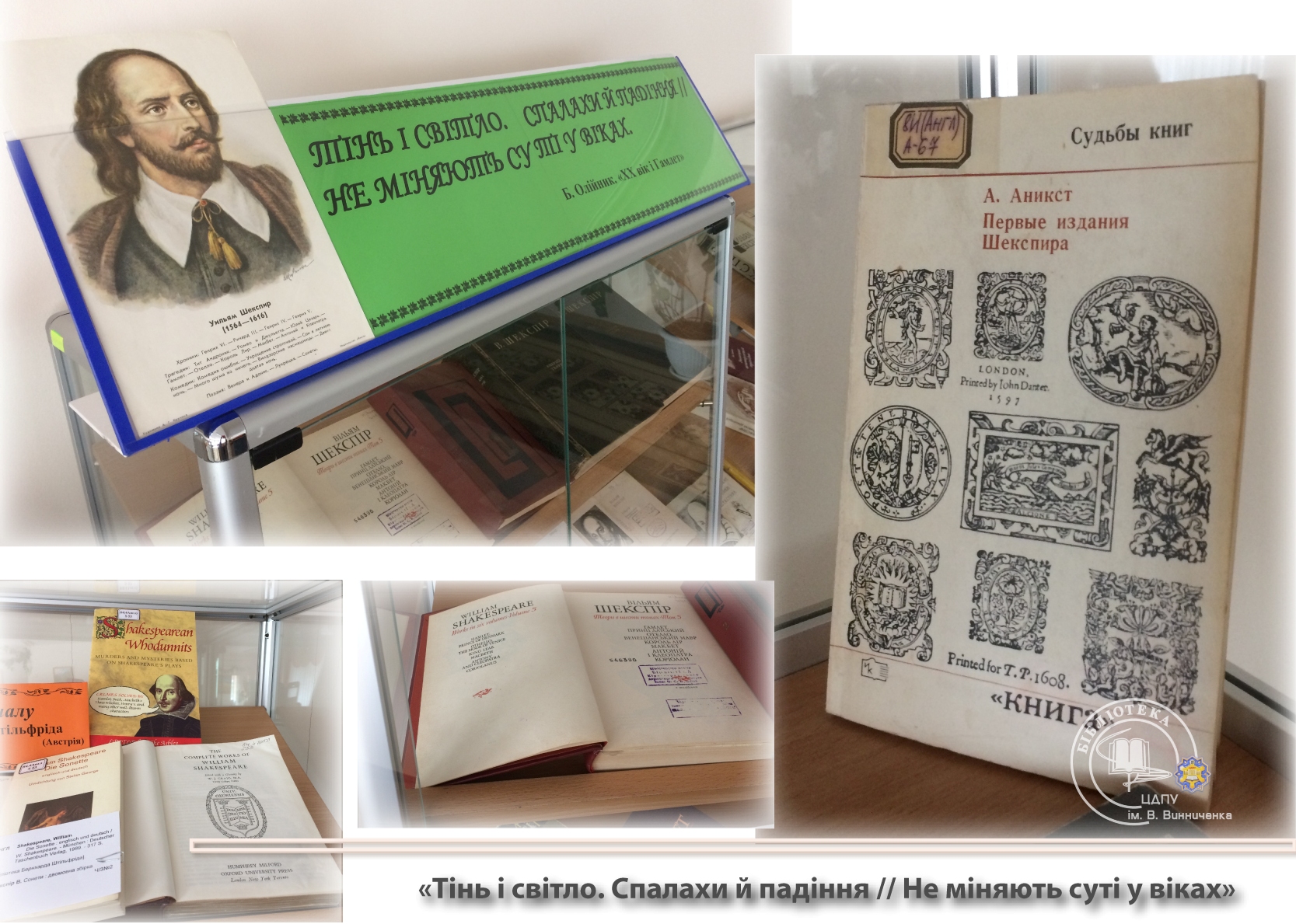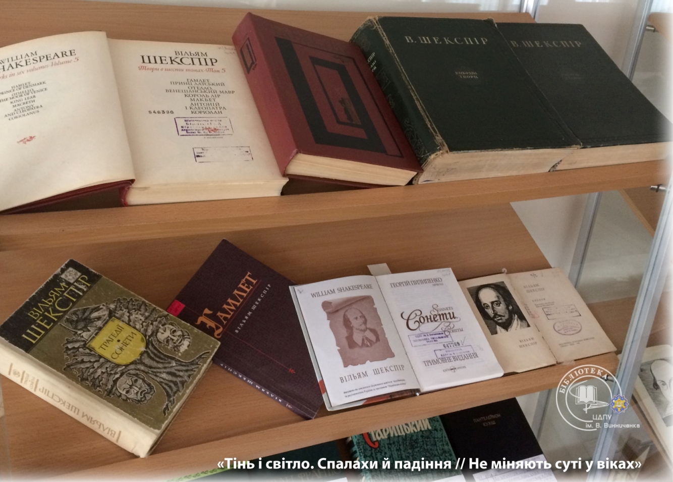Багатий фактичний матеріал експозиції висвітлює життєвий і творчий шлях митця, критичну інтерпретацію шекспірологів творчої спадщини великого англійського драматурга і поета. До уваги конкурсантів і гостей сонети та трагедії мовою оригіналу, адаптовані видання та художні переклади українських письменників в історичній перспективі.