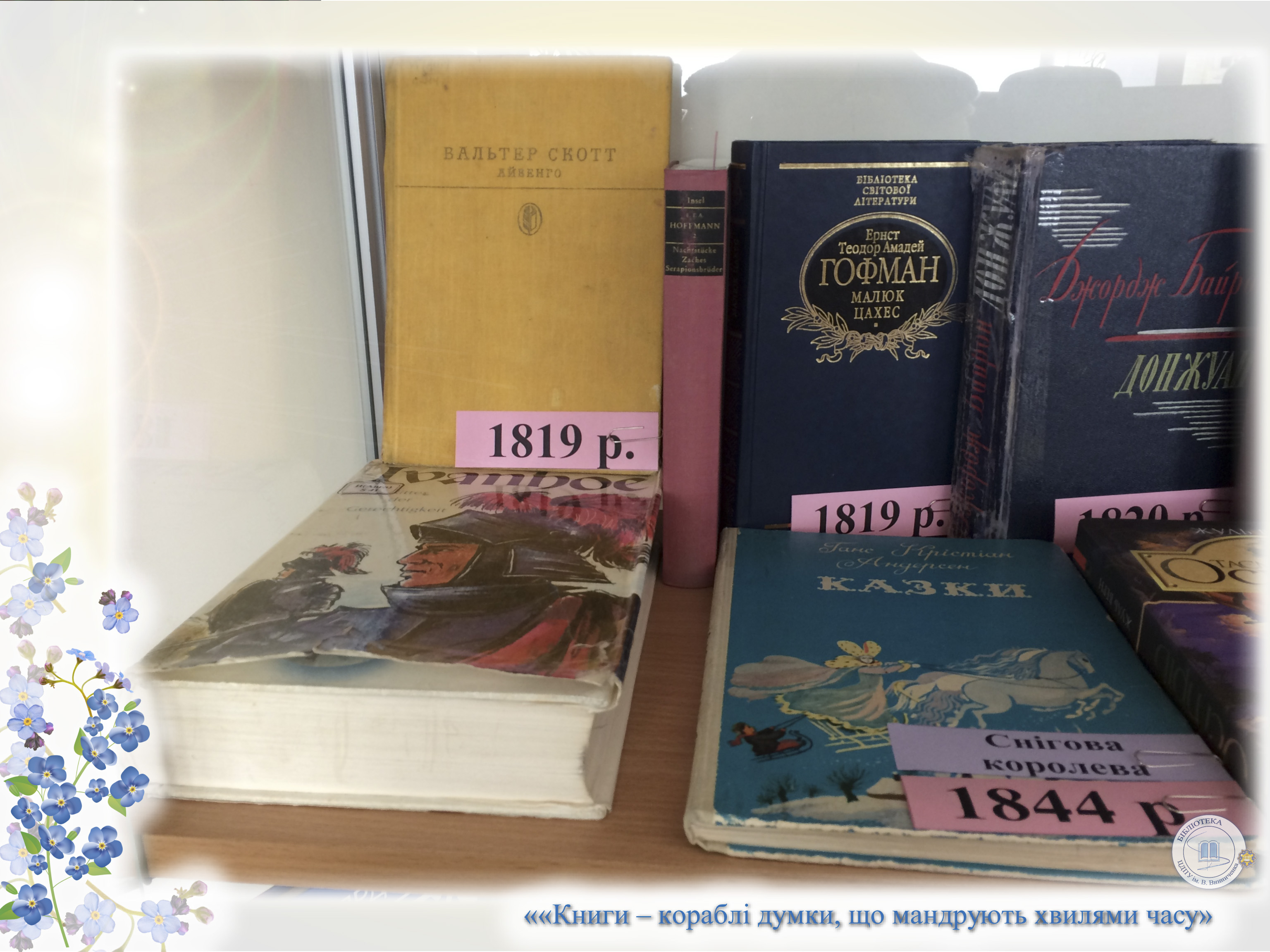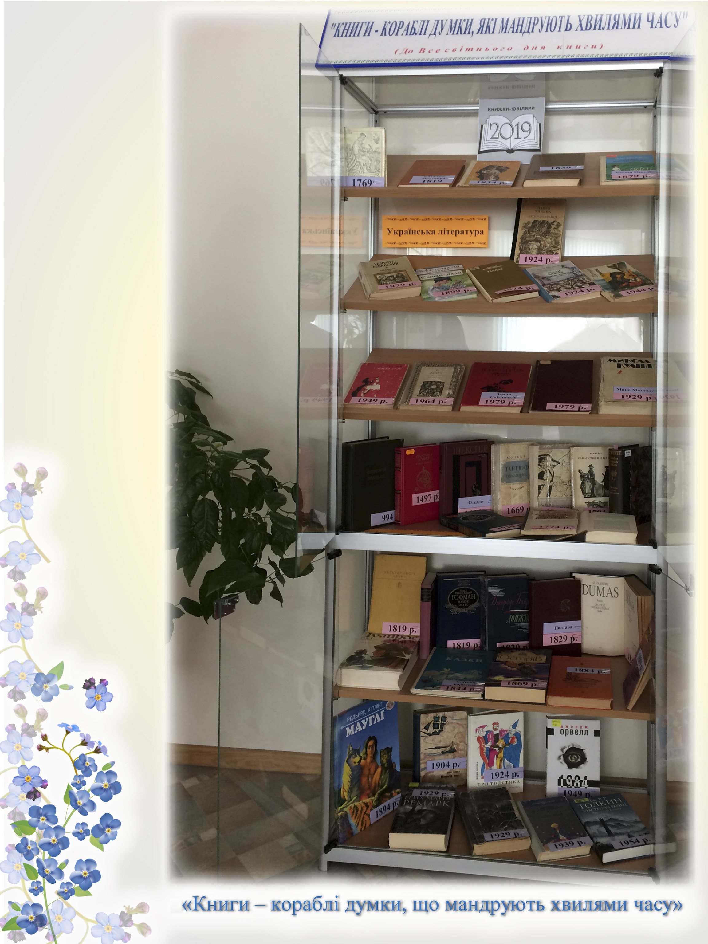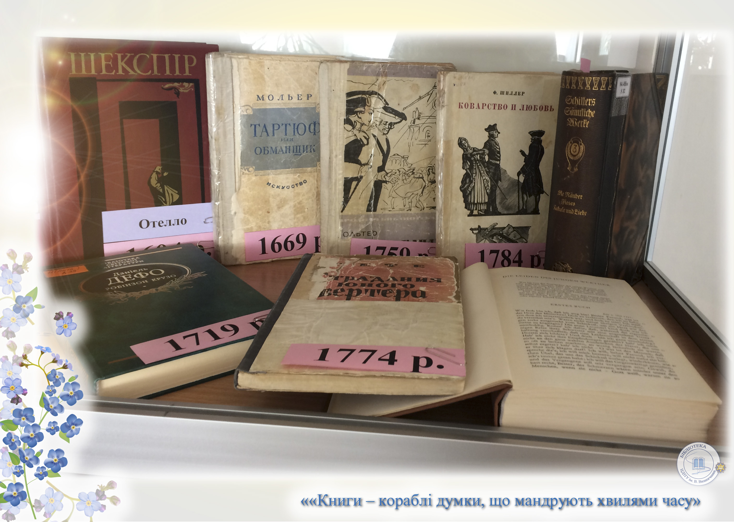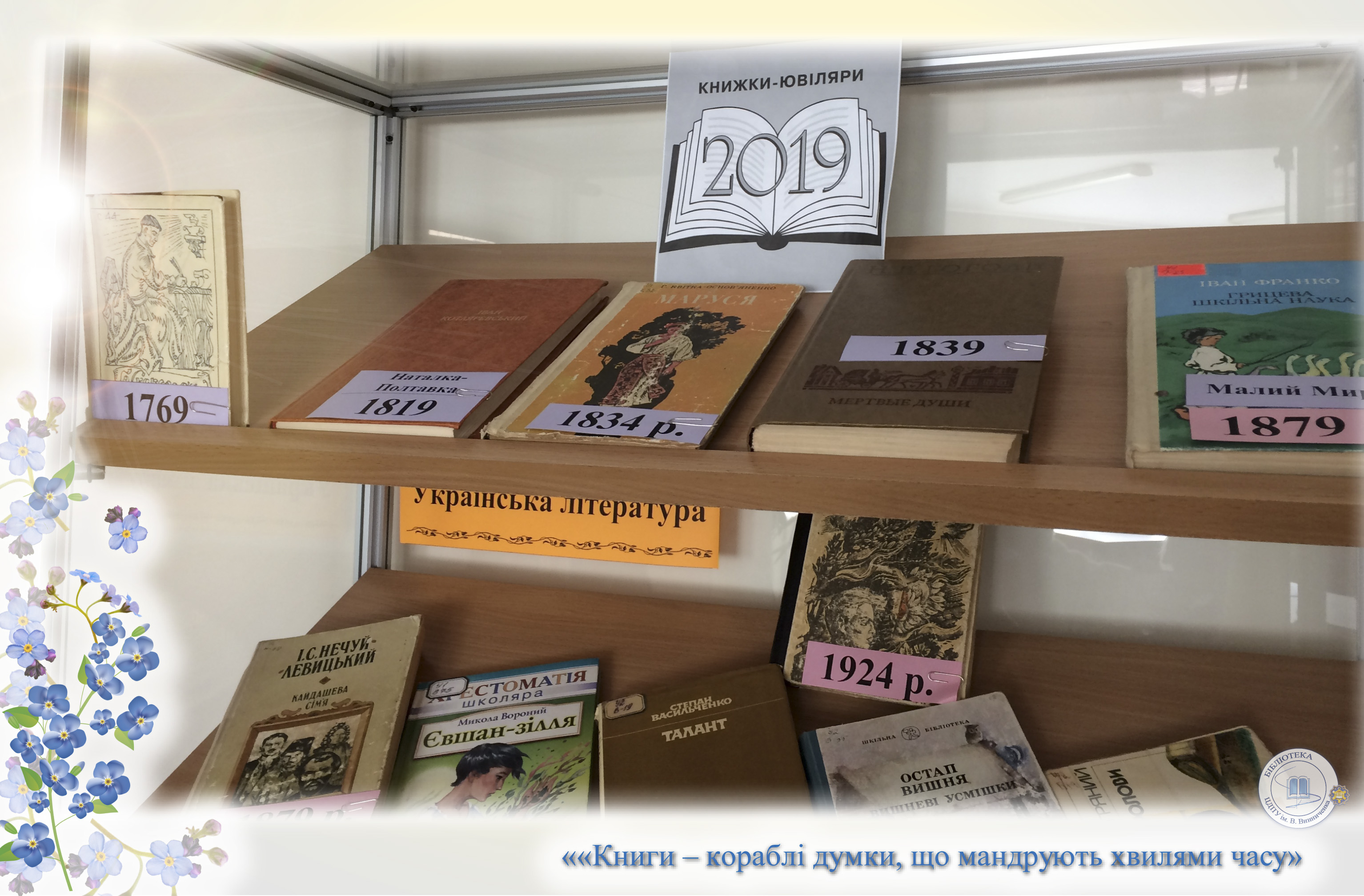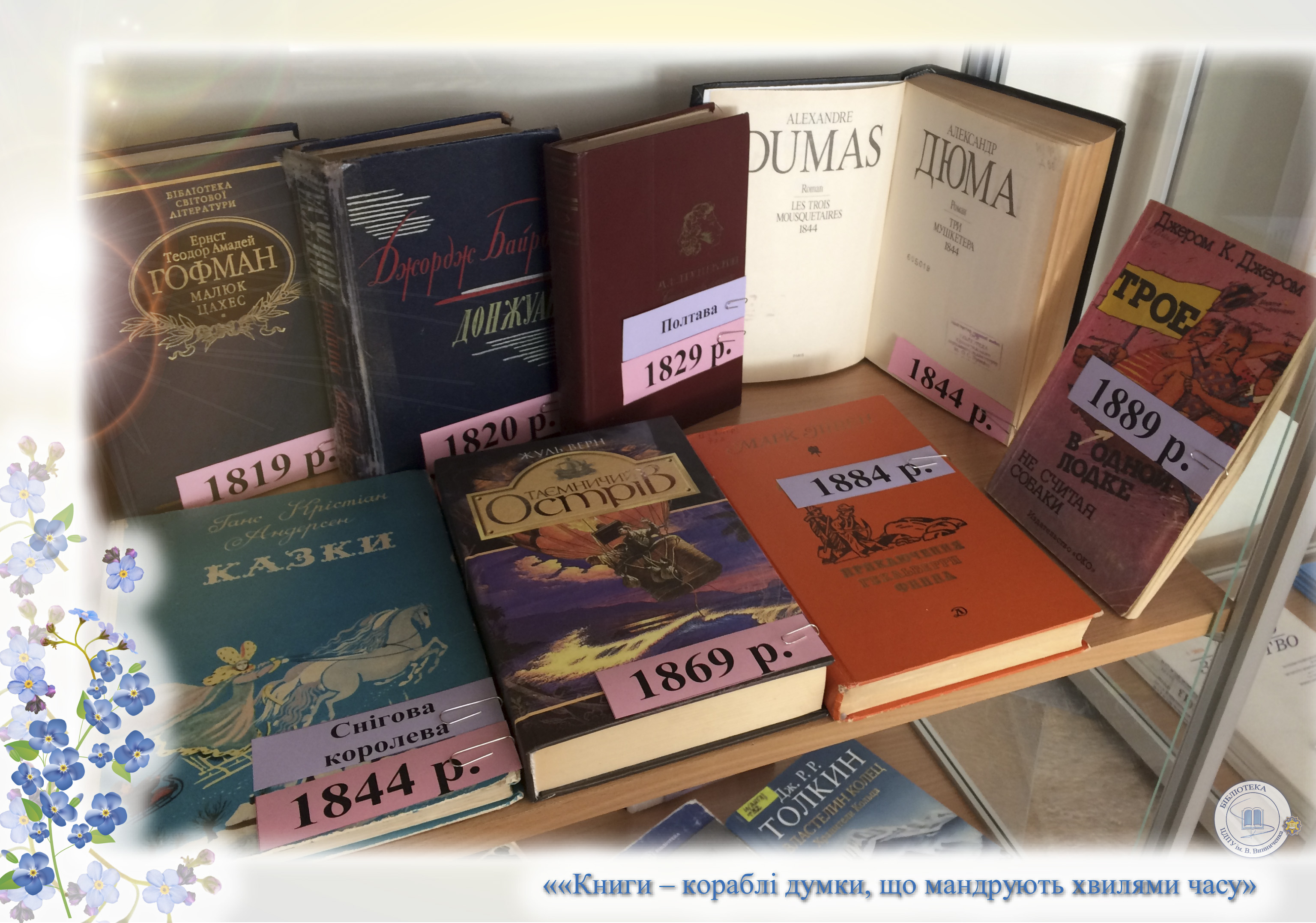 Шановний Читачу! Книга – це велике диво, приголомшливий винахід людства! В усі часи, в усіх країнах світу люди цінували книги і берегли їх як найдорогоцінніші скарби. Книги, як і люди, мають свою долю. Одні мандрують століттями, інші помирають, не встигнувши народитись. Цього року відзначають свій ювілей сотні світових шедеврів. Про те, які твори святкуватимуть ювілей, допоможе дізнатися експозиція виставки, яка присвячена Книгам-ювілярм. Перегортаючи їх сторінки, Ви доторкнетесь до багатющого культурного надбання всього людства.