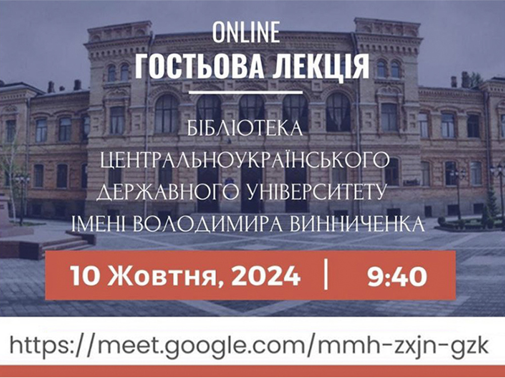 10 жовтня 2024 р. на базі Бібліотеки ЦДУ ім. В. Винниченка було проведено гостьову лекцію в онлайн-форматі для здобувачів третього (освітньо-наукового) рівня вищої освіти нашого університету в рамках викладання освітнього компонента «Інформаційні технології в науці» (кандидат педагогічних наук, доцент О. В. Абрамова).