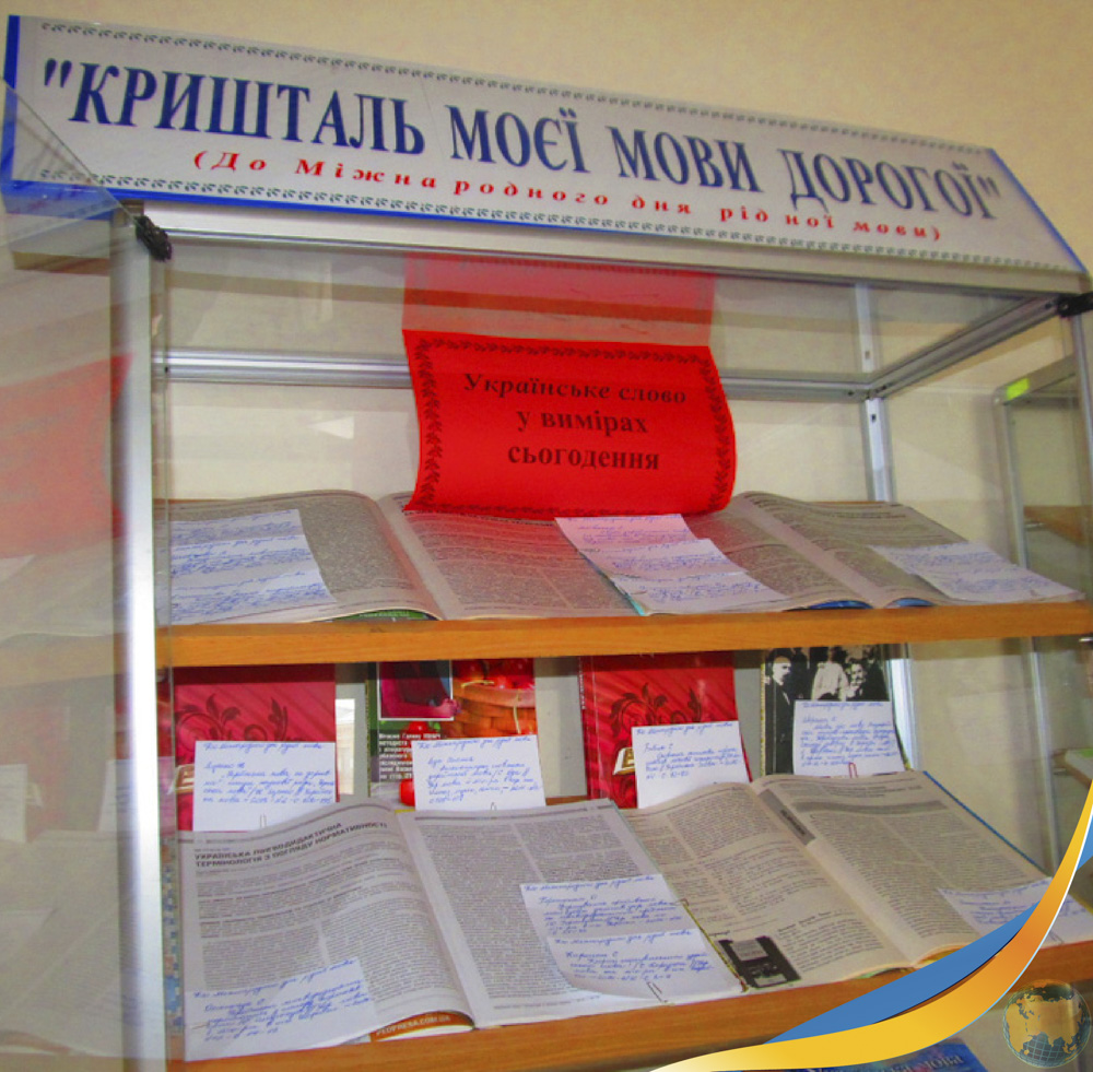 21 лютого відзначається Міжнародний день рідної мови. До цієї дати в читальному залі філологічних дисциплін експонується виставка «Кришталь моєї мови дорогої». Читачам пропонуються наукові дослідження та методичні розробки з питань сучасного мовного процесу. Сторінки матеріалів виставки висвітлюють запит українського суспільства до вивчення рідної мови. На виставку запрошуються викладачі, аспіранти, студенти та всі, кому не байдужа доля рідної мови.