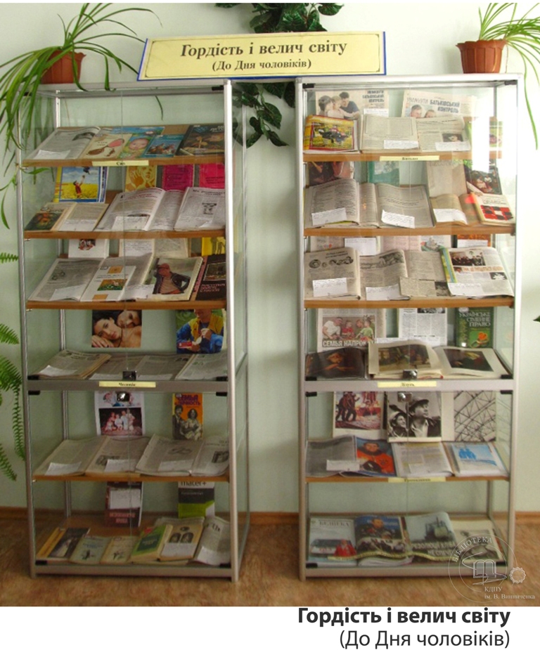 До Дня чоловіків бібліотекарі універсального читального залу підготували виставку під назвою «Гордість і велич світу», яка познайомить читачів з етапами життя нашої сильної половини: від народження і до зрілості. Спочатку приділена увага хлопчикам: їх фізіології, емоційному, фізичному і духовному благополуччю, особливостям виховання. У рубриках: «Чоловік», «Батько», «Громадянин» розкривають місце чоловіка в суспільстві, важливість їх ролі в сім’ї, у вихованні дітей.