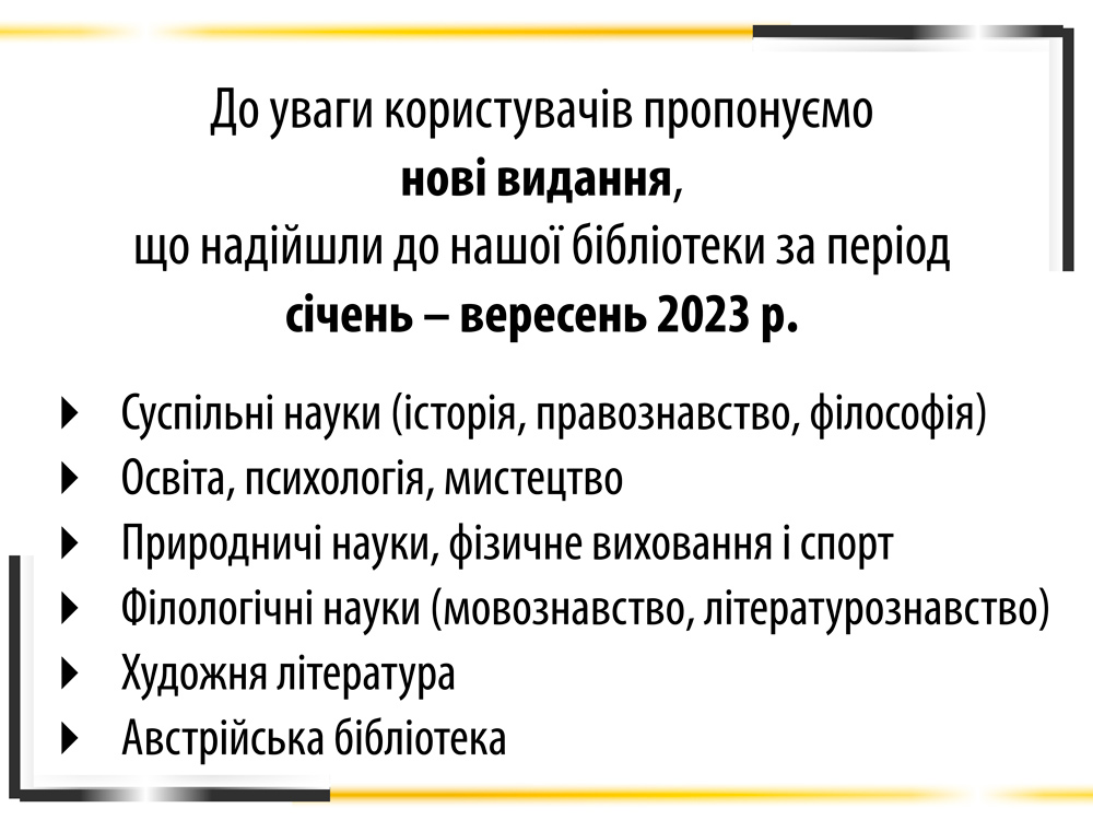 До уваги користувачів пропонуємо нові видання, що надійшли до нашої бібліотеки за період січень – вересень 2023 р. Тож запрошуємо відвідати бібліотеку, ознайомитися з новинками та обрати книги, які стануть Вам до вподоби.
