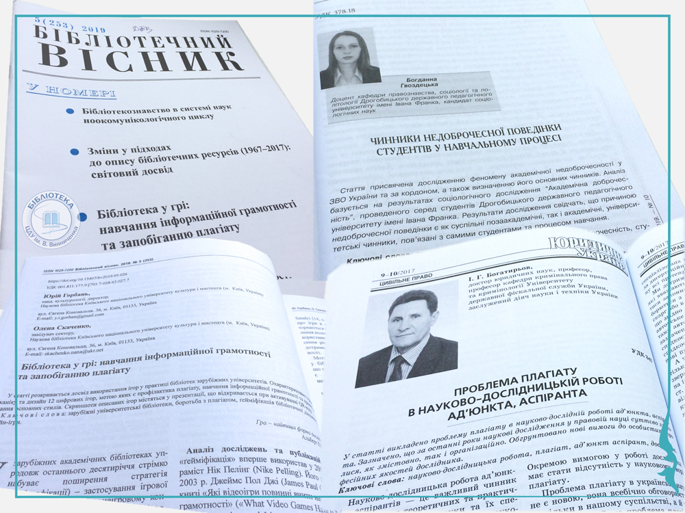Одним із напрямків діяльності сучасної бібліотеки є формування культури академічної доброчесності як складової інформаційної компетентності майбутніх спеціалістів. Згідно статті 42 Закону України «Про освіту»: «Академічна доброчесність – це сукупність етичних принципів та визначених законом правил, якими мають керуватися учасники освітнього процесу під час навчання, викладання та провадження наукової (творчої) діяльності з метою забезпечення довіри до результатів навчання та/або наукових (творчих) досягнень».