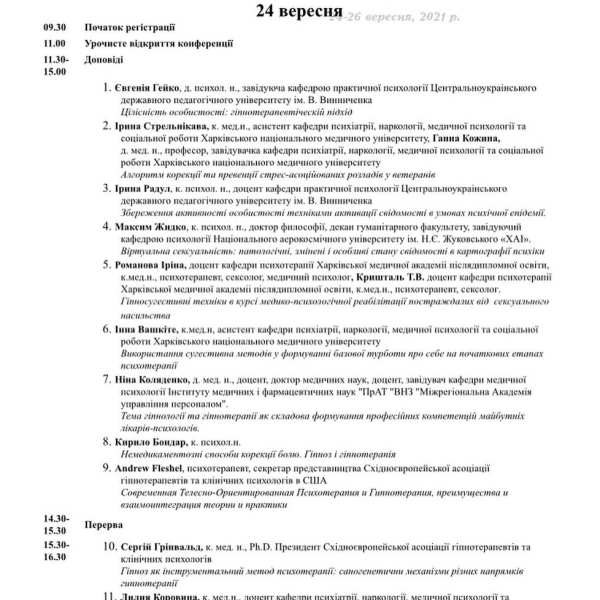 Кафедра психології ЦДПУ ім. В. Винниченка виступила співорганізатором Міжнародної науково-практичної конференції «Актуальні питання гіпнології та гіпнотерапії», яка відбулася 24–26 вересня 2021 року у м. Харкові.