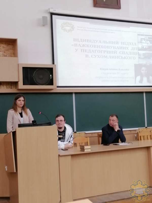 Також на пленарному засіданні виступили студентки 4 курсу, які навчаються за спеціальностями «Дошкільна освіта» та «Початкова освіта». Анна Горбунова представила доповідь на тему «Формування творчої особистості молодшого школяра у контексті ідей В. О. Сухомлинського» (Науковий керівник: доктор педагогічних наук, професор О.М. Ткаченко) та Альона Кириленко — доповідь на тему «Індивідуальний підхід до «важковиховуваних дітей» у спадщині В. Сухомлинського» (Науковий керівник: кандидат педагогічних наук, доцент Т.О. Прибора).