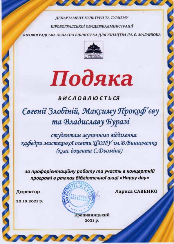 20 жовтня 2021 р., згідно з угодою про співробітництво та профорієнтаційну роботу факультету педагогіки, психології та мистецтв та Обласною бібліотекою для юнацтва імені Є. Маланюка, відбувся концерт за участі студентів та викладачів музичного відділення кафедри мистецької освіти ЦДПУ ім. В. Винниченка.