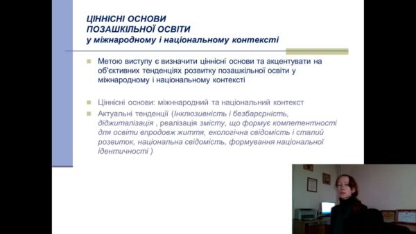 Різні аспекти формування ціннісних орієнтирів вихованців закладів позашкільної освіти були присвячені доповіді доктора педагогічних наук, професора кафедри педагогіки та менеджменту освіти Савченко Наталії Сергіївни та кандидата педагогічних наук, доцента кафедри педагогіки та менеджменту освіти Дубінки Миколи Михайловича.
