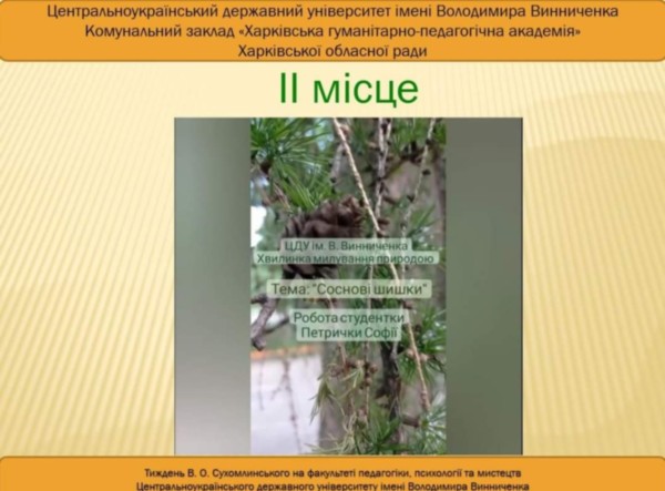 Протягом квітня-вересня 2023 р. студенти під керівництвом доцентів Кузнєцової О. В., Одарченко В. І., Прибори Т. О. готували індивідуальні та групові проєкти на тему «Хвилинки милування природою», в основу яких були покладені ідеї В.Сухомлинського.