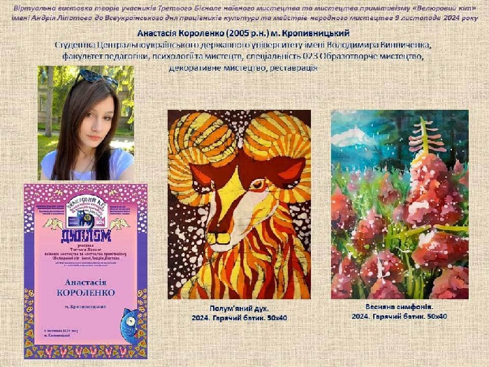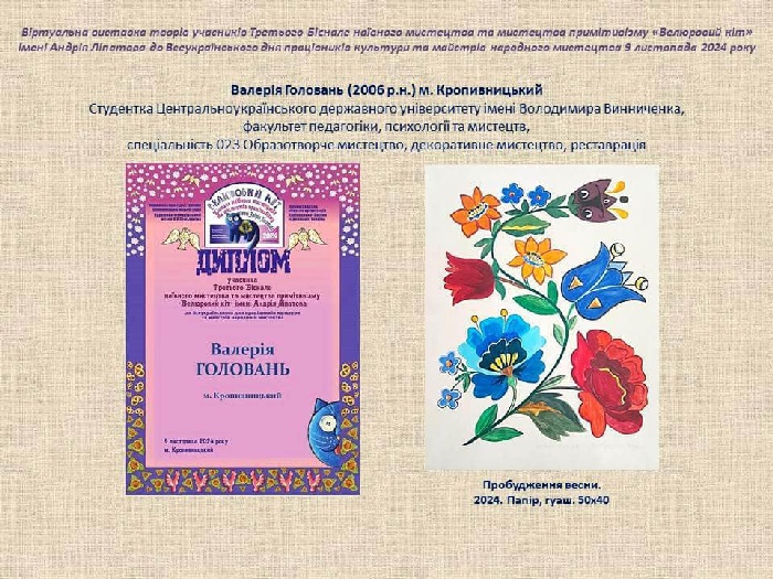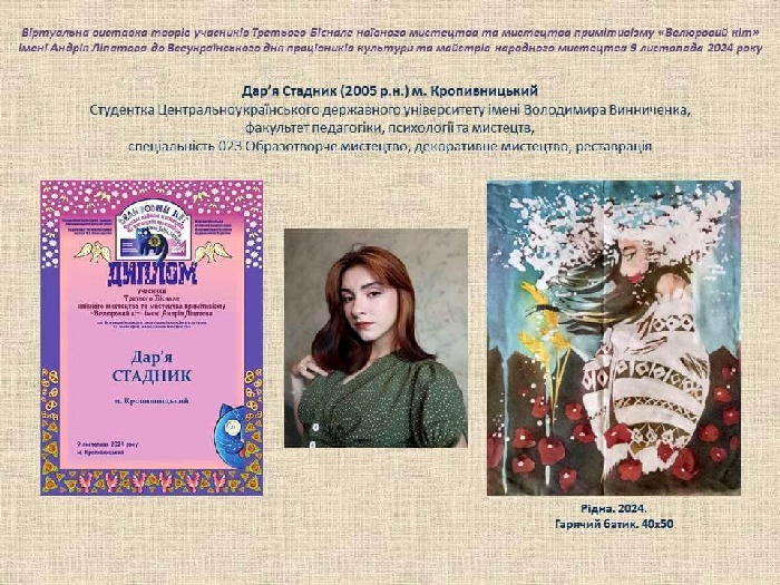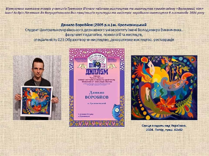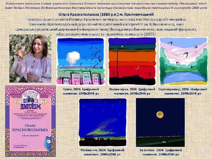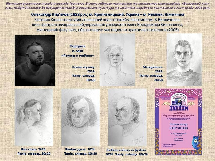 Фото робіт учасників можна переглянути на сайті організатора http://osmerkinmuseum.kr.ua/hmus/bien2024/b2024.html