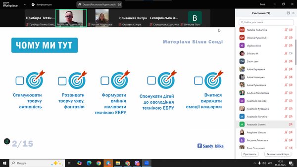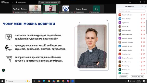 11 березня 2025 року в межах діяльності гуртків зв спеціальностей 012 Дошкільна освіта, 013 Початкова освіта студентським науковим товариством «Від гри – до науки» кафедри дошкільної освіти Маріупольського державного університету був проведений на вебінар на тему: «Сучасні презентації в освіті: основи, тренди, інструменти». Модератором була доктор педагогічних наук, професор Крутій Катерина Леонідівна. Лектор – викладач кафедри освітології і педагогіки Західноукраїнського національного університету Ростислав Руденський.