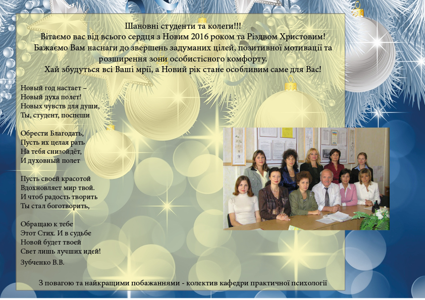 Шановні студенти та колеги!!! Вітаємо вас від всього сердця з Новим 2016 роком та Різдвом Христовим! Бажаємо Вам наснаги до звершень задуманих цілей, позитивної мотивації та розширення зони особистісного комфорту.
