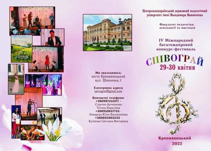 28–30 квітня 2022 року на базі факультету педагогіки, психології та мистецтв Центральноукраїнського державного педагогічного університету імені Володимира Винниченка за підтримки ректора університету професора Євгена Соболя, декана факультету педагогіки, психології та мистецтв, професора Ярослава Галети, завідувачки кафедри мистецької освіти, доцента Тетяни Стрітьєвич та координатора проєкту професора Тетяни Стратан-Артишкової відбувся IV Міжнародний багатожанровий конкурс-фестиваль «Співограй».