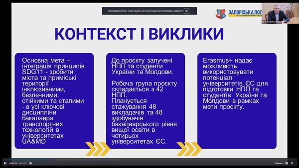 - Олексій Кузькін, декан транспортного факультету НУ «Запорізька політехніка» – презентація проєкту «ISDEGO Erasmus+ KA2»;