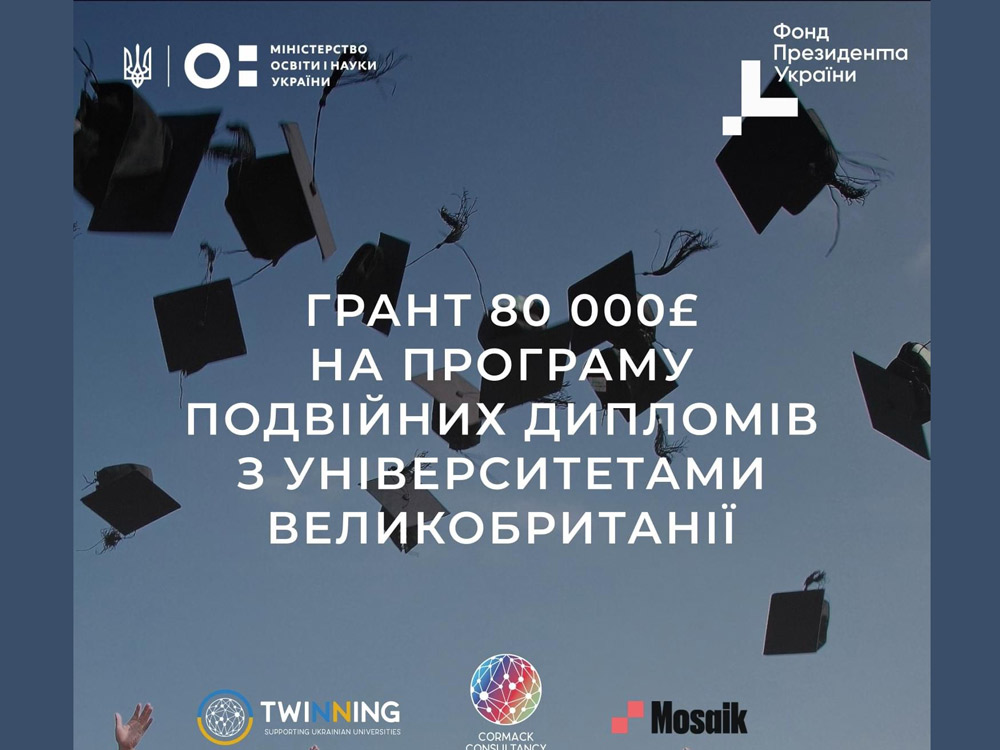 За підтримки Міністерства освіти і науки України, Фонду Президента України, Cormack Consultancy та Mosaik Education раді оголосити конкурс на грант у розмірі 80,000£ для створення програми подвійних дипломів магістрів між українськими і британськими університетами!