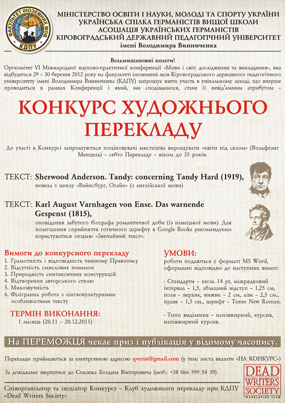 Співорганізатор та ініціатор Конкурсу – Клуб художнього перекладу при КДПУ «Dead Writers Society»