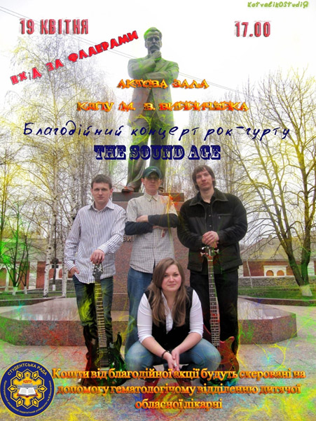Рок-гурт КДПУ ім. В. Винниченка «The Sound Age» представить всім бажаючим свій репертуар аби допомогти гематологічному відділенню дитячої обласної лікарні. Концерт відбудеться за підтримки студентської ради, профспілкової організації студентів та ректорату університету. Гість концерту - команда КВК «Наивность»...