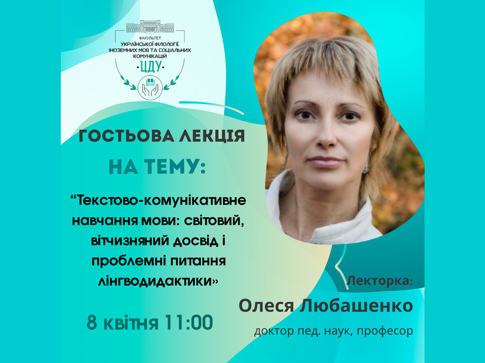У понеділок, 8 квітня, доктор педагогічних наук, професор кафедри методики викладання української та іноземних мов і літератур КНУ імені Тараса Шевченка Олеся Вадимівна Любашенко прочитає гостьову онлайн-лекцію для студентів факультету української філології, іноземних мов та соціальних комунікацій ЦДУ імені Володимира Винниченка.