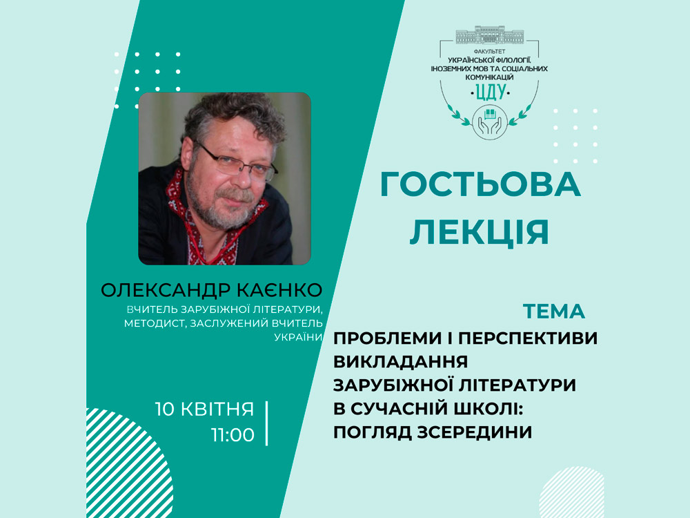 10 квітня об 11 годині учитель зарубіжної літератури Новоукраїнського ліцею «Лідер» Новоукраїнської міської ради Кіровоградської області, учитель-методист, переможець конкурсу "Учитель року – 2001" у номінації "Зарубіжна література", Заслужений вчитель України Олександр Каєнко прочитає лекцію для студентів факультету української філології та іноземних мов та соціальних комунікацій, майбутніх вчителів української мови та літератури, іноземних мов та зарубіжної літератури.