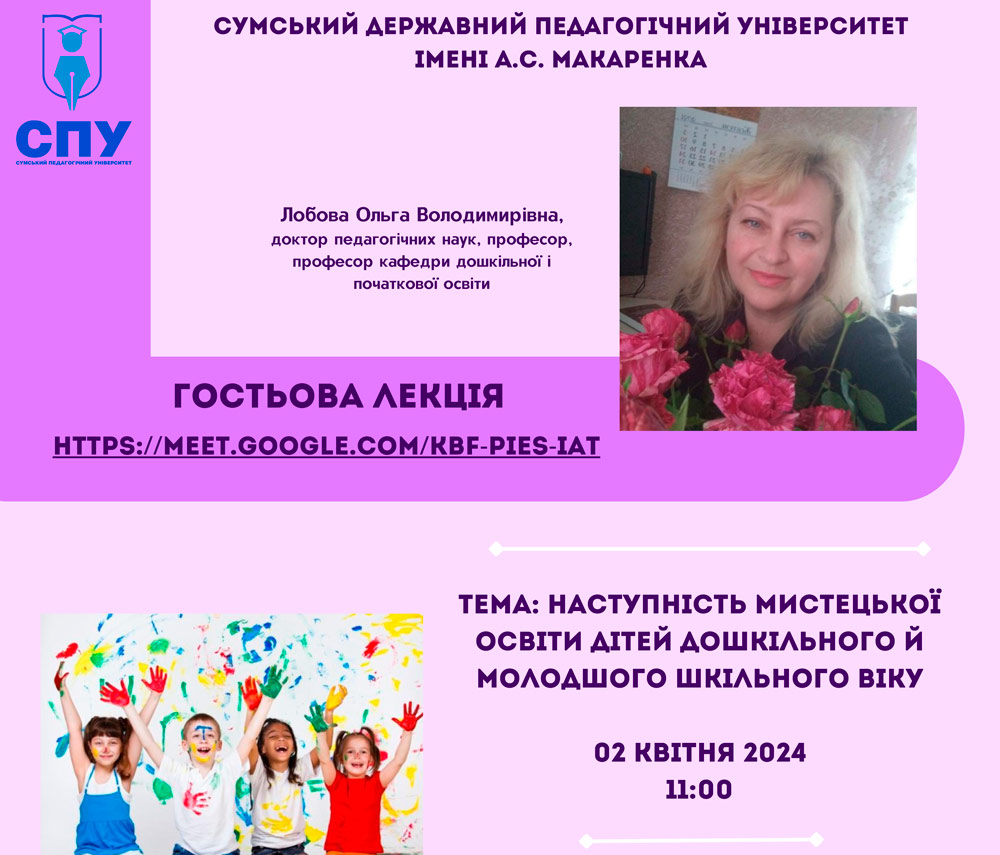 У вівторок 02 квітня 2024 року для студентів спеціальності 012 "Дошкільна освіта" відбудеться гостьова лекція доктора педагогічних наук, професора кафедри дошкільної та початкової освіти Сумського державного педагогічного